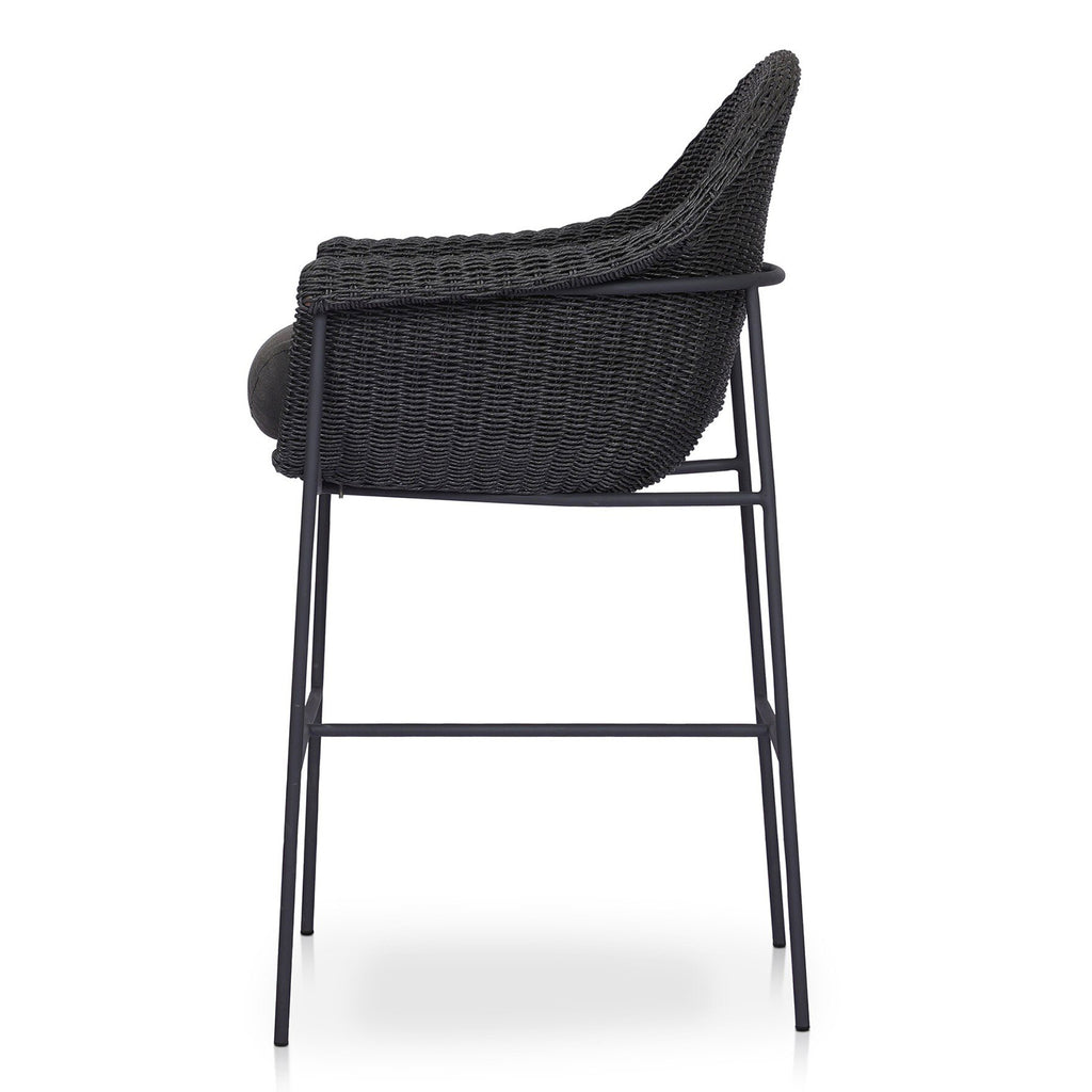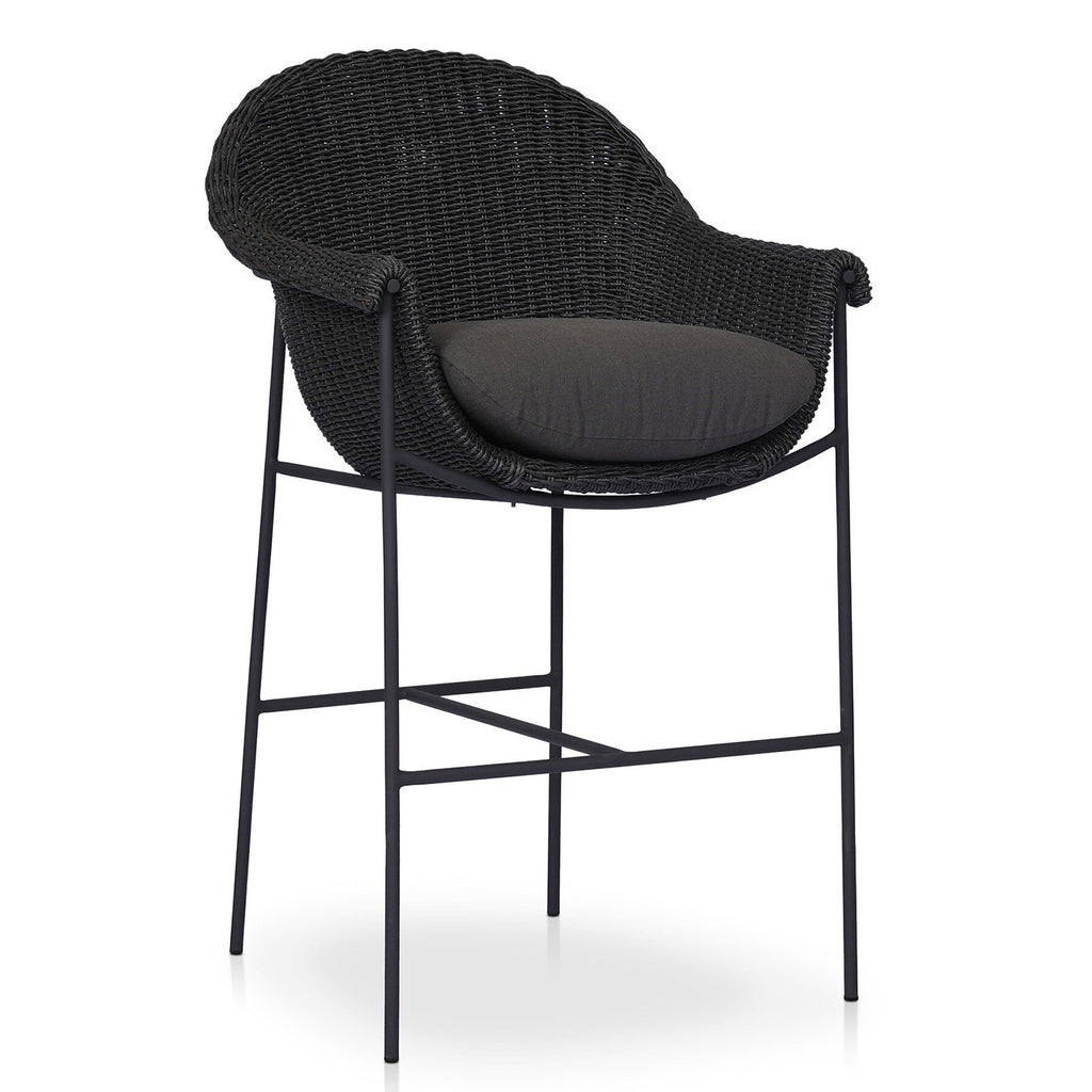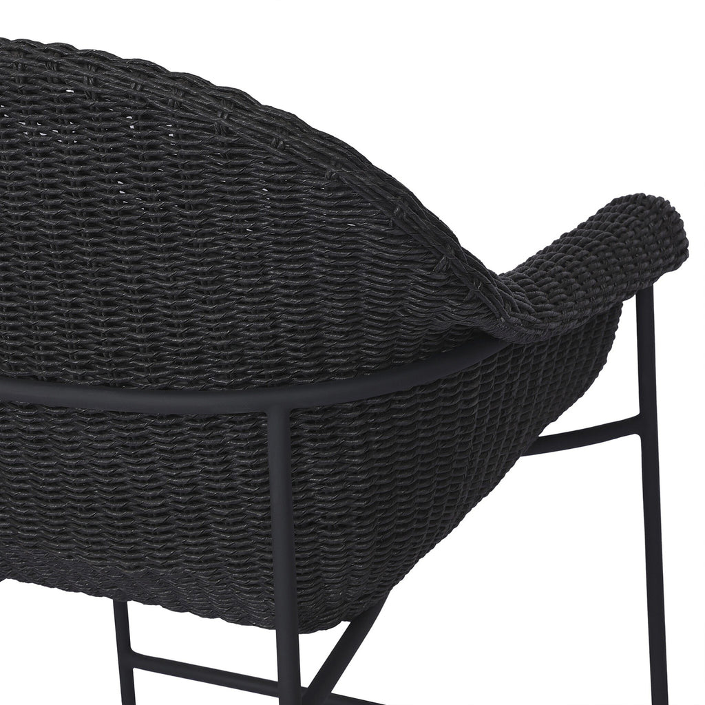 With a curvy silhouette and classic rolled arms, a woven frame brings modern sensibility to this vintage-inspired outdoor bar stool, with an airy iron cradle base for a beautiful balance of scale. Paired with a fully upholstered cushion for a comfortable sit. Cover or store indoors during inclement weather and when not in use.