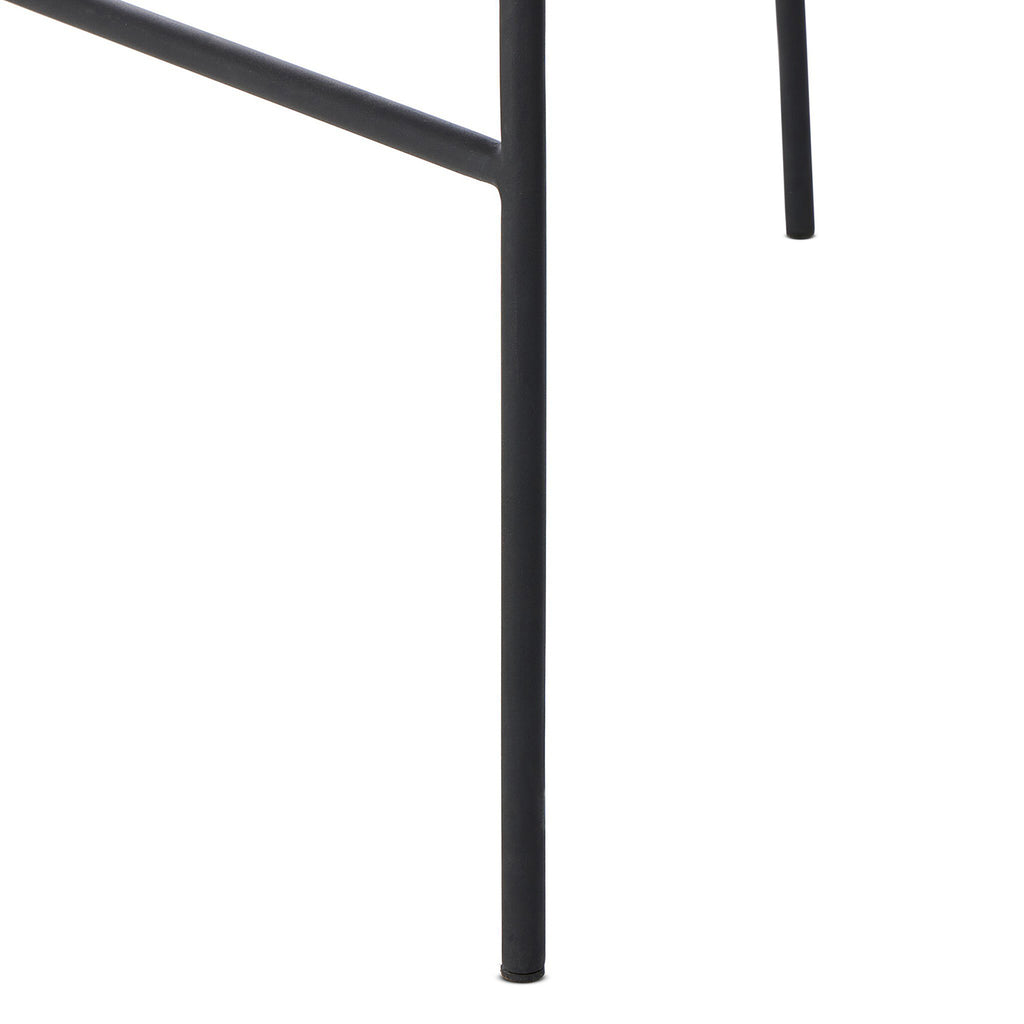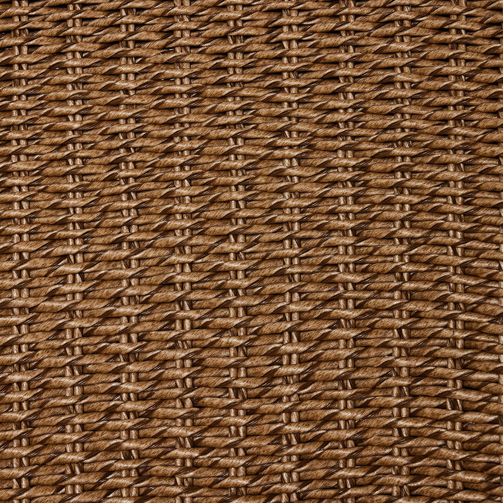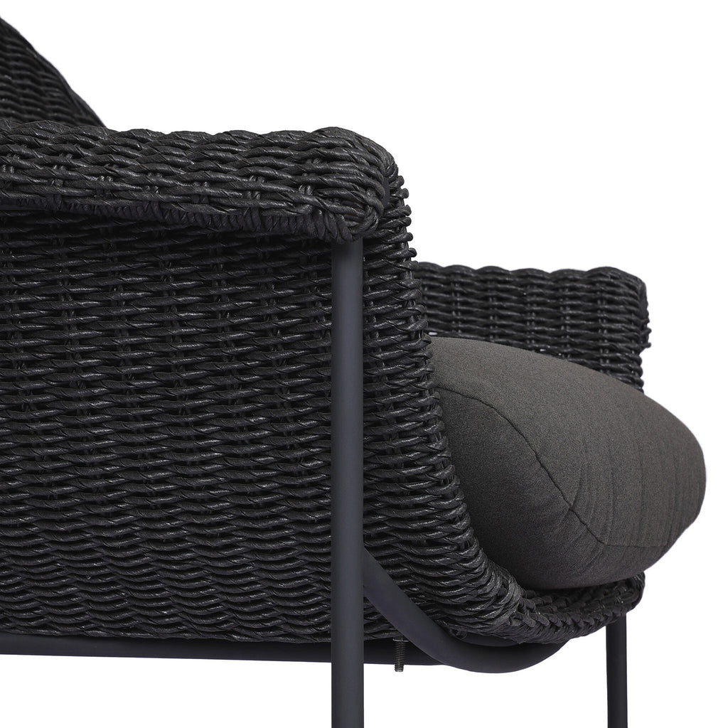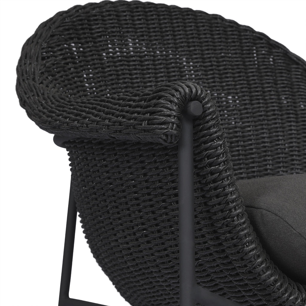 With a curvy silhouette and classic rolled arms, a woven frame brings modern sensibility to this vintage-inspired outdoor bar stool, with an airy iron cradle base for a beautiful balance of scale. Paired with a fully upholstered cushion for a comfortable sit. Cover or store indoors during inclement weather and when not in use.
