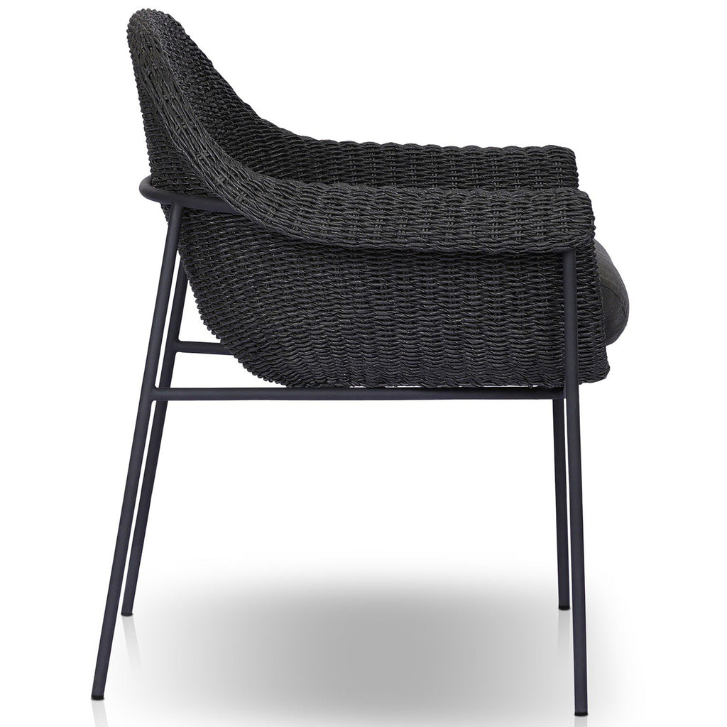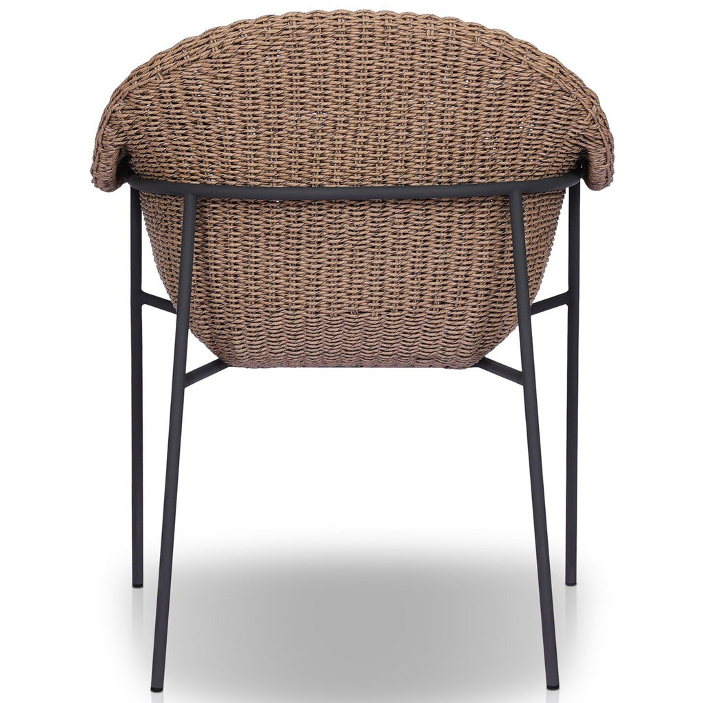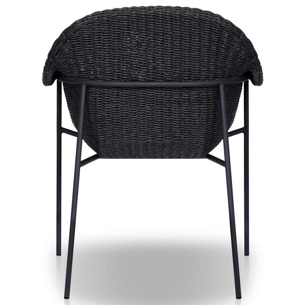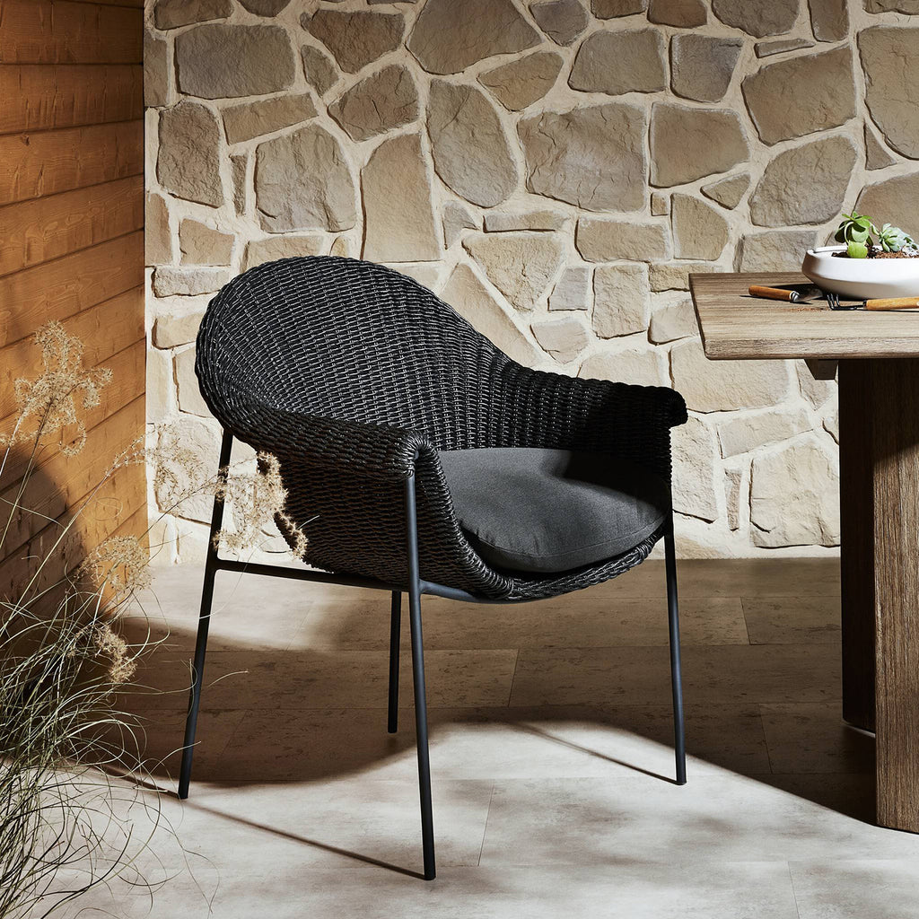 With a curvy silhouette and classic rolled arms, a woven frame brings modern sensibility to this vintage-inspired outdoor dining chair, with an airy iron cradle base for a beautiful balance of scale. Paired with a fully upholstered cushion for a comfortable sit. Cover or store indoors during inclement weather and when not in use.