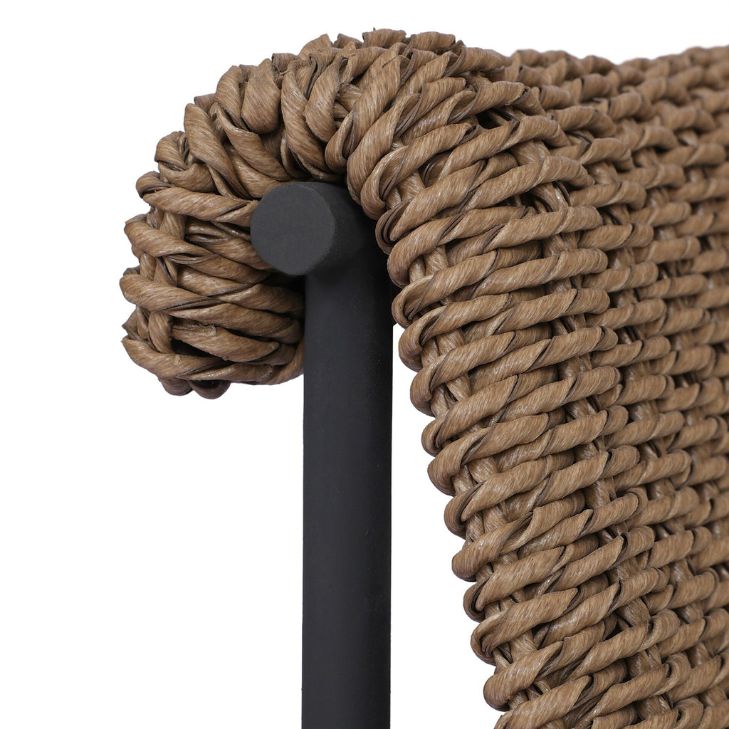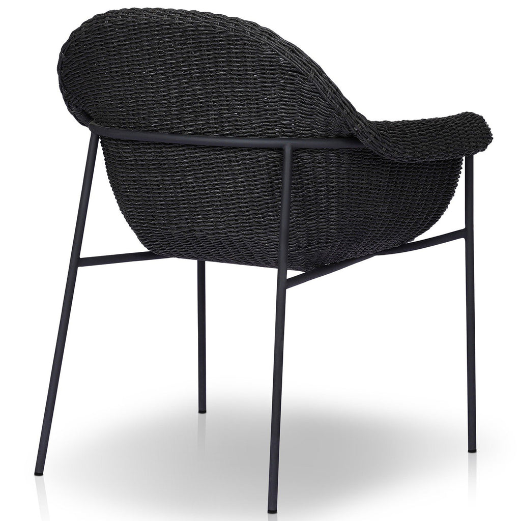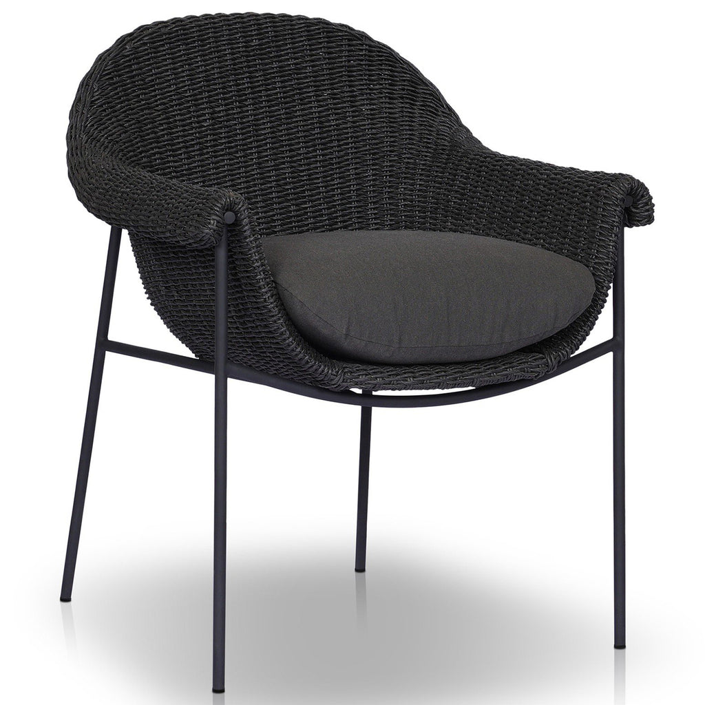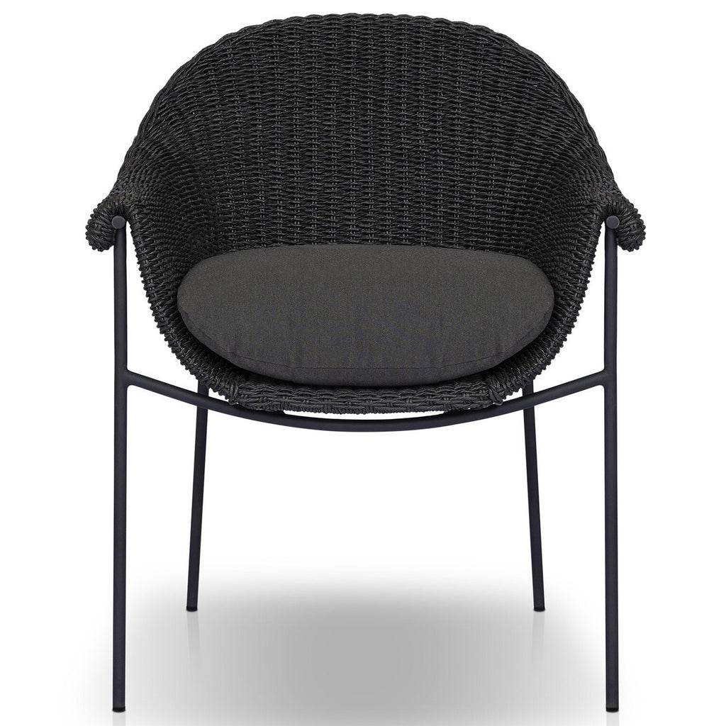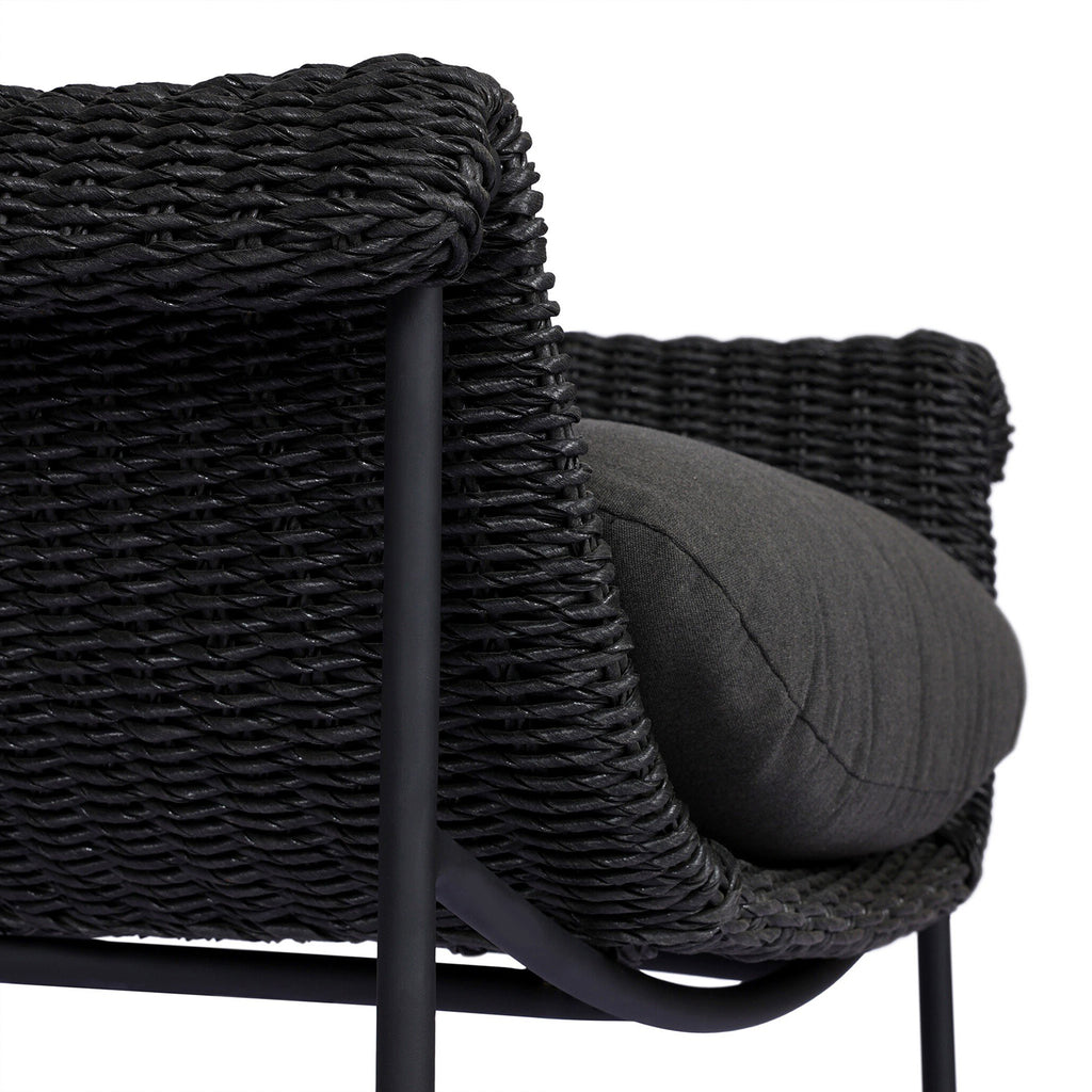 With a curvy silhouette and classic rolled arms, a woven frame brings modern sensibility to this vintage-inspired outdoor dining chair, with an airy iron cradle base for a beautiful balance of scale. Paired with a fully upholstered cushion for a comfortable sit. Cover or store indoors during inclement weather and when not in use.