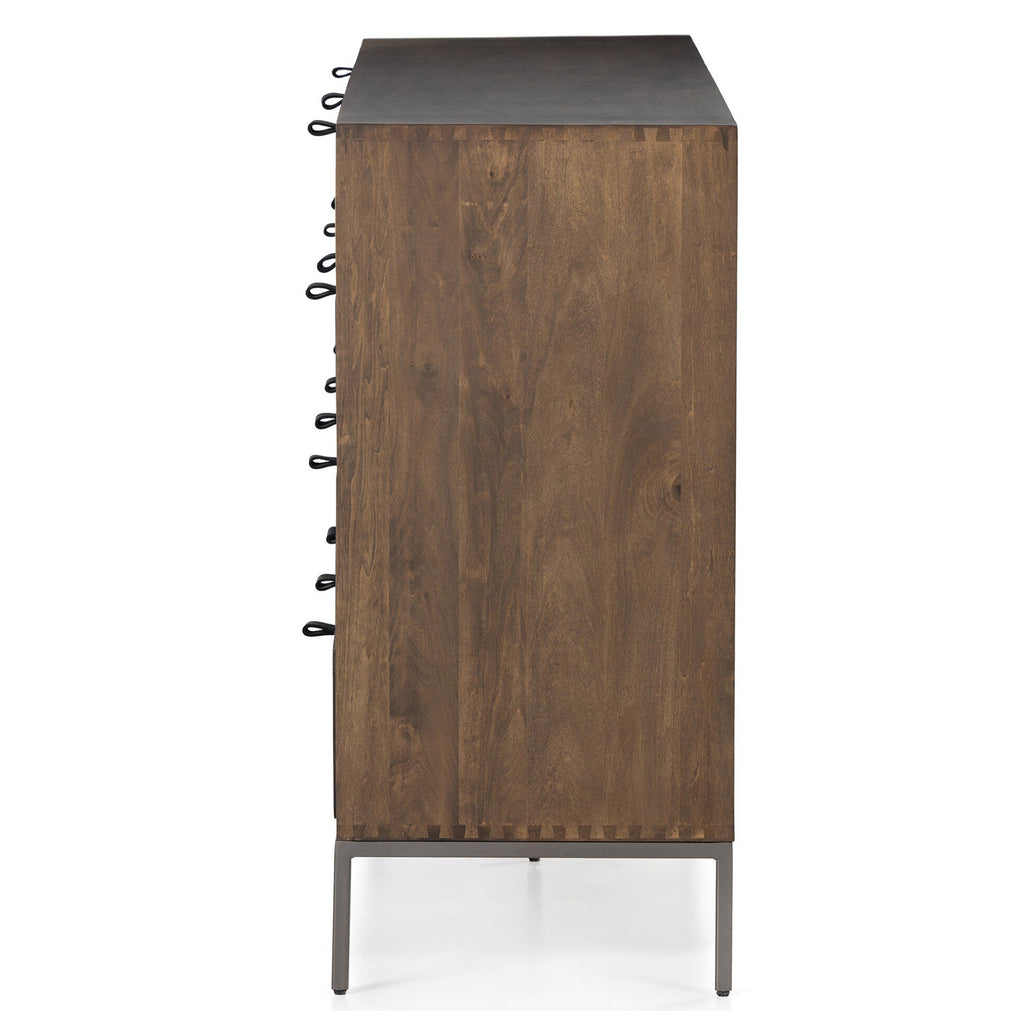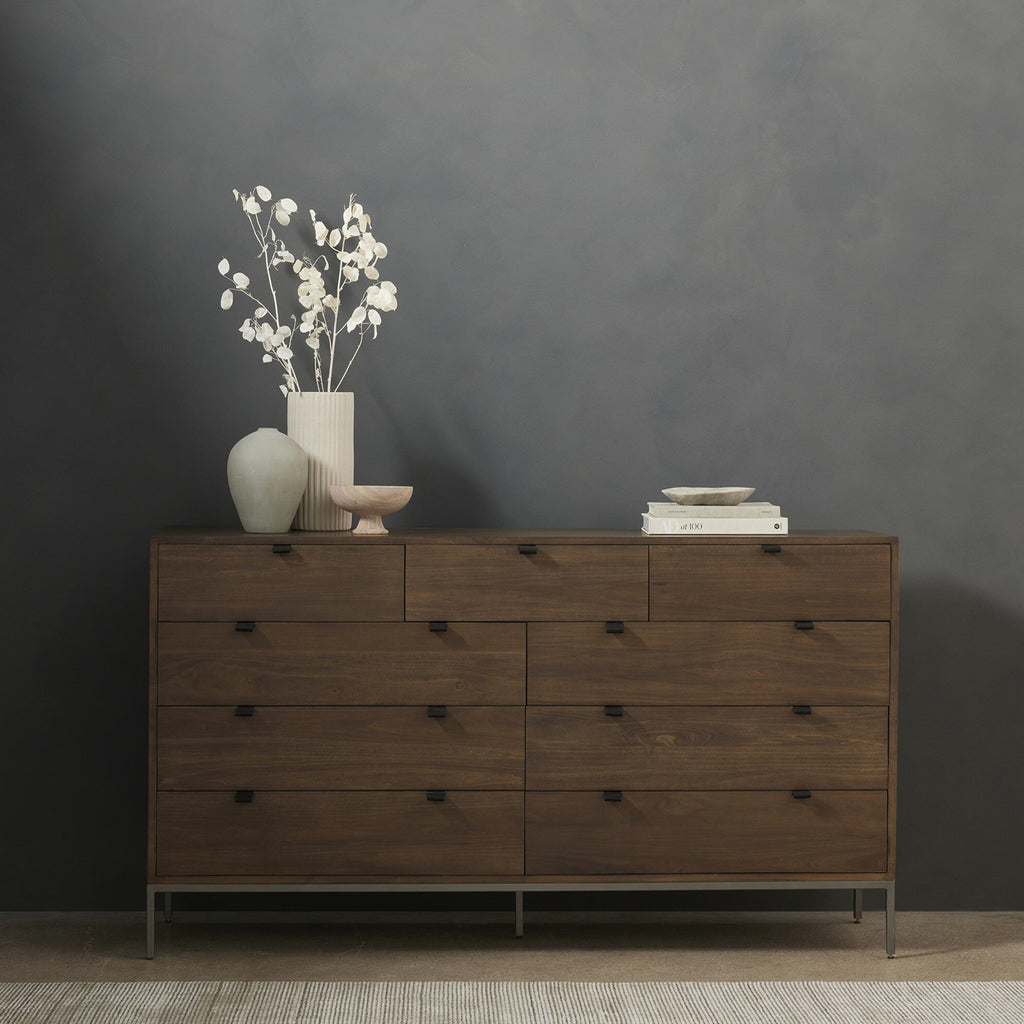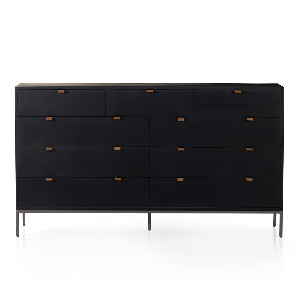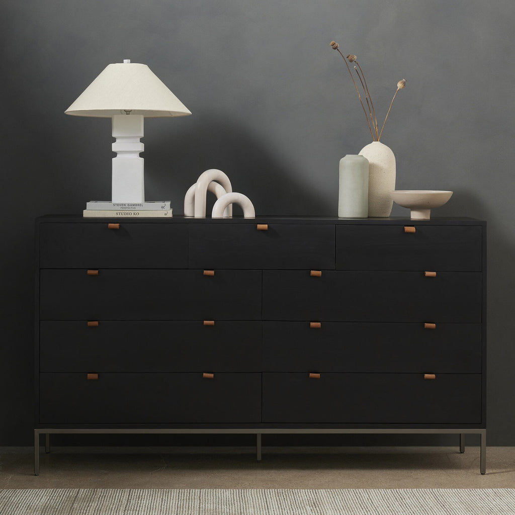 Inspired by clean midcentury design, a stylish dresser of black-washed poplar offers plenty of bedroom storage space thanks to nine spacious drawers. Metal-secured leather pulls add a textural element of surprise.