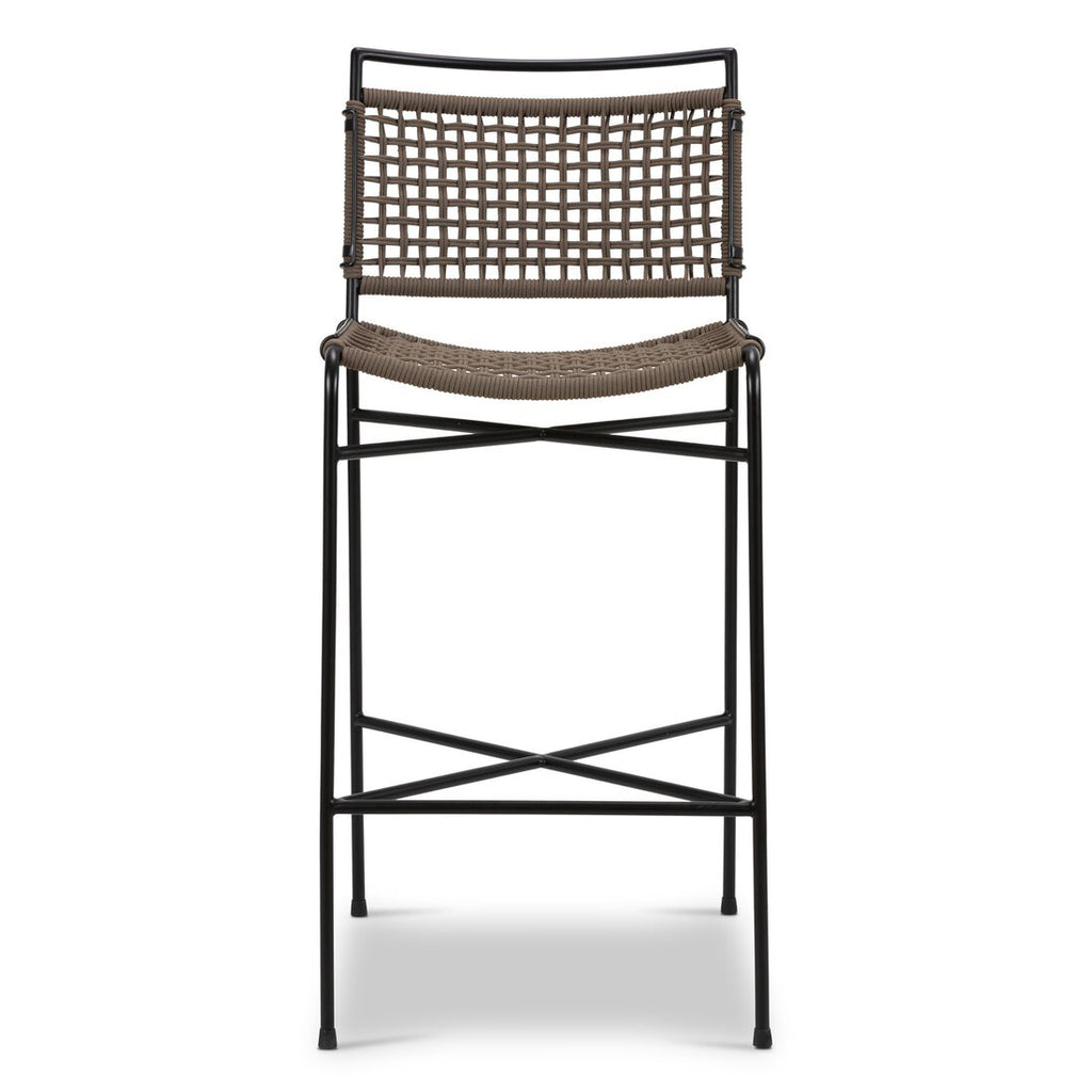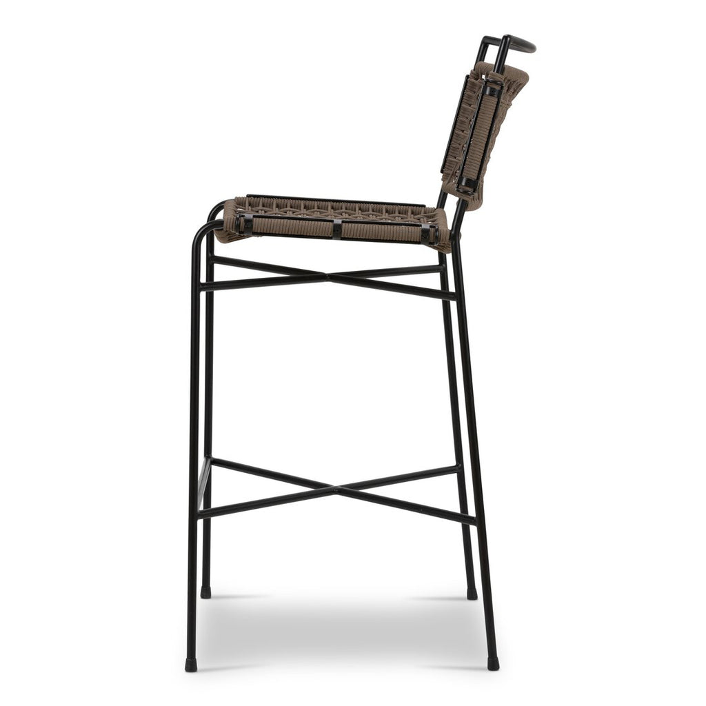 Slim lines and mixed materials combine in this outdoor bar stool. Two-toned woven rope detailing form a sling-style seat and back, accented by iron framing. Cover or store indoors during inclement weather and when not in use.