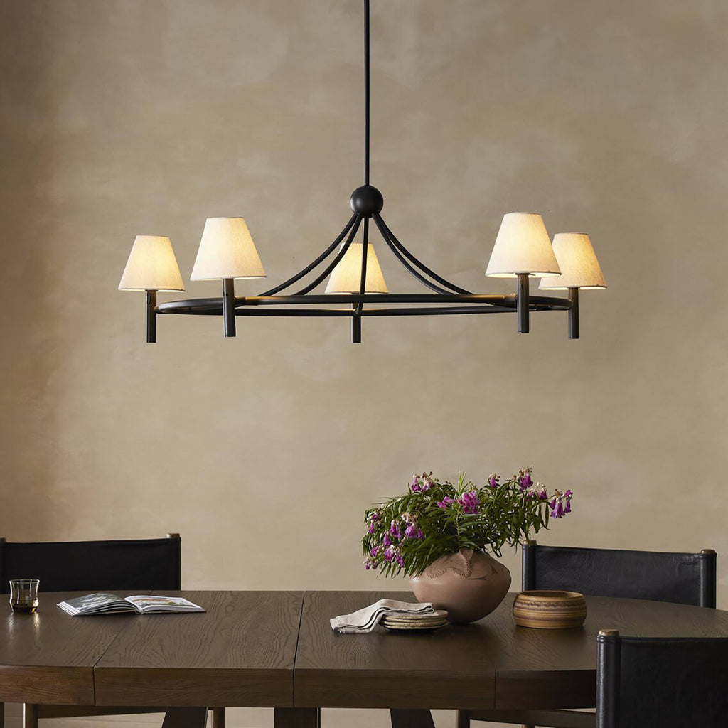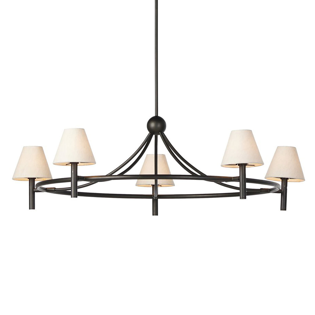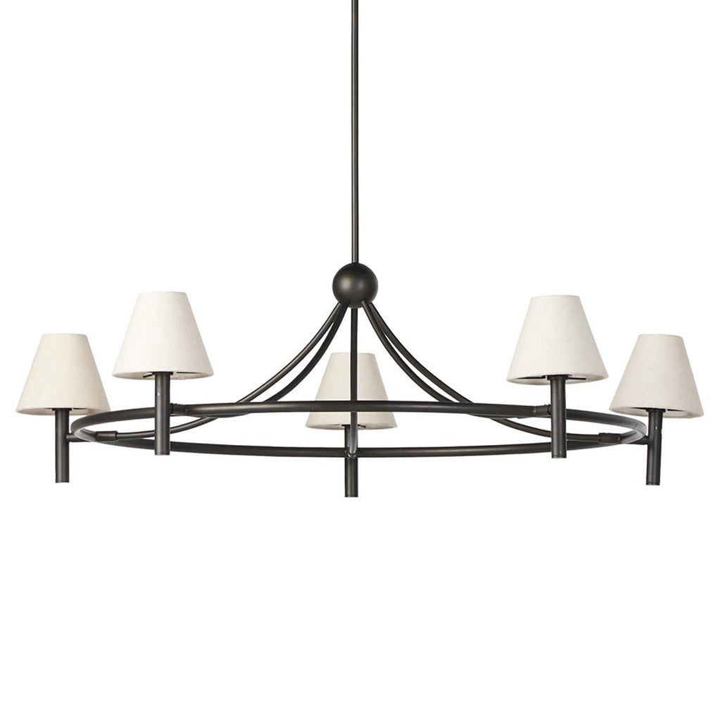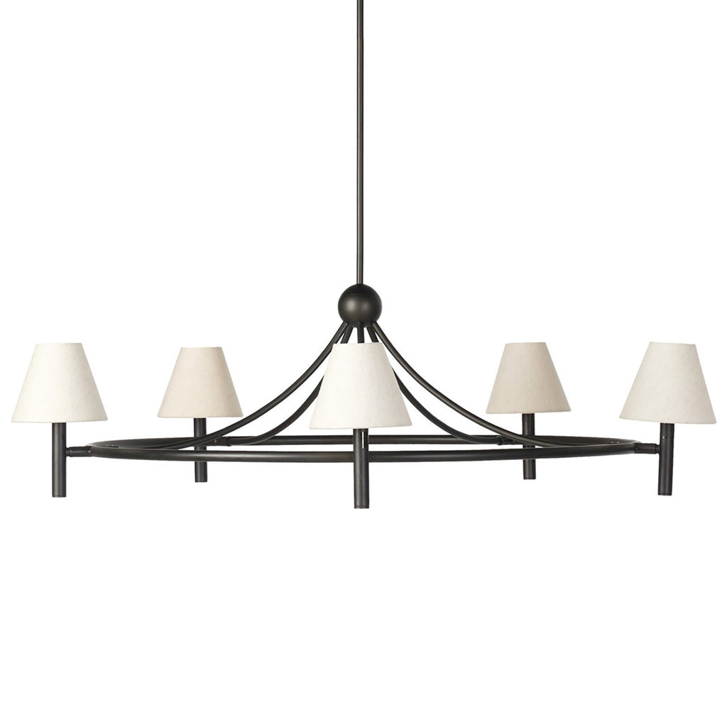With a slim, graceful silhouette inspired by traditional French design, a bronzed iron chandelier features five candlestick-style arms, topped by linen shades in a cream-colored linen. Double hooks at the top of piping allow for more hanging options, including slanted ceilings.