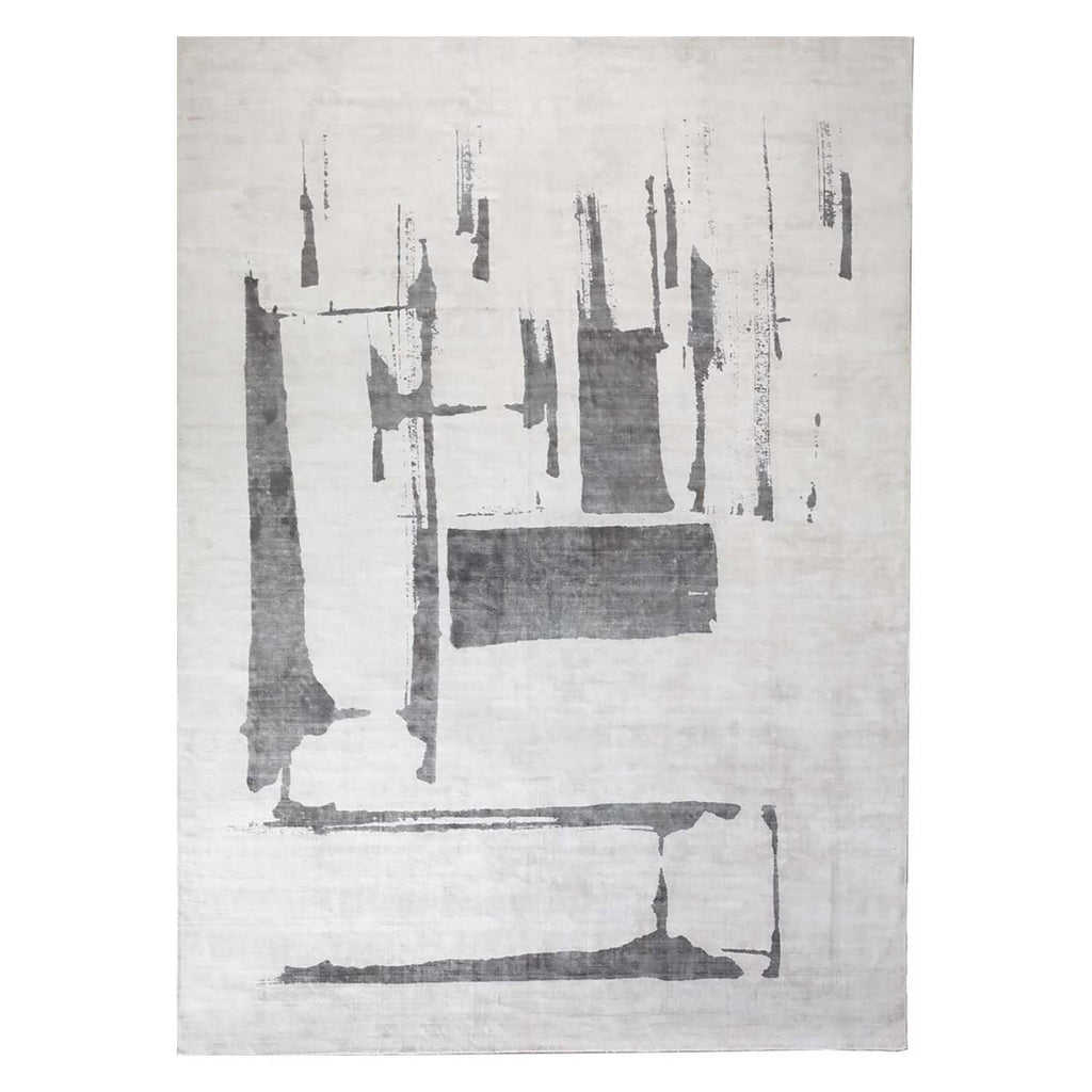 This beautiful, hand-loomed, bamboo-silk rug depicts a contemporary and graphic abstract motif, originally painted by the designers in Chinese ink, inspired by urban architecture.
