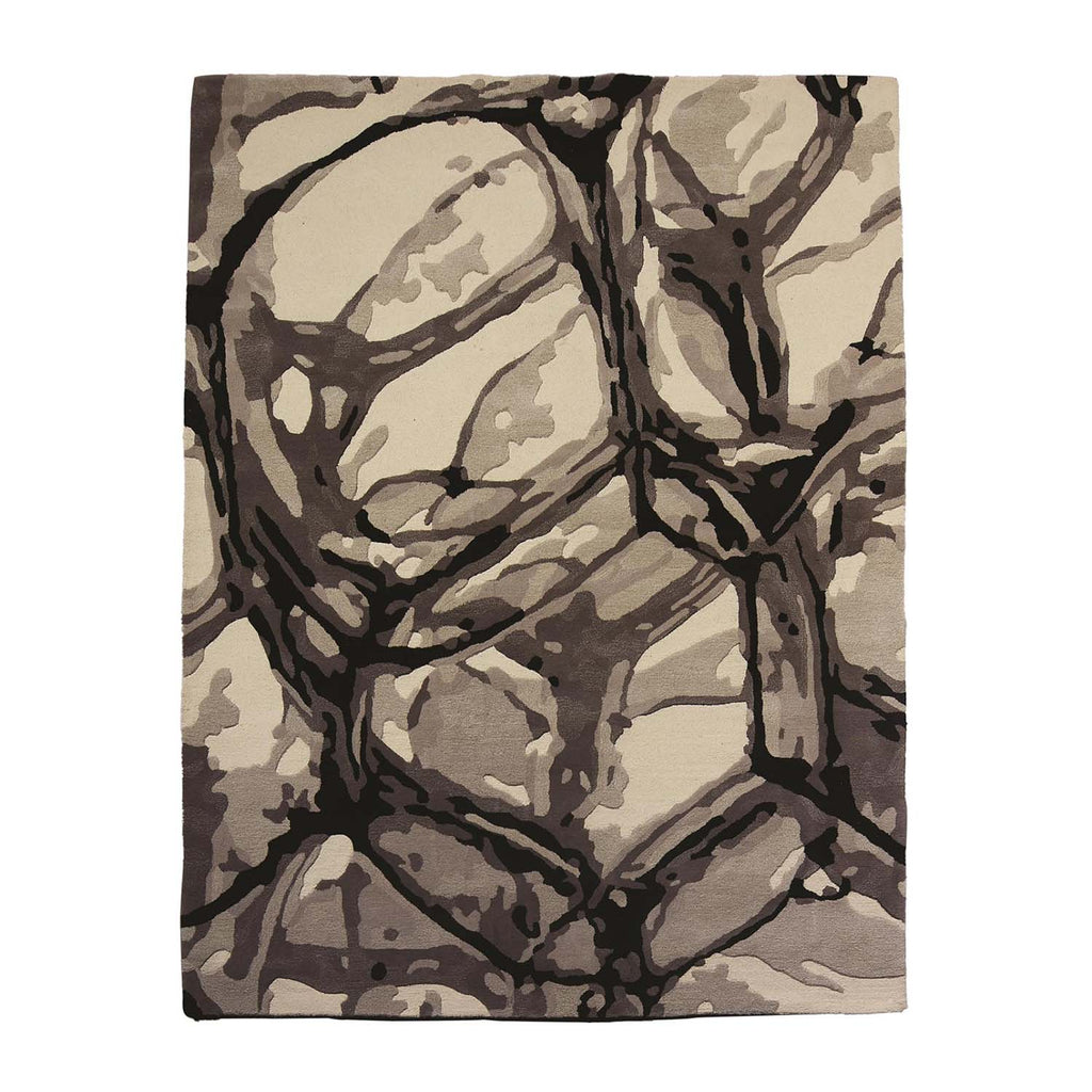 Neutral shades of ivory, black, and gray combine in an abstract pattern, creating a beautiful, almost watercolor-like visual effect. Hand-tufted and made of 100% wool with a 100% cotton backing.
