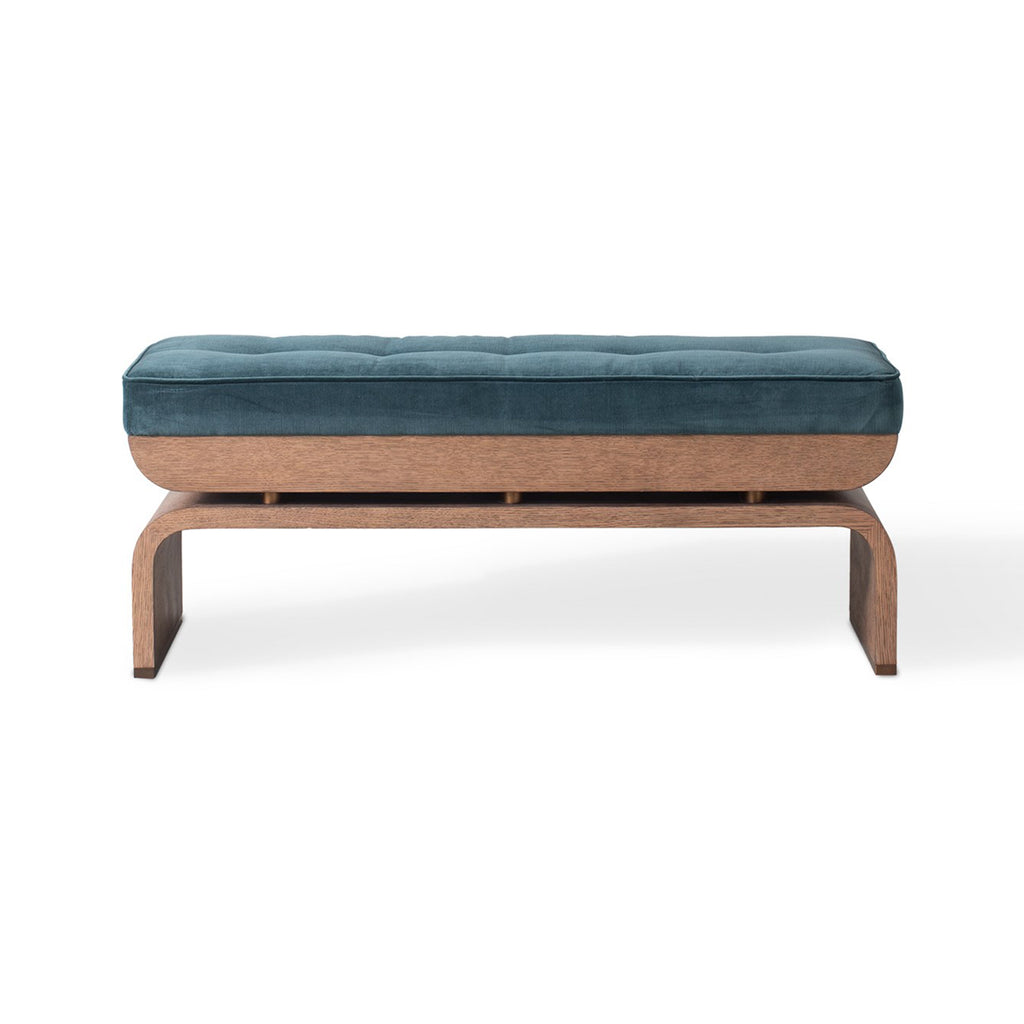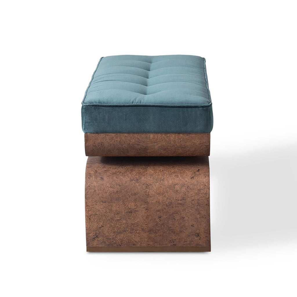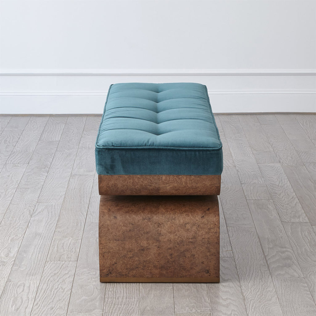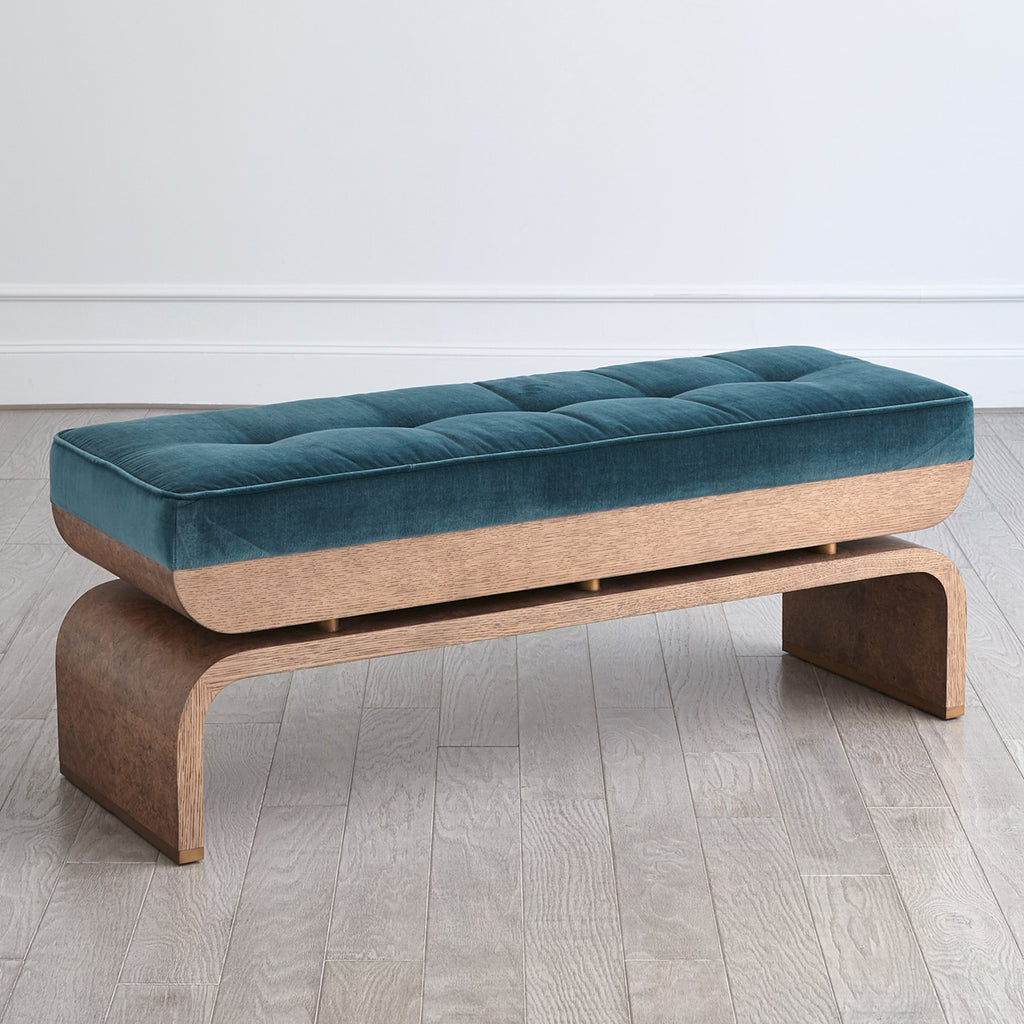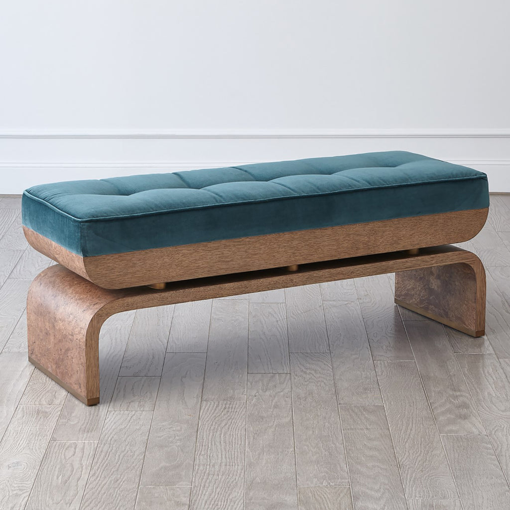 The Global Views Ives Bench was inspired by the veneered waterfall collections of the Art Deco period streamlined into contemporary silhouettes. Constructed of burled and straight grain oak veneers, stainless steel with a bronze finish and rich cotton velvet fabric.