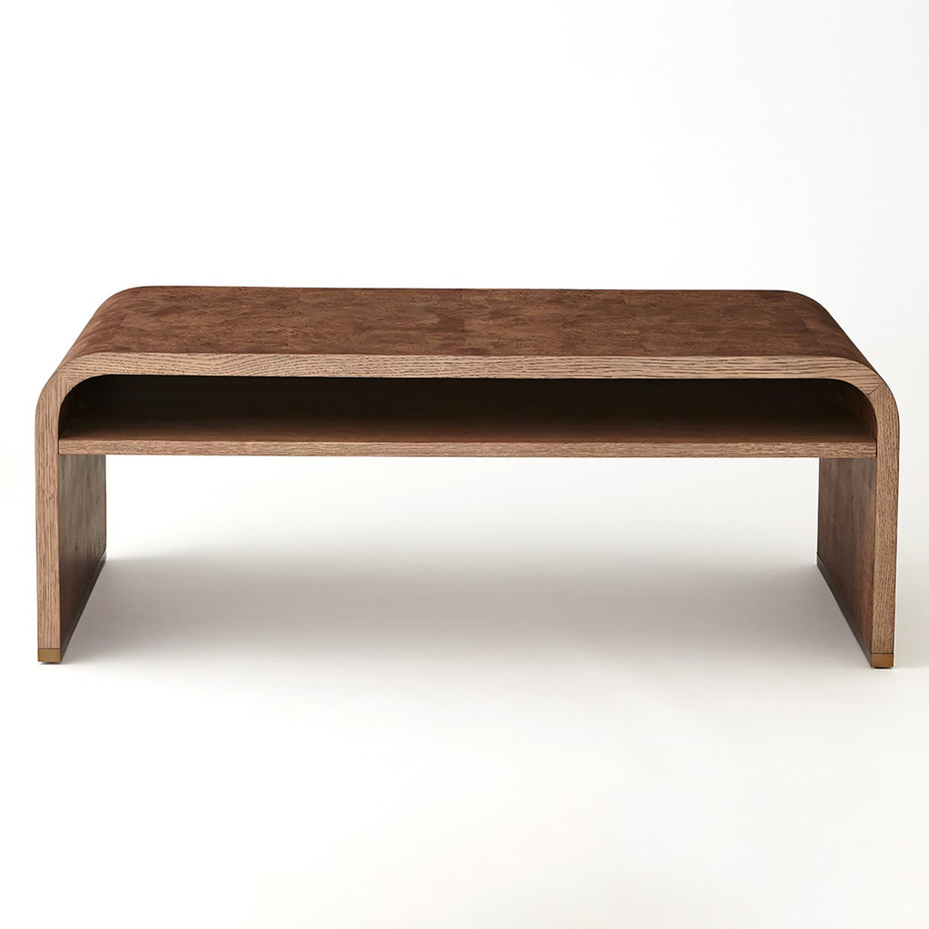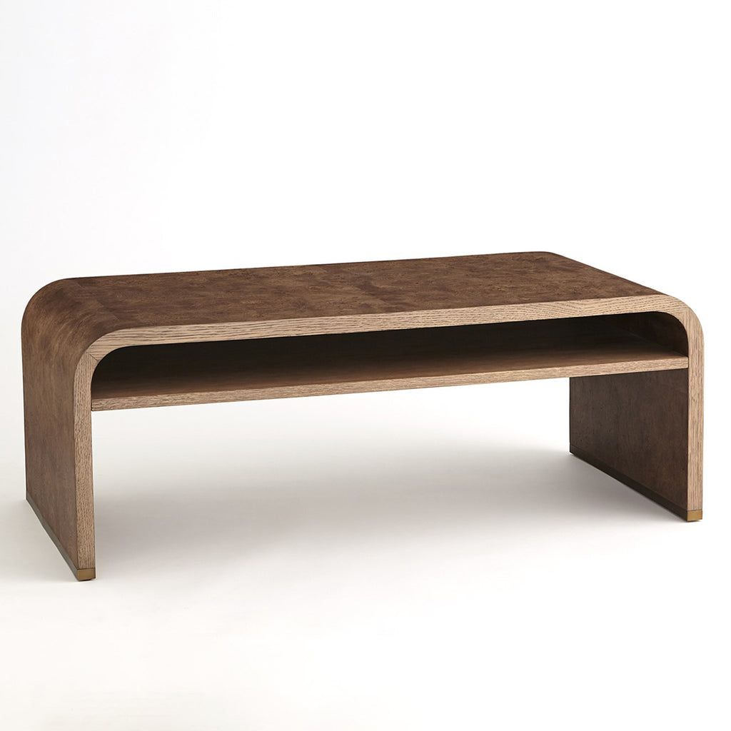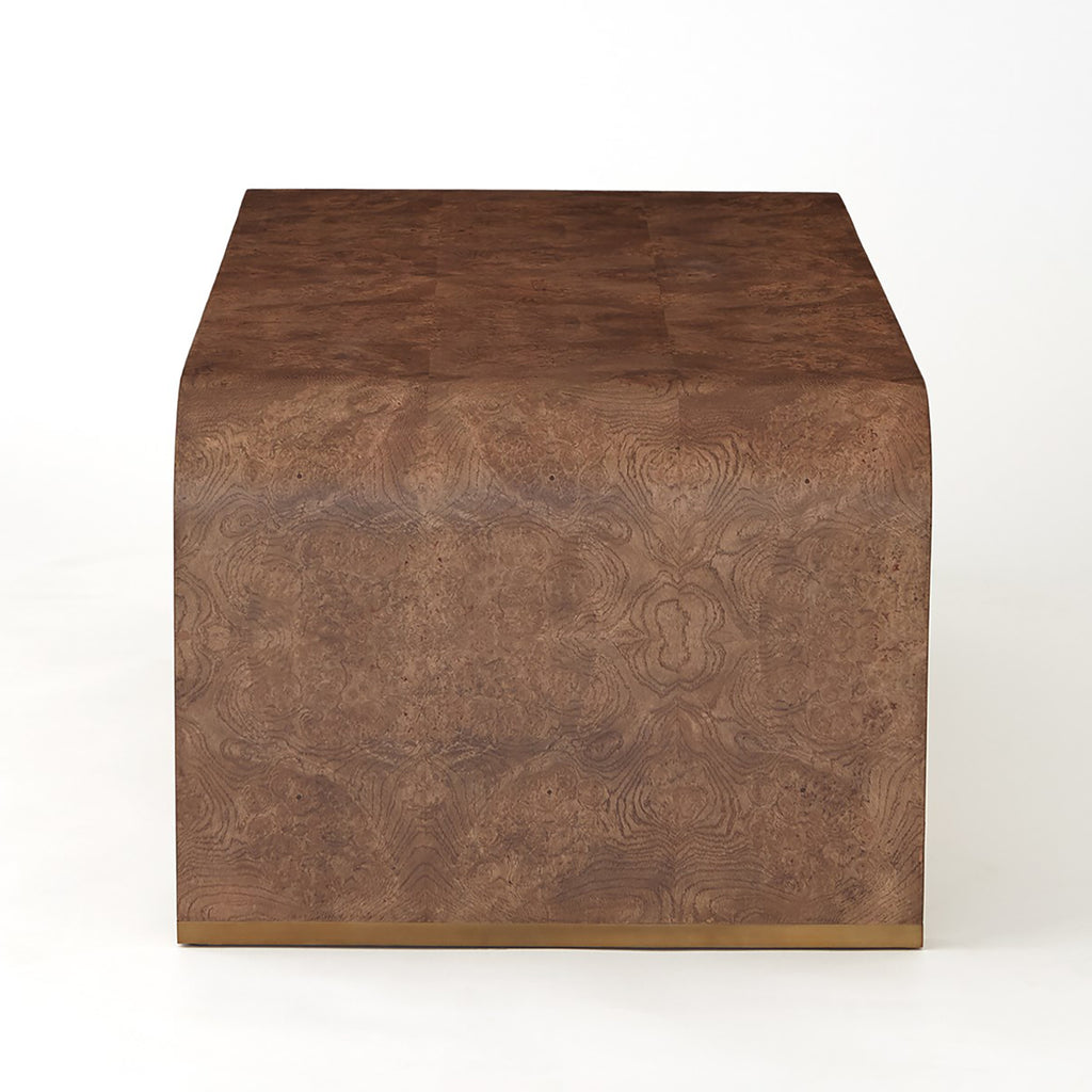 The Global Views Ives Collection was inspired by the veneered waterfall collections of the Art Deco period streamlined into contemporary silhouettes. Constructed of burled and straight grain oak veneers and stainless steel with a bronze finish.