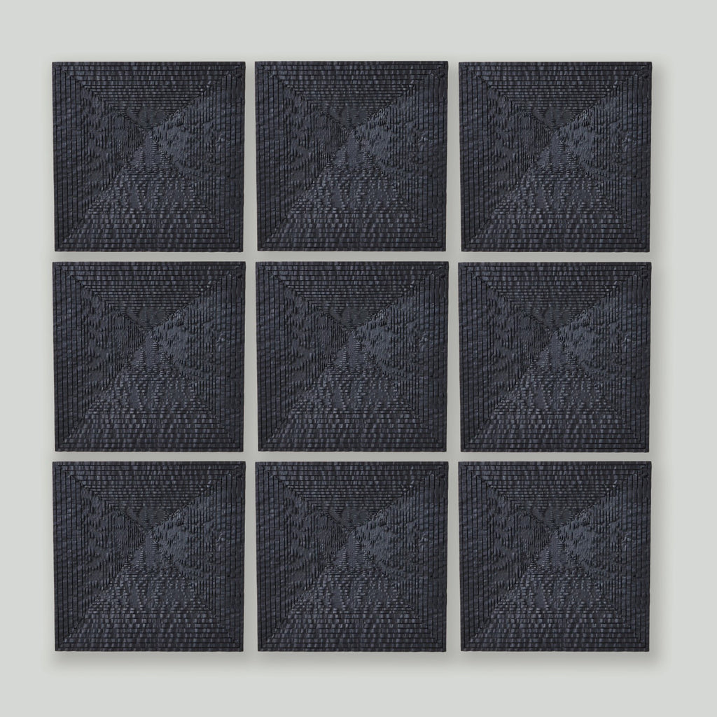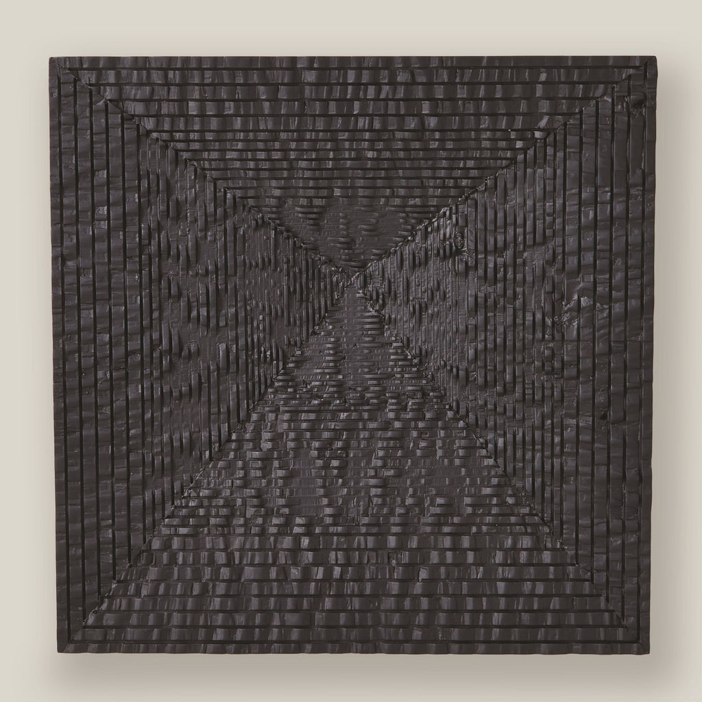 This painstaking carving process is aimed to show a different side of the natural beauty and texture of wood that is not usually seen on plain surfaces. The peaks and valleys created convey an abstract texture that is organic and sculptural in form. Painted in black, the texture mimics that of delicate charcoal with none of its instability. Constructed of Gmelina wood, a cousin to Beechwood. Matte black finish.