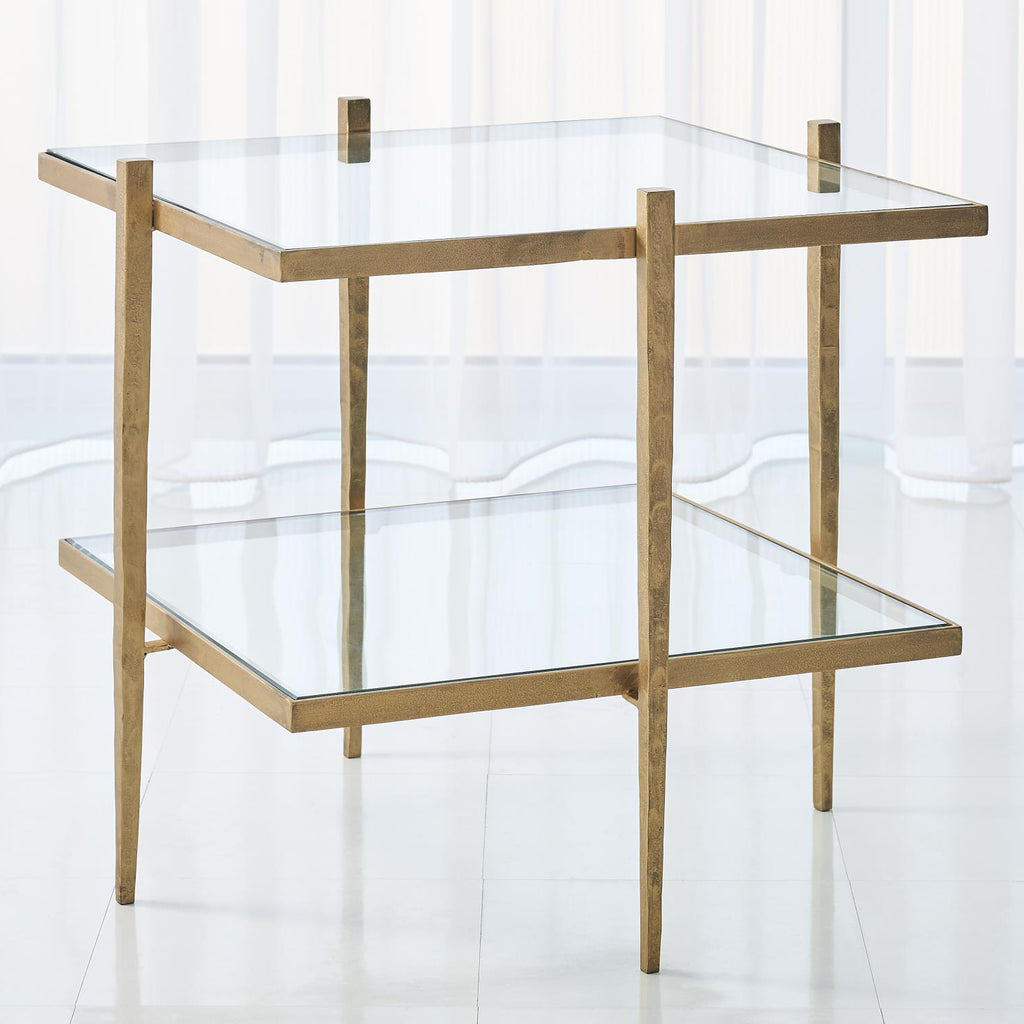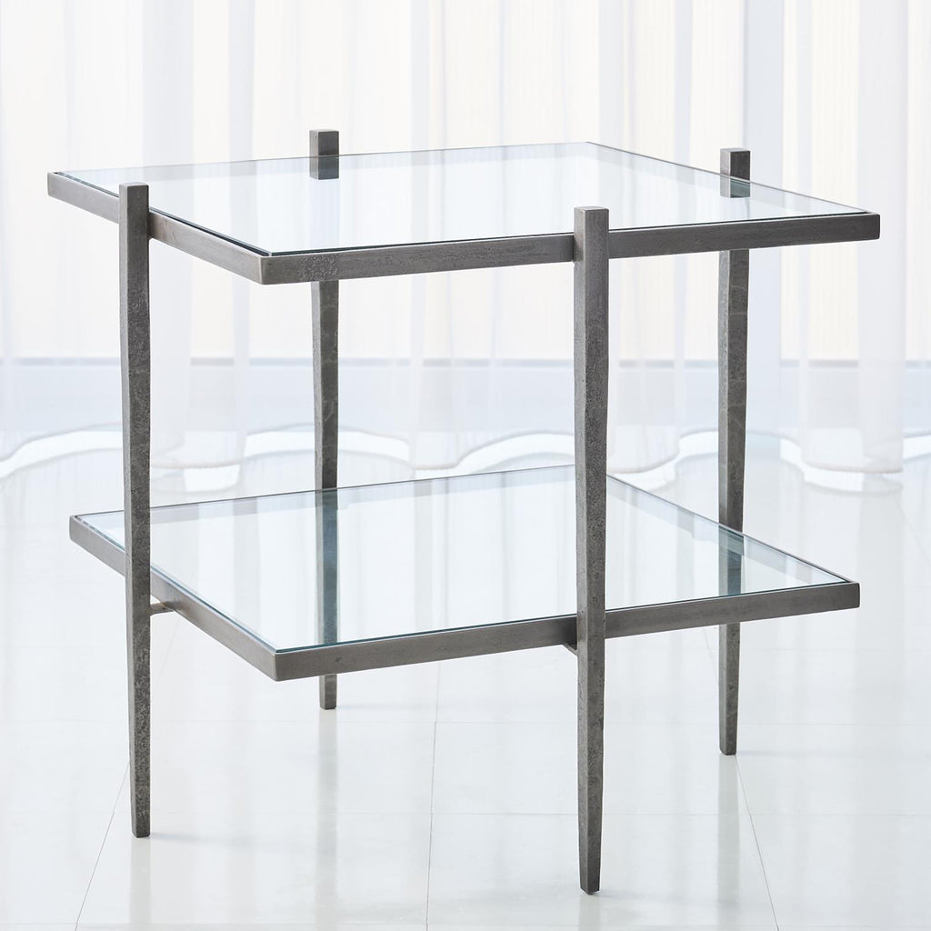 The Global Views Laforge End Table features an iron frame with a netal finish and a clear, tempered glass table top and lower shelf. For added design interest, the tapered legs are uniquely positioned at the middle of each side of the table as opposed to the corners, which is the typical placement. How beautiful!