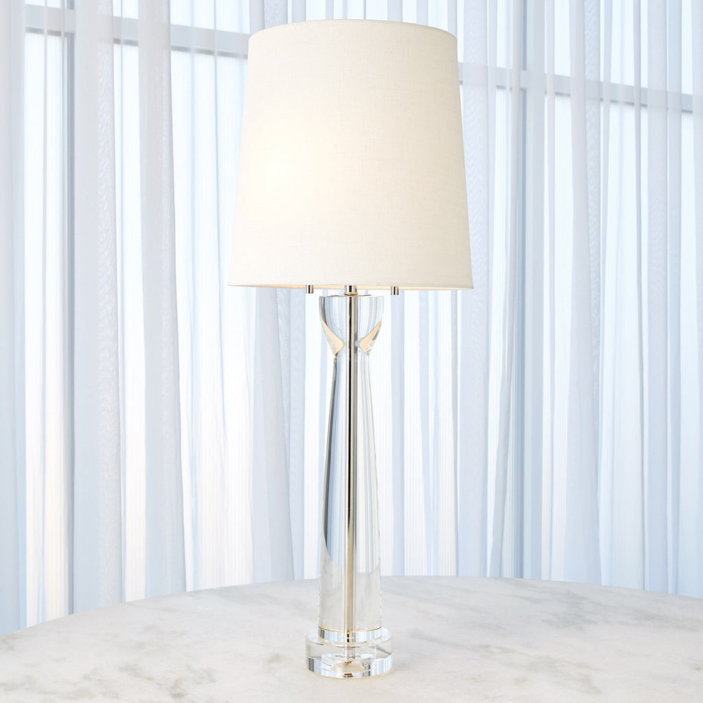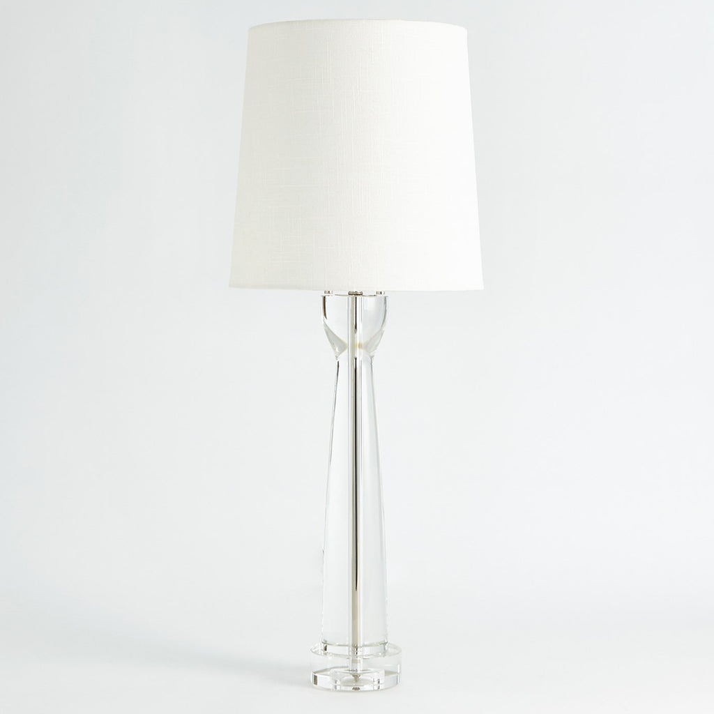 The Global Views Modern Crystal Column Lamp is brilliantly cut crystal in a classic shape with hardback white linen shade.