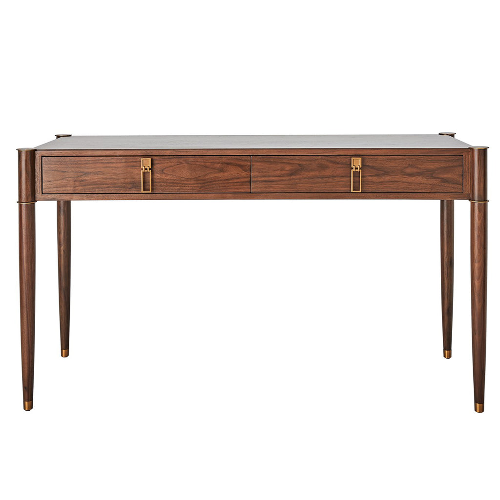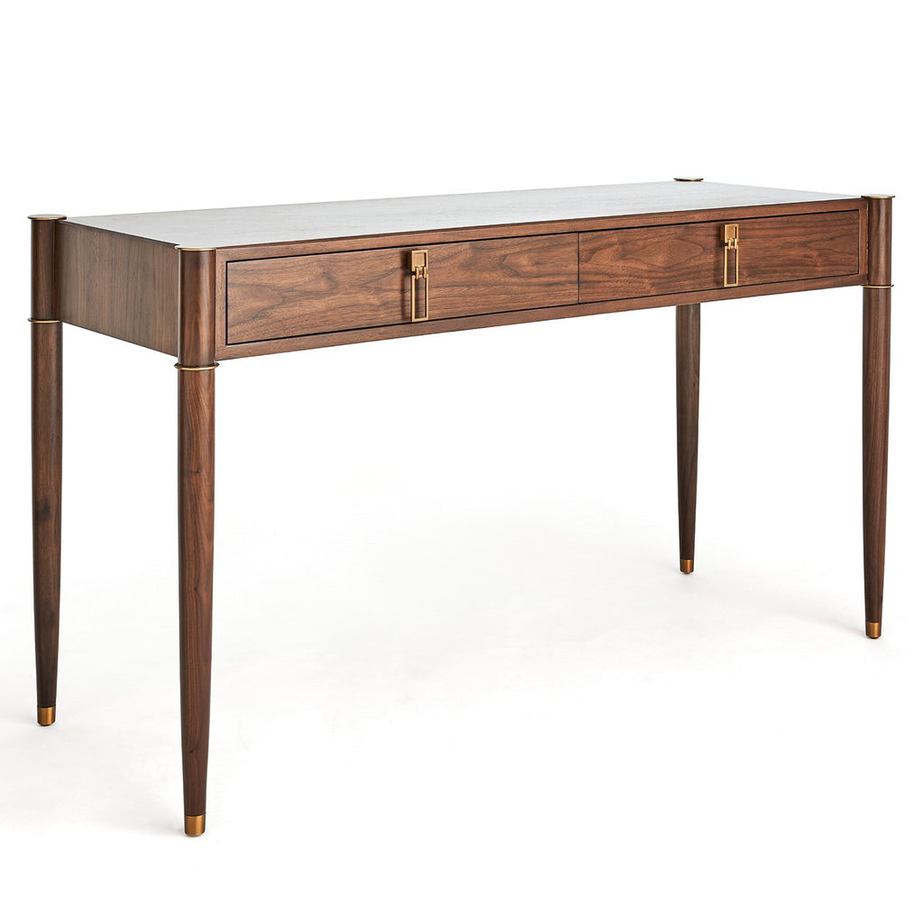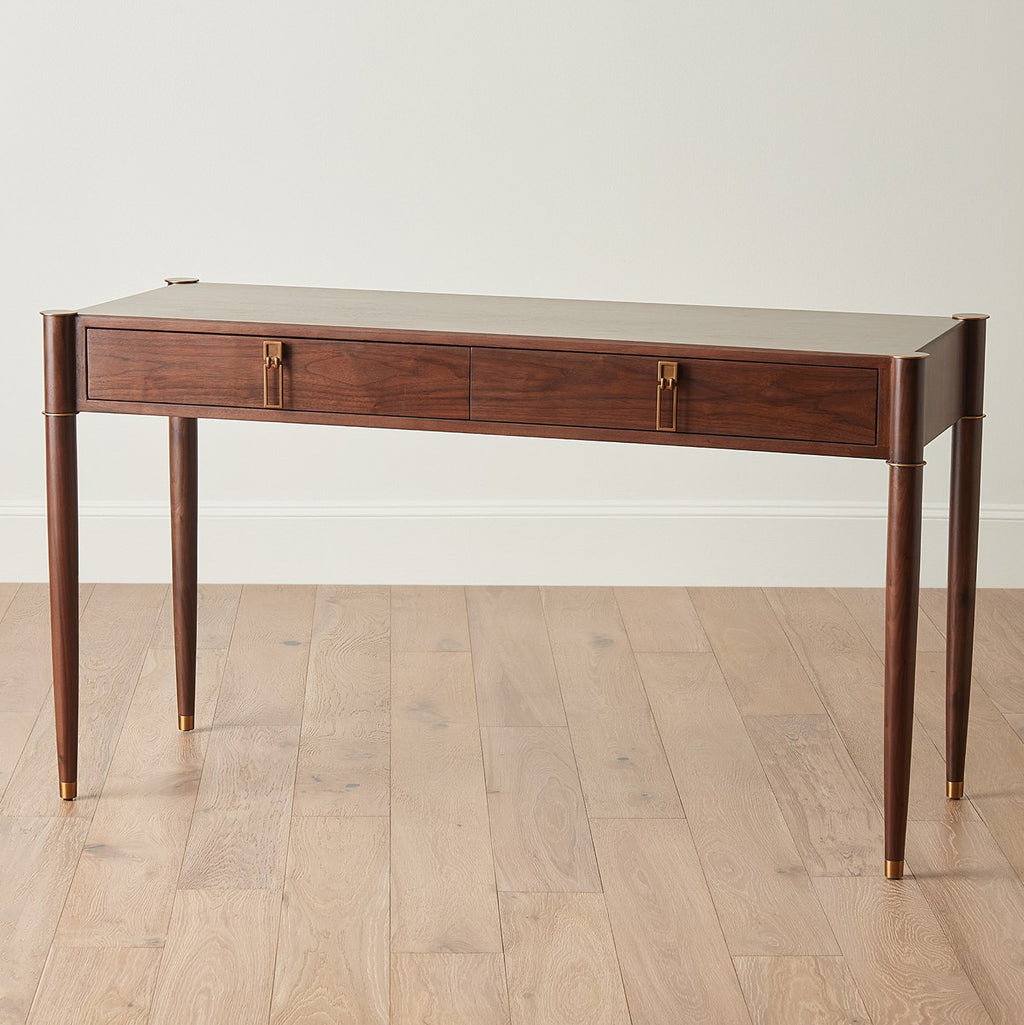 The Triple Curve Desk, designed by Edward Nader for Global Views, reinterprets classic traditionalist style with a modern sensibility. Crafted from rich walnut wood and veneer, it features an interior with Acacia veneer and soft-close drawers for smooth, quiet use. Aged brass handles, trim, and sabots add a refined, luxurious touch.