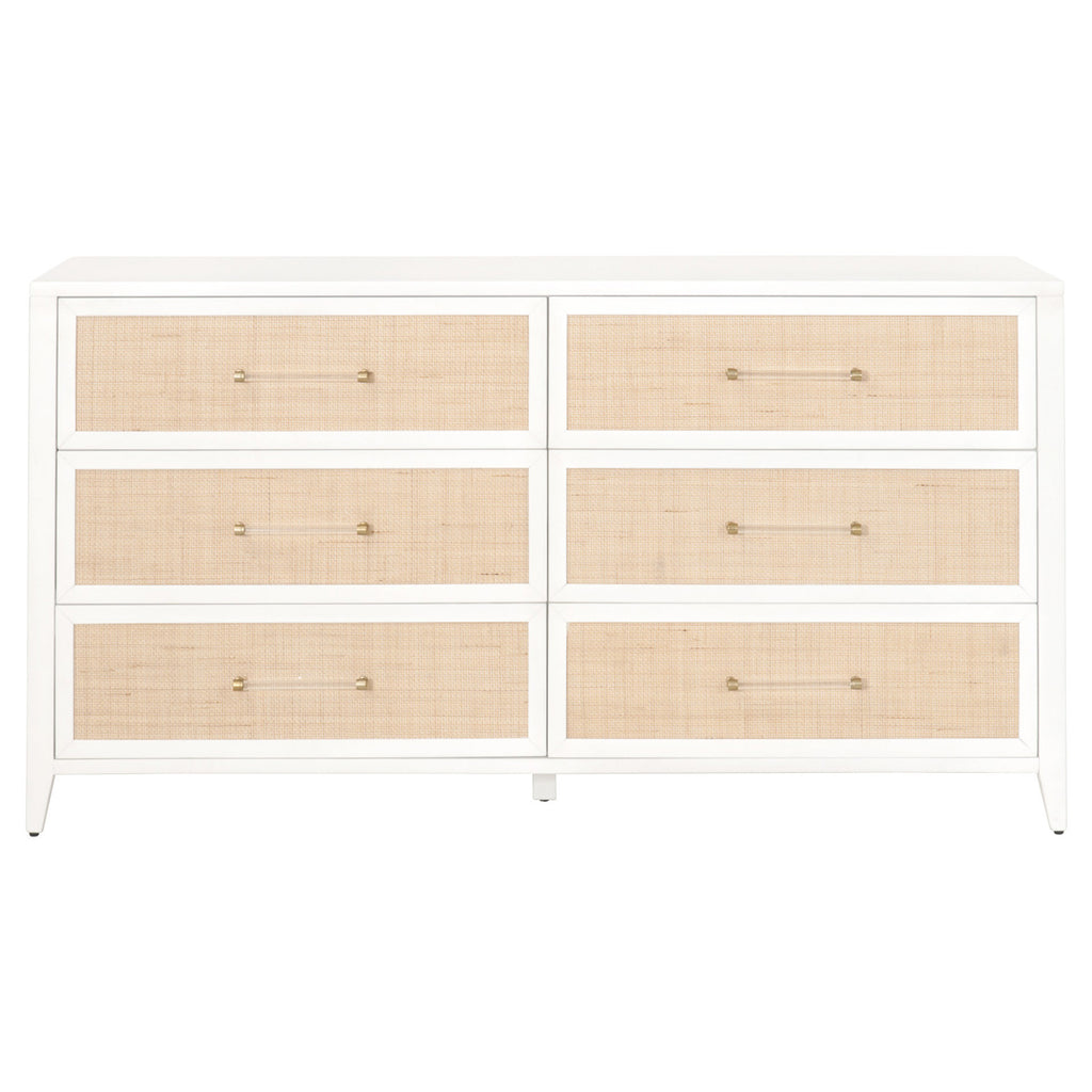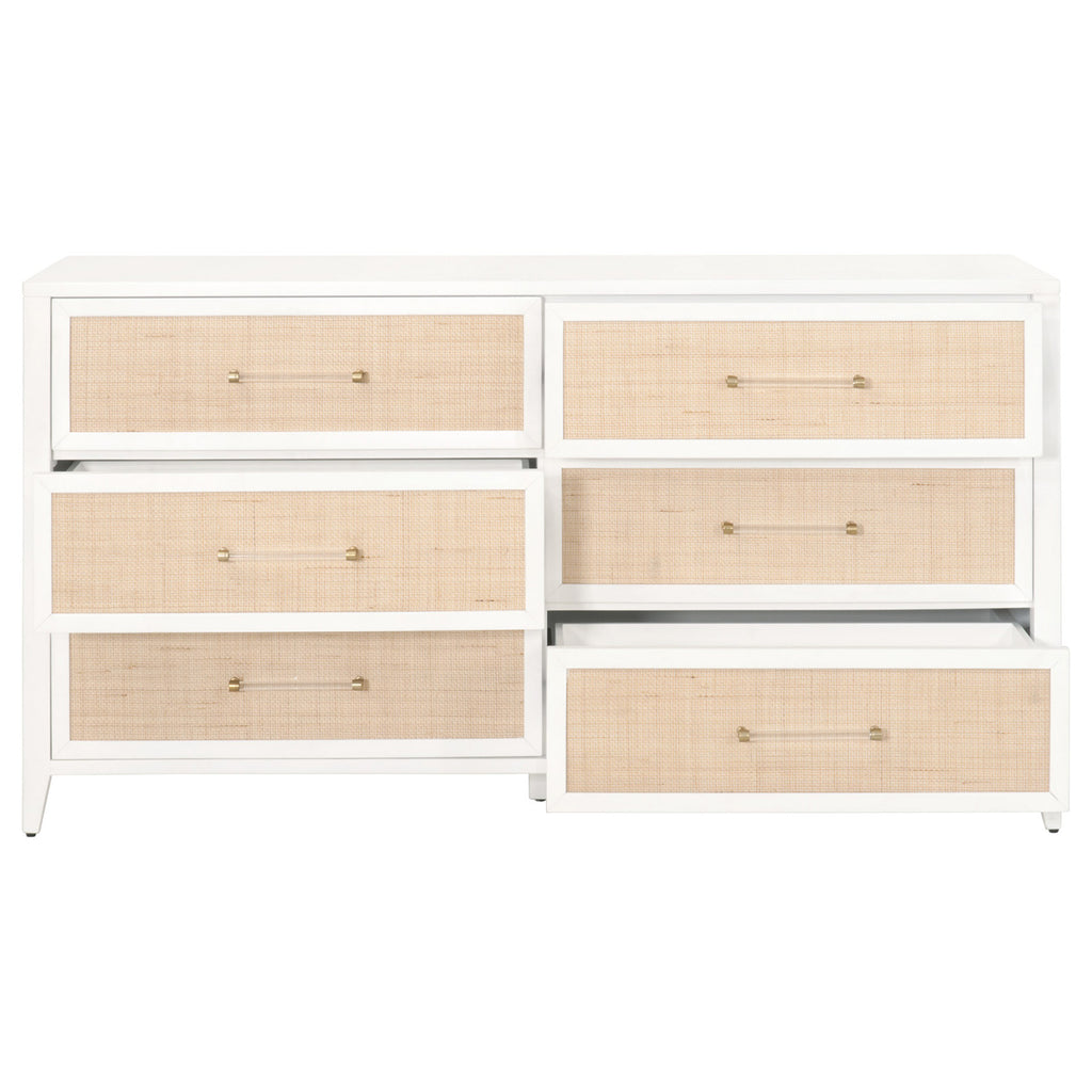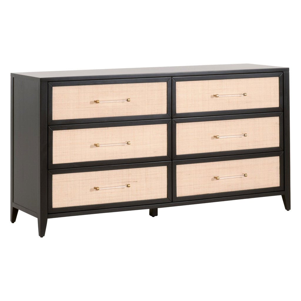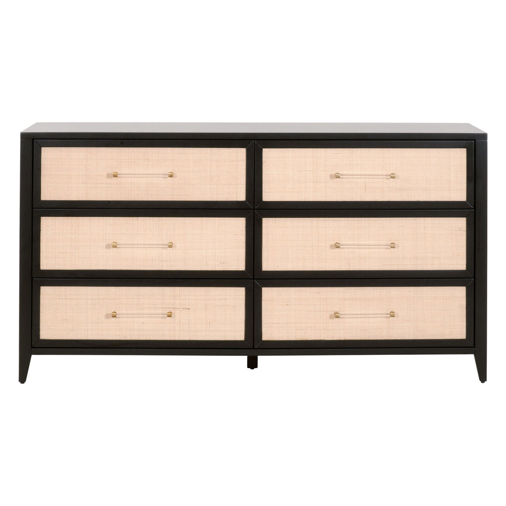 The transitional Essentials for Living Holland double dresser nicely blends design styles taken from tropical, traditional, and modern looks. The six storage drawers feature a natural rattan inlay framed by a brushed black or matte white acacia wood. The modern-looking clear handles with brushed brass ends uniquely accessorize this dresser as well. This bold and natural look will be a long-lasting statement piece in any bedroom for years to come. Tradition Collection's Natural Rattan finish is a natural material that includes unavoidable variation in color, texture, blemishes and marks. These features are not defects, but rather the material's natural characteristics.