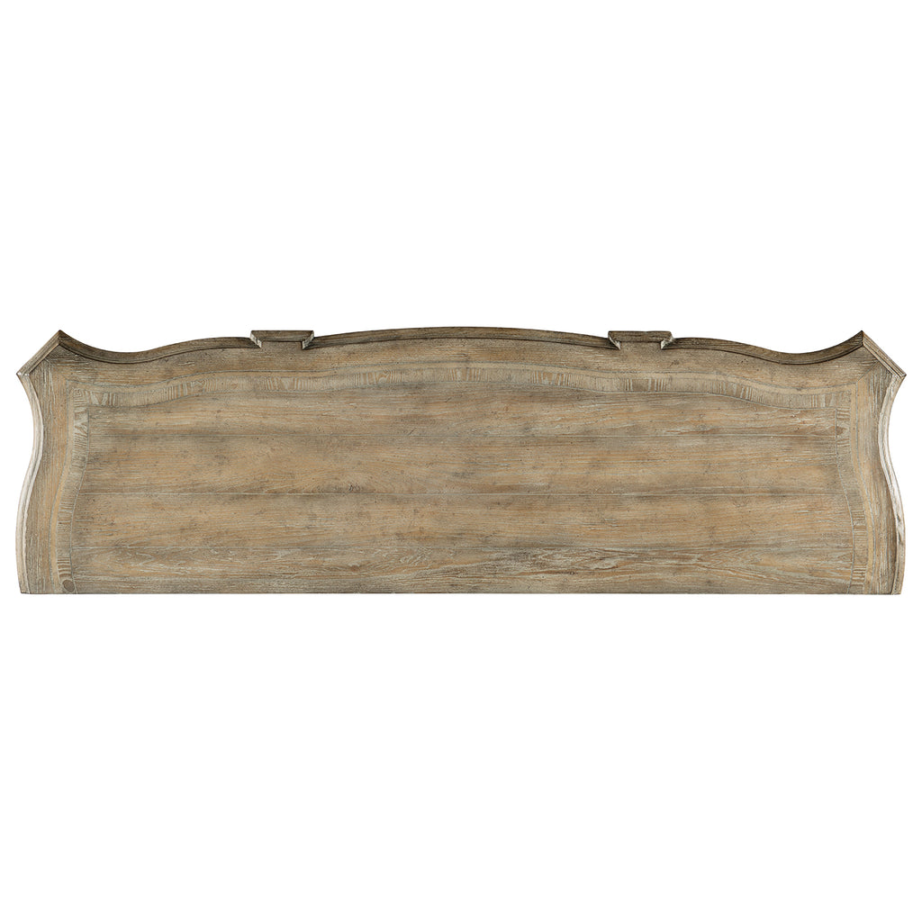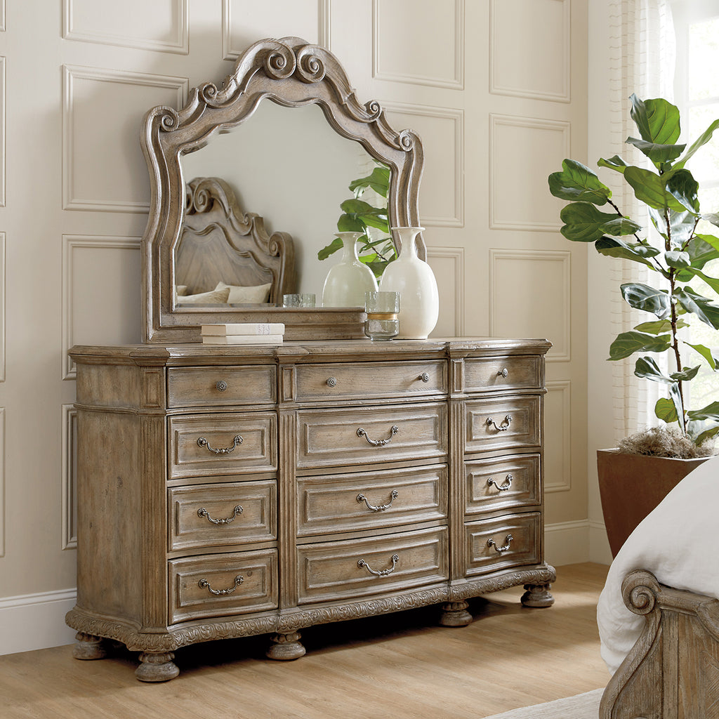 Classic European design elements and a refined rustic finish come together on the shaped silhouette of the Castella 12-drawer dresser with an intricate acanthus leaf base molding and jewelry-like antique silver shaped drawer hardware. The timeless dresser is made casual with the luminous finish exuding a look of laid-back luxury. The center drawer has a drop front to accommodate wire management and electronics, and the three bottom drawers are cedar-lined.
