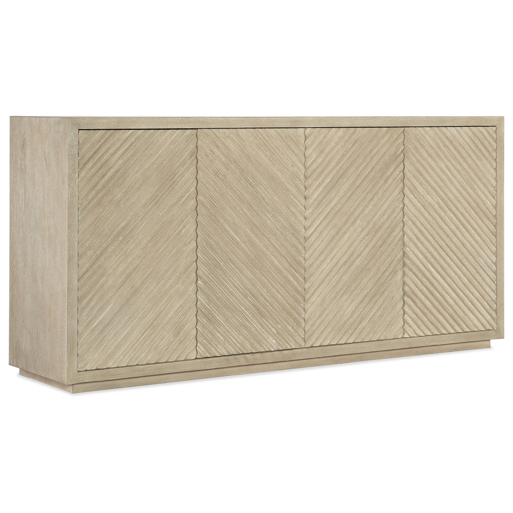 Create a serene and tranquil haven with the Cascade Credenza in an organic soft taupe finish on Oak Veneers with a tactile reeded front in a diagonal pattern. Modern and relaxing, the Cascade Credenza has four doors with soft-close hinges and touch latches with one adjustable shelf behind each pair of doors.