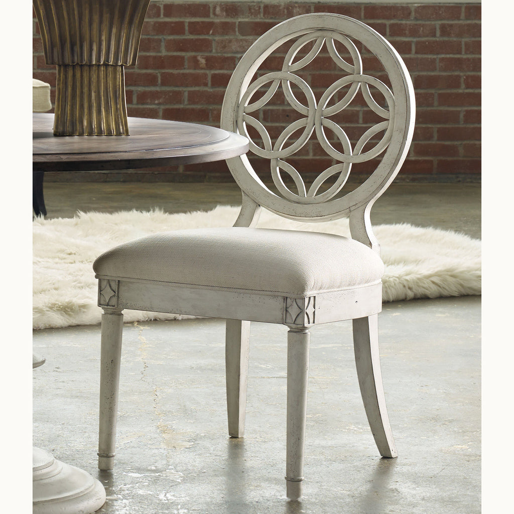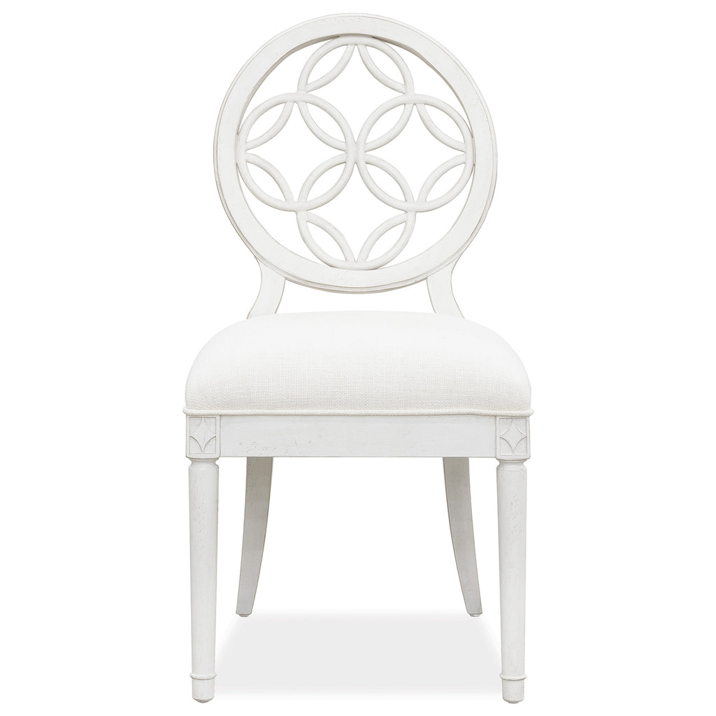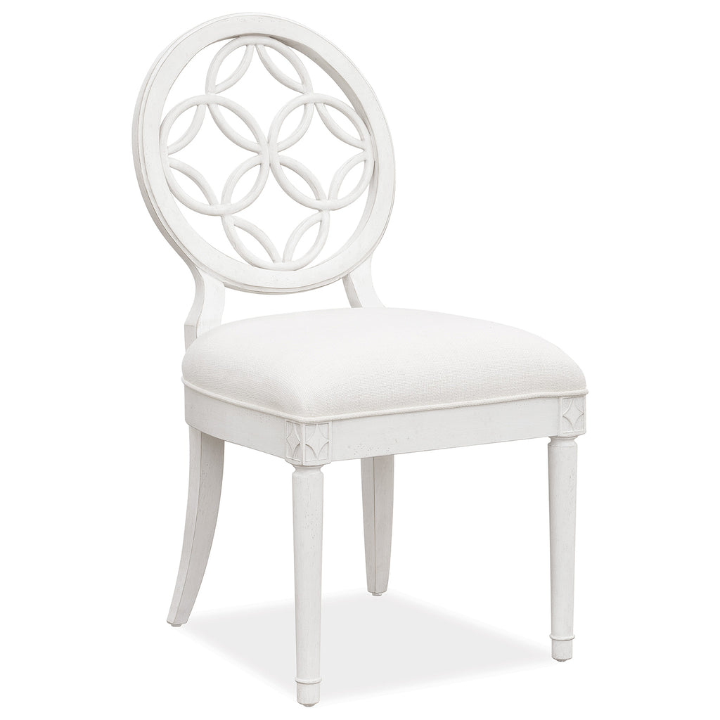 With a lace-like interlocking circle fretwork back, the Brynlee Side Chair is pretty and poised to offer comfort for gathering times with family and friends. The creamy white finish has light distressing for a laid-back luxury, and is complemented by the winter white-colored Lindy Snow linen-polyester blend fabric.