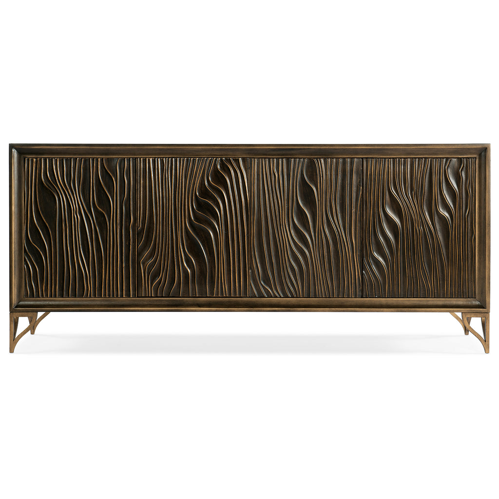 With an air of mystique, the Mountgomery Credenza has a dark wood finish exterior with wavy, grooved door fronts, gold highlighting and shaped gold metal legs. Crafted of Maple Veneers, resin and metal, there are 4 doors with one adjustable shelf behind each pair of doors and a ventilated back panel and FX705 3-plug outlet. Accommodates up to a 75-inch TV.
