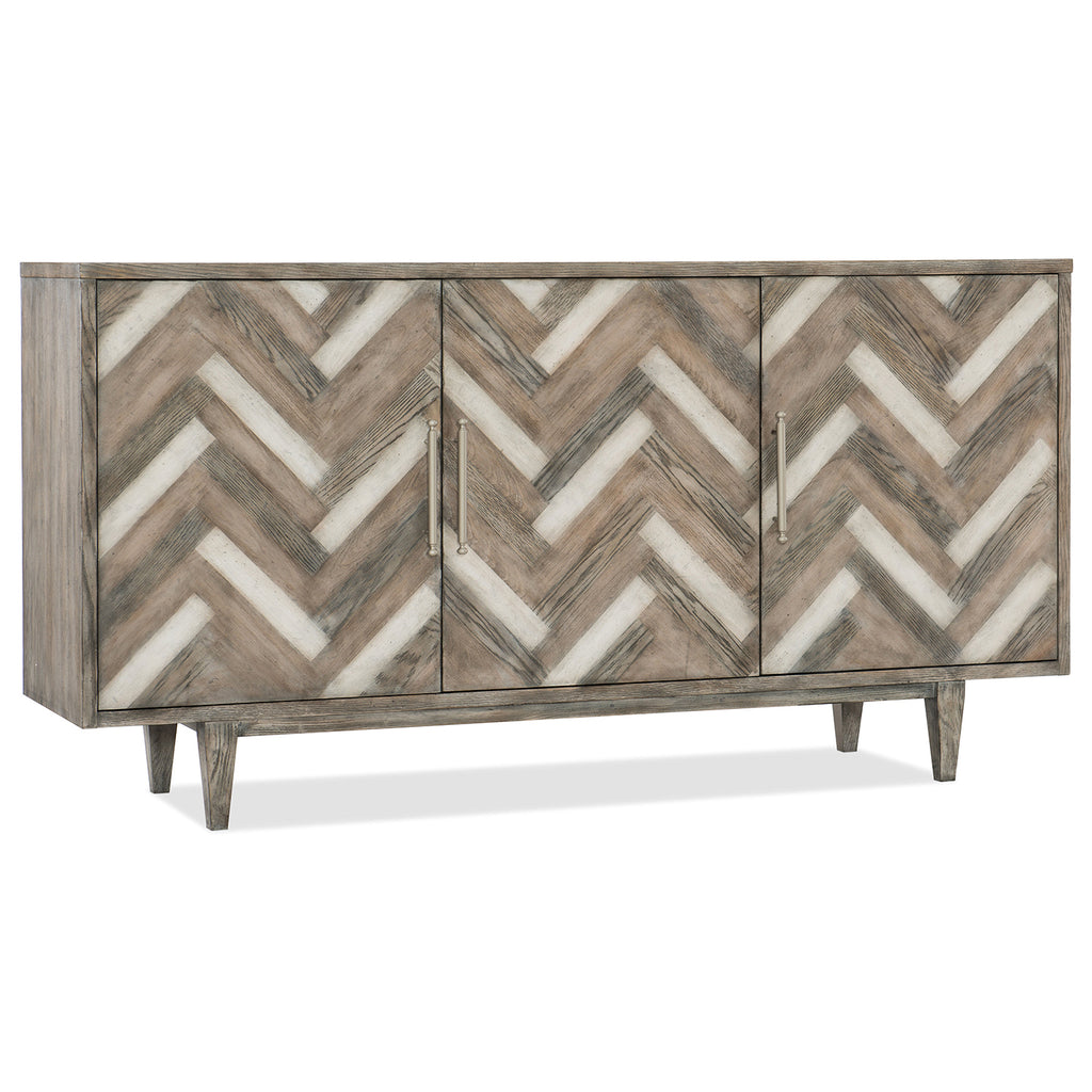 Maple, Oak and Cherry Veneers in varied color tones are blended together in an extraordinary chevron pattern, creating a sophisticated fashion apparel vibe. Shiny pewter-colored bar pulls add a final accent. Three doors with one adjustable shelf behind the pair of left doors and one adjustable shelf behind the right door. This piece is media-ready with a ventilated back panel.