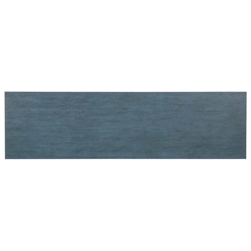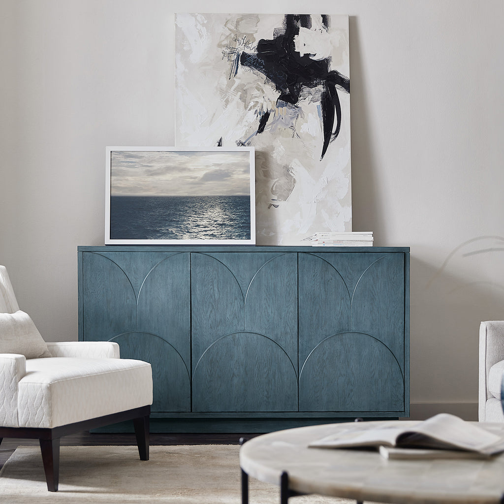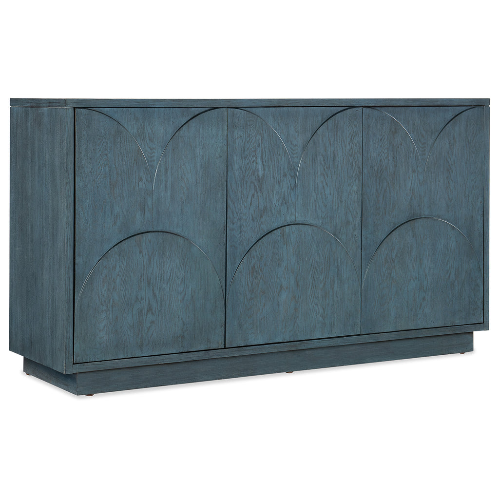Brilliant in a soft blue finish with wood grain showing through and a subtle, oversized scallop motif on the door fronts, the Round Valley Entertainment Credenza sets the tone for a beautiful room. Accommodating up to a 65-inch TV, the credenza has 3 doors with soft-close hinges and push latches, two adjustable shelves behind the pair of left doors and one adjustable shelf behind the right side door. Vented back panel and 3-plug electrical outlet included.