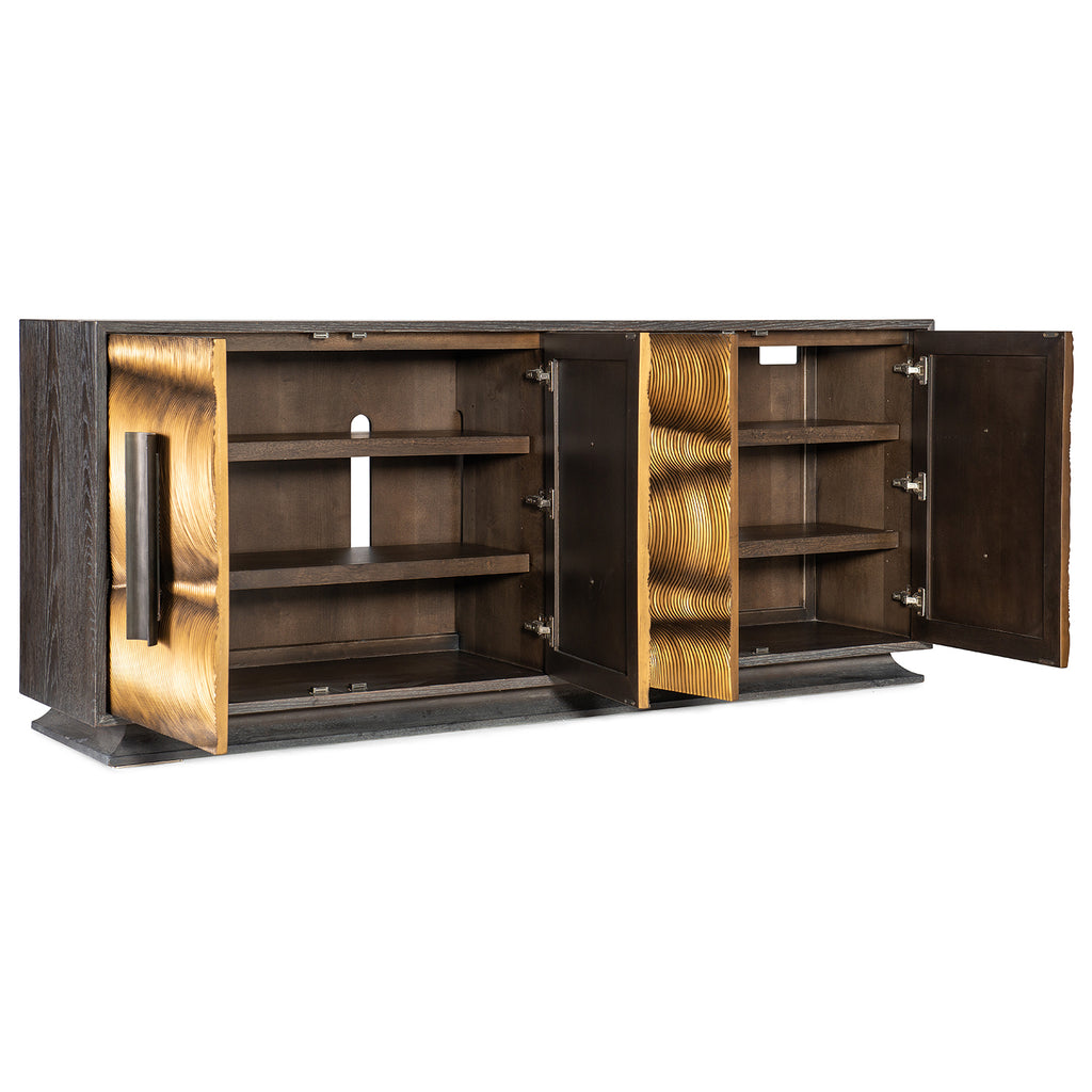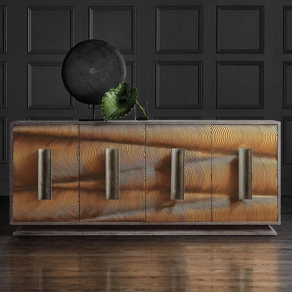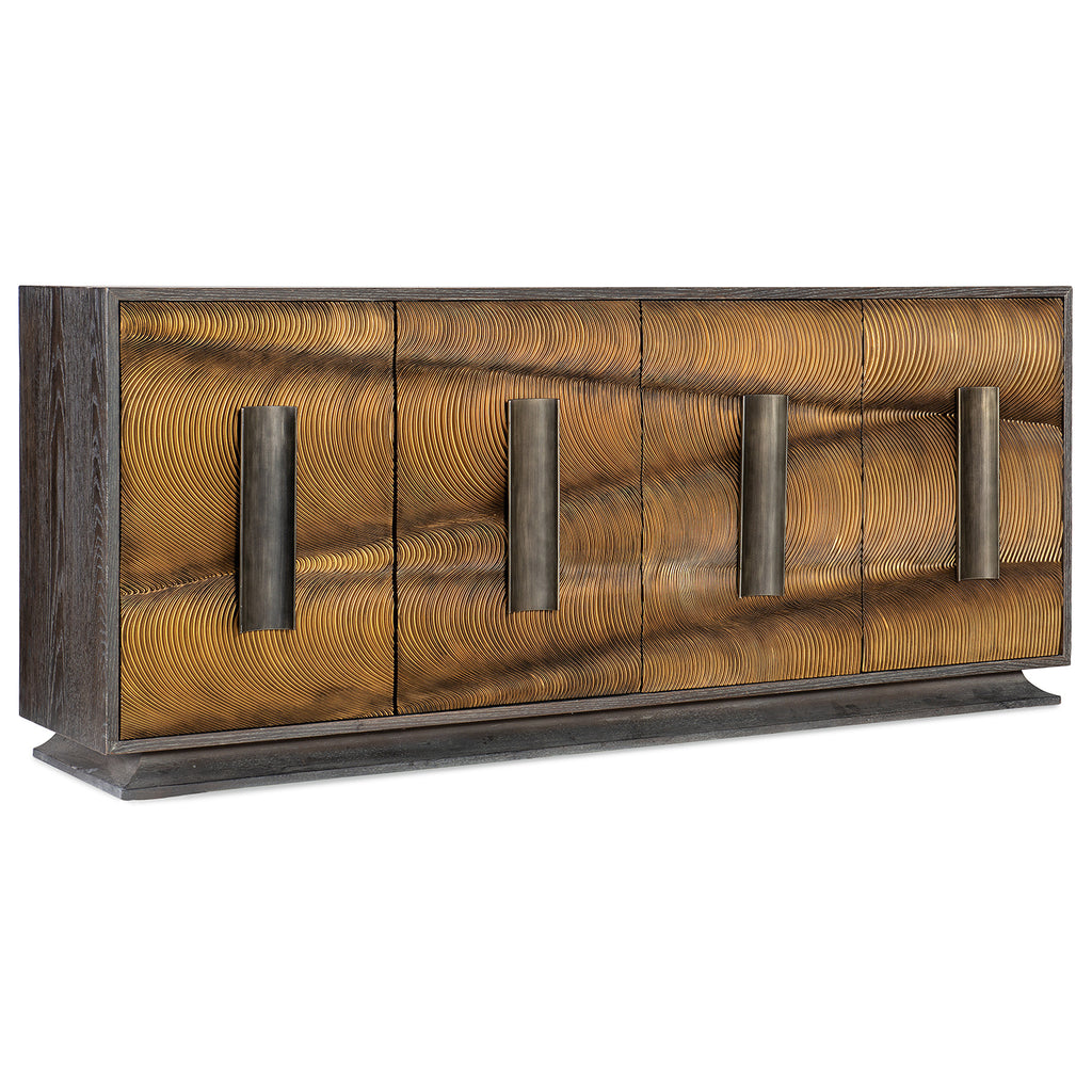 With an earthy and exotic elegance, the Mélange Swaley Four-Door Credenza is a striking silhouette with a dramatic gold swirl motif on the front, accented by dramatic curved vertical rectangle-shaped bronze hardware. Crafted of Oak Veneers and Resin, the credenza has 2 adjustable shelves behind each pair of doors, a ventilated back panel with wire management and a power supply