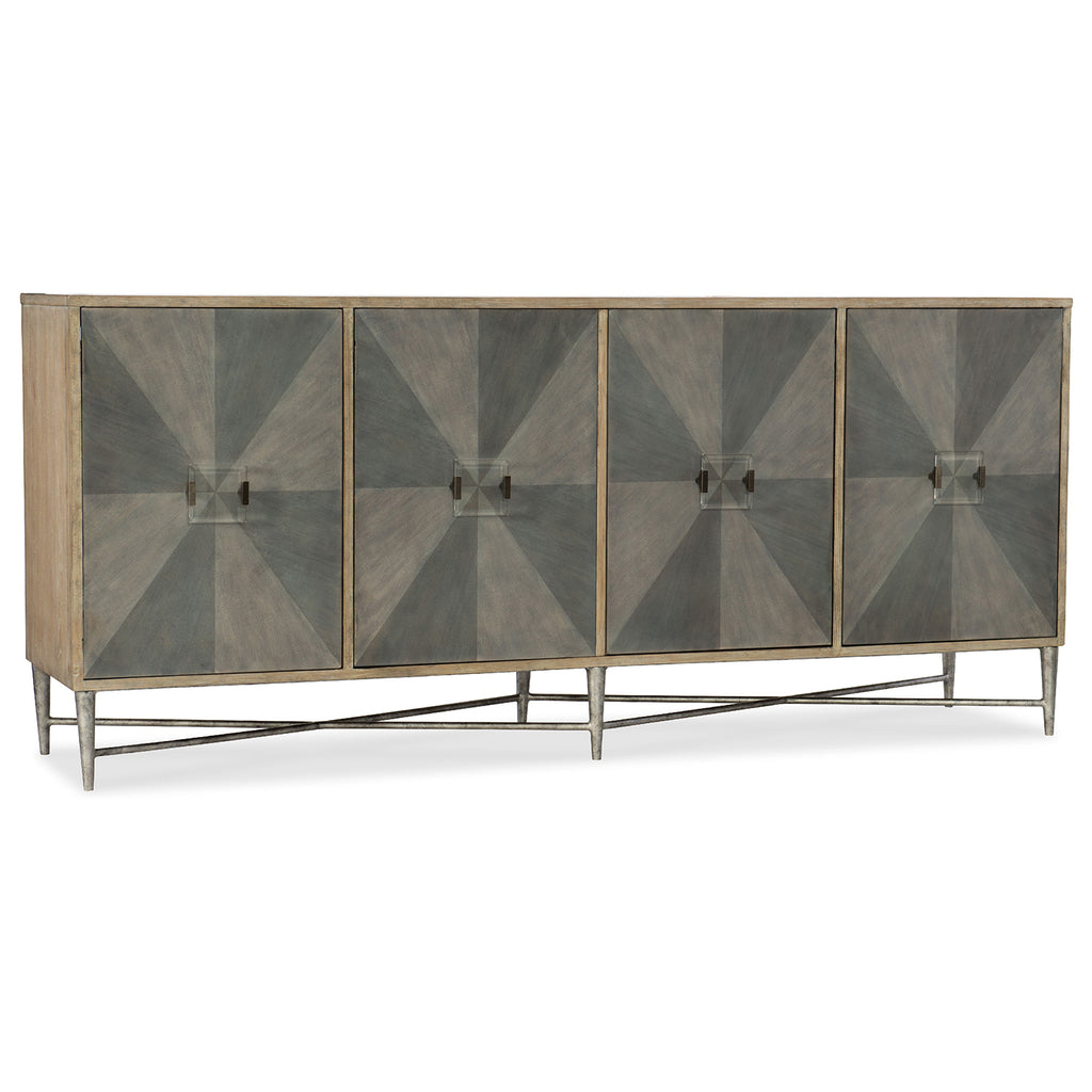 With its cosmopolitan flair and exquisite style, the Zola would be at home in a shop on Rodeo Drive – or in your living space. Crafted of Elm, Maple and Black Walnut, the case is finished in a natural color, while the front features a diamond pattern in contrasting gray tones, accented by jewelry-like Lucite pulls. A refined metal base in a silver finish creates the finishing touch. Four doors with soft-closing hinges, with one adjustable shelf behind both the center set of doors and the left and right doors.