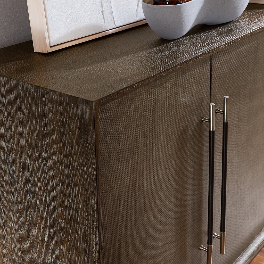 Sleek and stunning with a timeless sophistication and soft modern aesthetic, the Modern Mood Entertainment Console combines Quartered Oak Veneers with raffia-wrapped doors, warm pewter brushed metal bar pulls and leather accents. Features include four doors with soft-close hinges and magnetic catches, two adjustable wood shelves behind each pair of doors, ventilated back panels and wire management holes in the back panel and a three-plug electrical outlet behind the right-side doors.