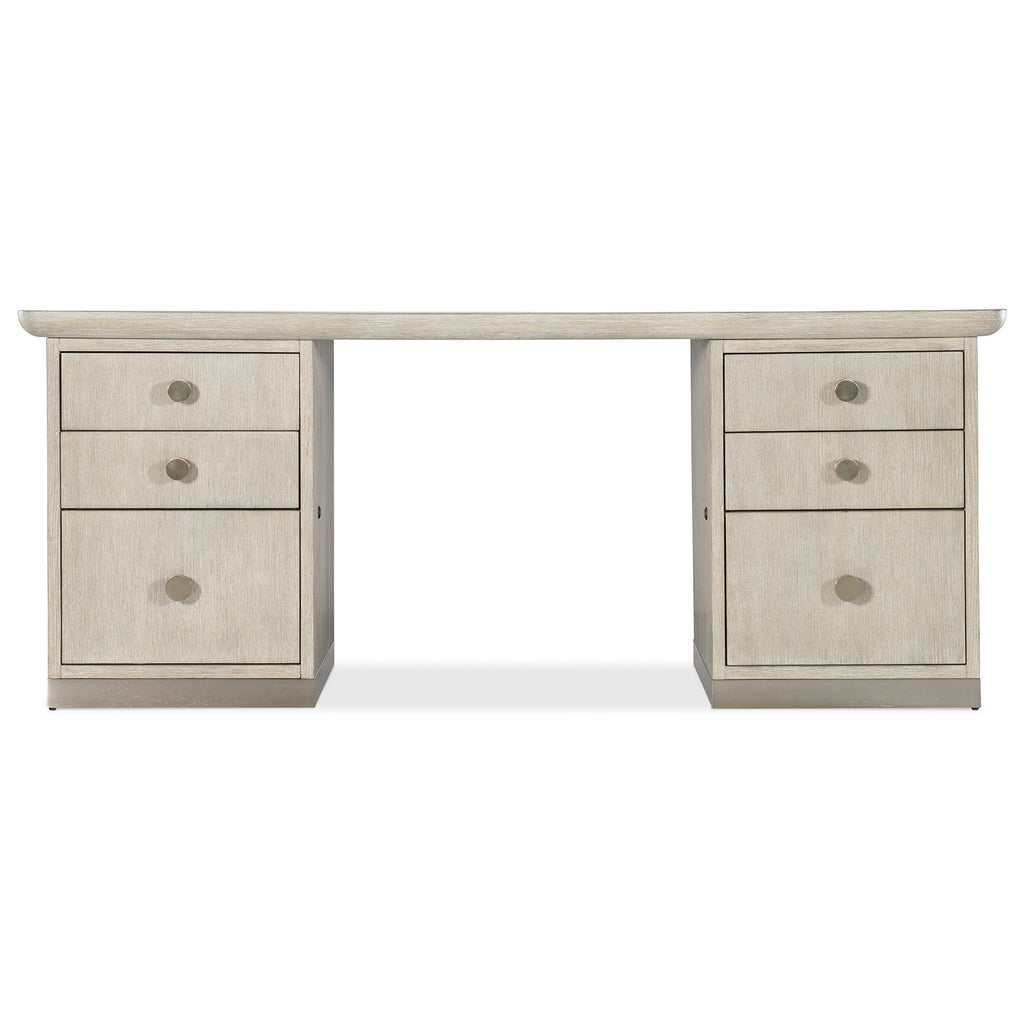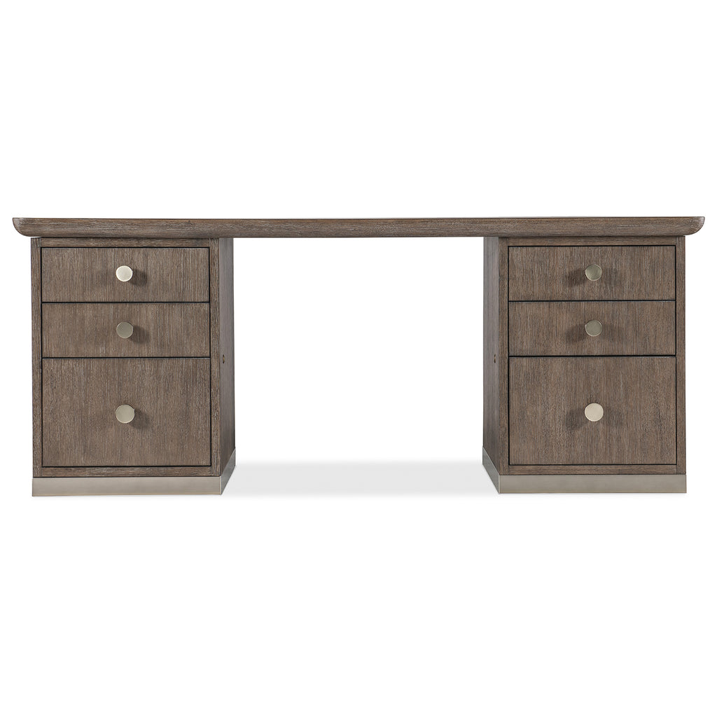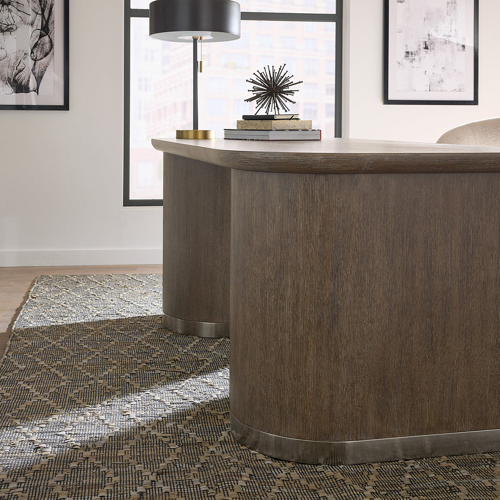Offered in a clean and unmistakably modern aesthetic that transcends time, the Modern Mood Executive Desk is a statement piece packed with functional features. The Diamond or Mink Finish delivers a soft sophistication, while the metal banding and edging on the base and round metal knobs wrapped in leather offer a mixed-media eclecticism. Features include two locking file drawers with Pendaflex letter/legal filing system, 4 utility drawers, two top left drawers with removable dividers and a top right drawer with removable mouse pad and pencil tray that can be used in either side top drawer. There are locks on the inside of the kneehole area and levelers.
