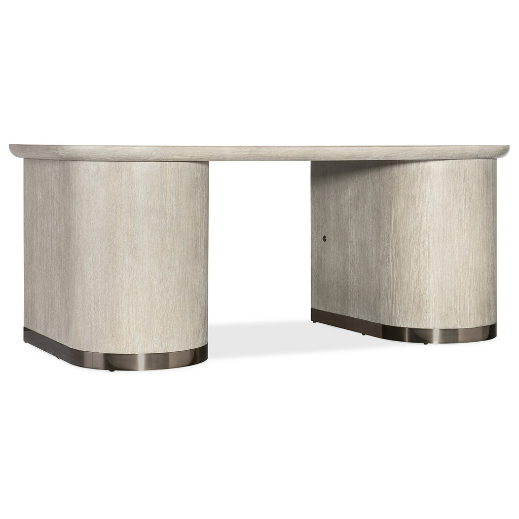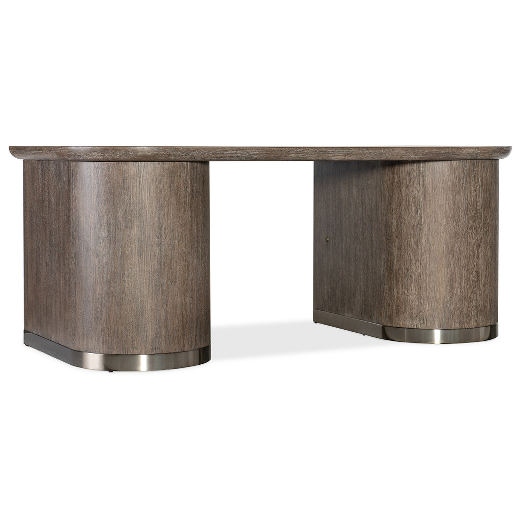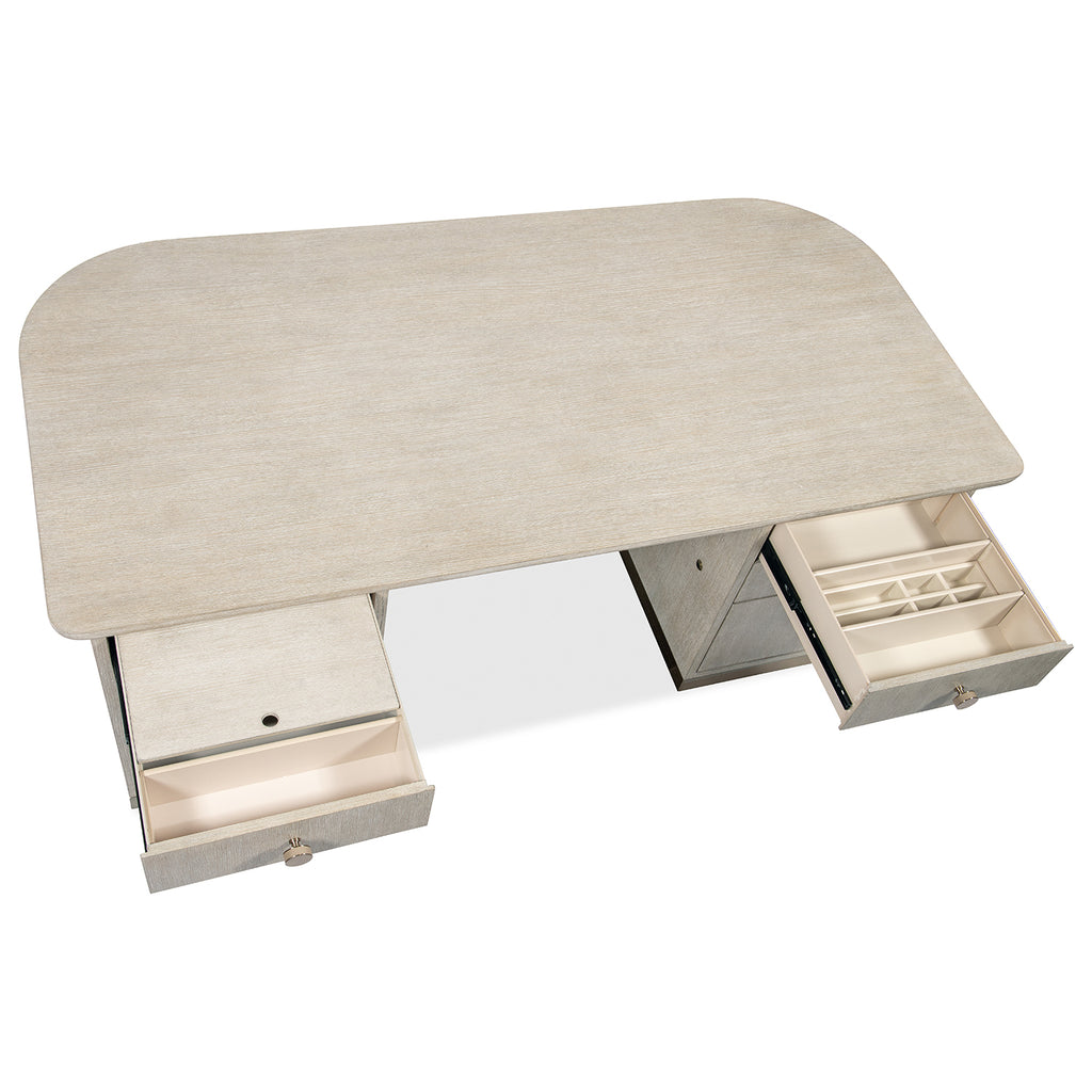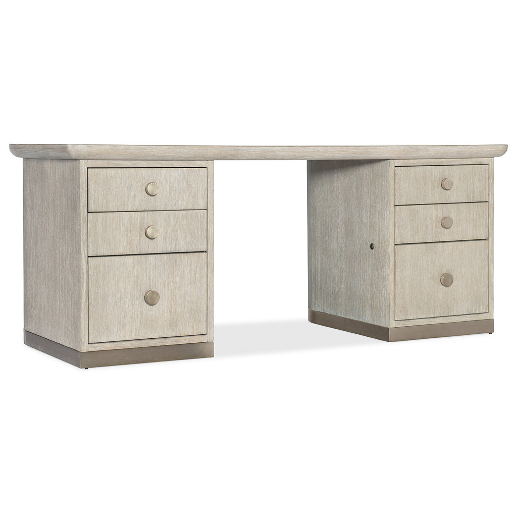 Offered in a clean and unmistakably modern aesthetic that transcends time, the Modern Mood Executive Desk is a statement piece packed with functional features. The Diamond or Mink Finish delivers a soft sophistication, while the metal banding and edging on the base and round metal knobs wrapped in leather offer a mixed-media eclecticism. Features include two locking file drawers with Pendaflex letter/legal filing system, 4 utility drawers, two top left drawers with removable dividers and a top right drawer with removable mouse pad and pencil tray that can be used in either side top drawer. There are locks on the inside of the kneehole area and levelers.