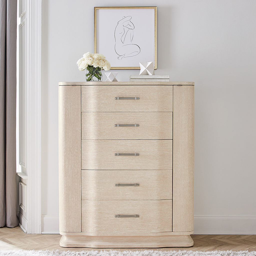 With a curved breakfront design and soft, flowing edges, the Nouveau Chic Five-Drawer Chest brings a clean neutral palette and casual modern style to your space. Crafted of Cathedral and Quartered Oak Veneers, it is finished in the serene Sandstone with light wire brushing. The stepped bracketed bar pulls in a nickel finish emulate the stepped-top dresser. A brilliant blend of fashion and function, the chest has two doors with soft-close hinges that open to reveal two felt-lined bars for hanging bracelets, 4 felt-lined fixed storage trays and 8 small black mesh bags and four large mesh bags for storing jewelry and other small items. Bottom drawer is cedar-lined.