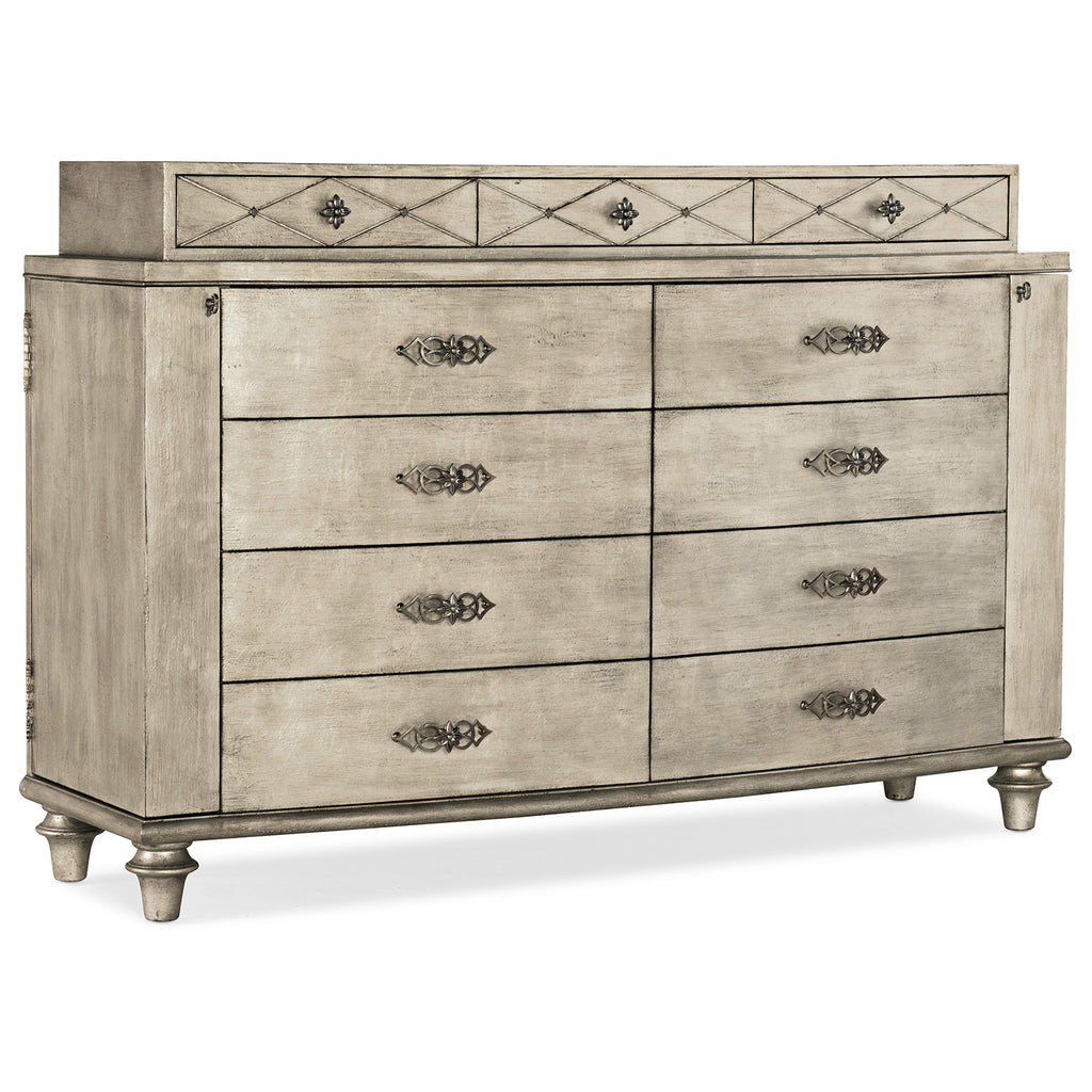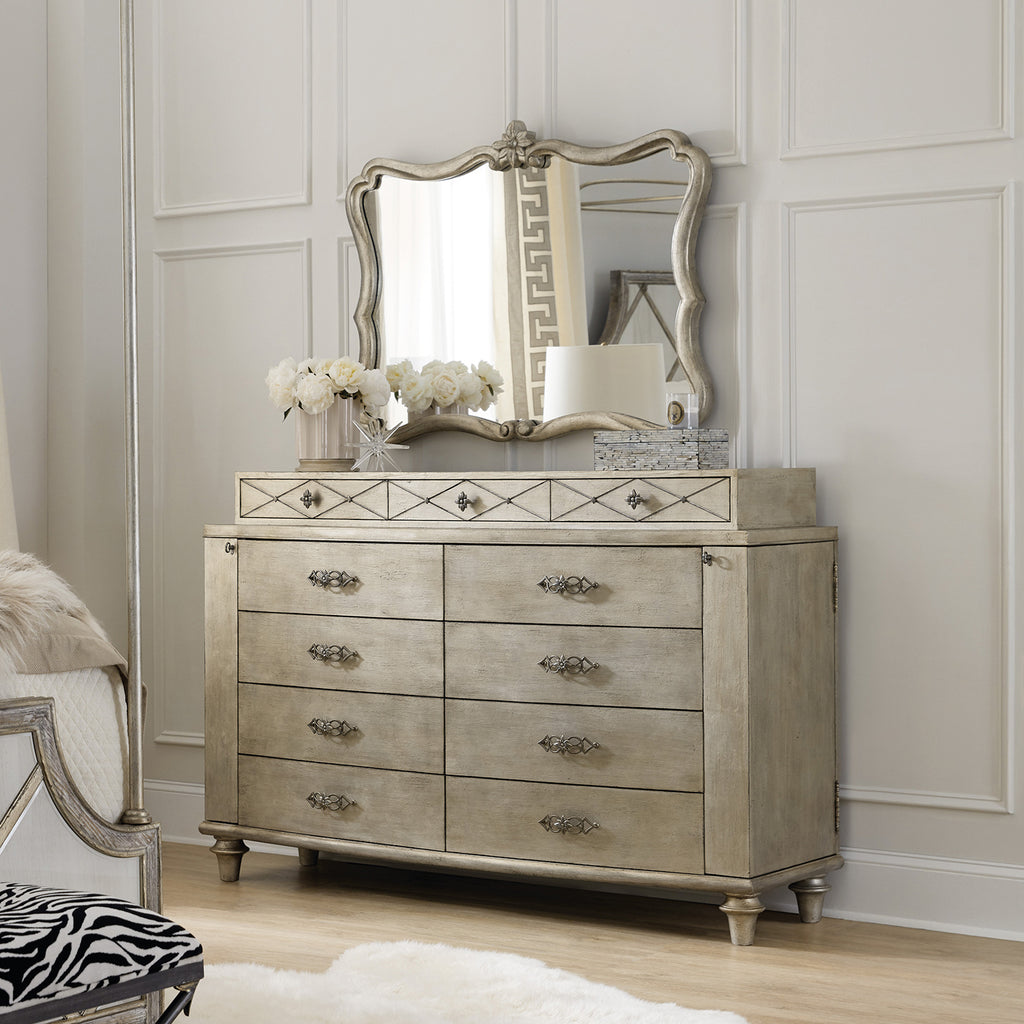 With a luxurious platinum patina, the Diamont Dresser is captivating and charming. Delightfully functional, there are jewelry doors on each end: doors with five jewelry hooks and 4 removable mesh jewelry bags attached to each door. There are eleven drawers, and the top 3 have pristine white interiors, while the top left drawer has a cream-colored removable felt liner and the top right drawer has a cream -colored removable jewelry tray. The bottom two drawers are cedar lined. Crafted of Poplar and Hardwood Solids with Oak Veneers, the Diamont Dresser is finished in Jewel, a silver with rich undertones of gold and champagne. The decorative jewelry-like hardware is in an antique silver color.