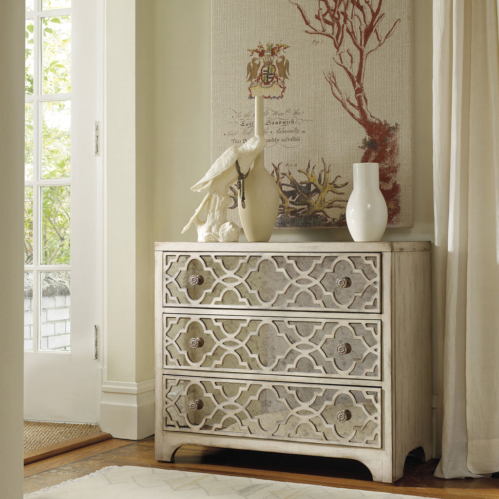 Timeless and romantic, this elegant chest is purely pretty with its fretwork front combining a creamy Pearl Essence finish with Antique Mirror and a soft silvery gold accent. Three drawers; the bottom drawer is cedar-lined.