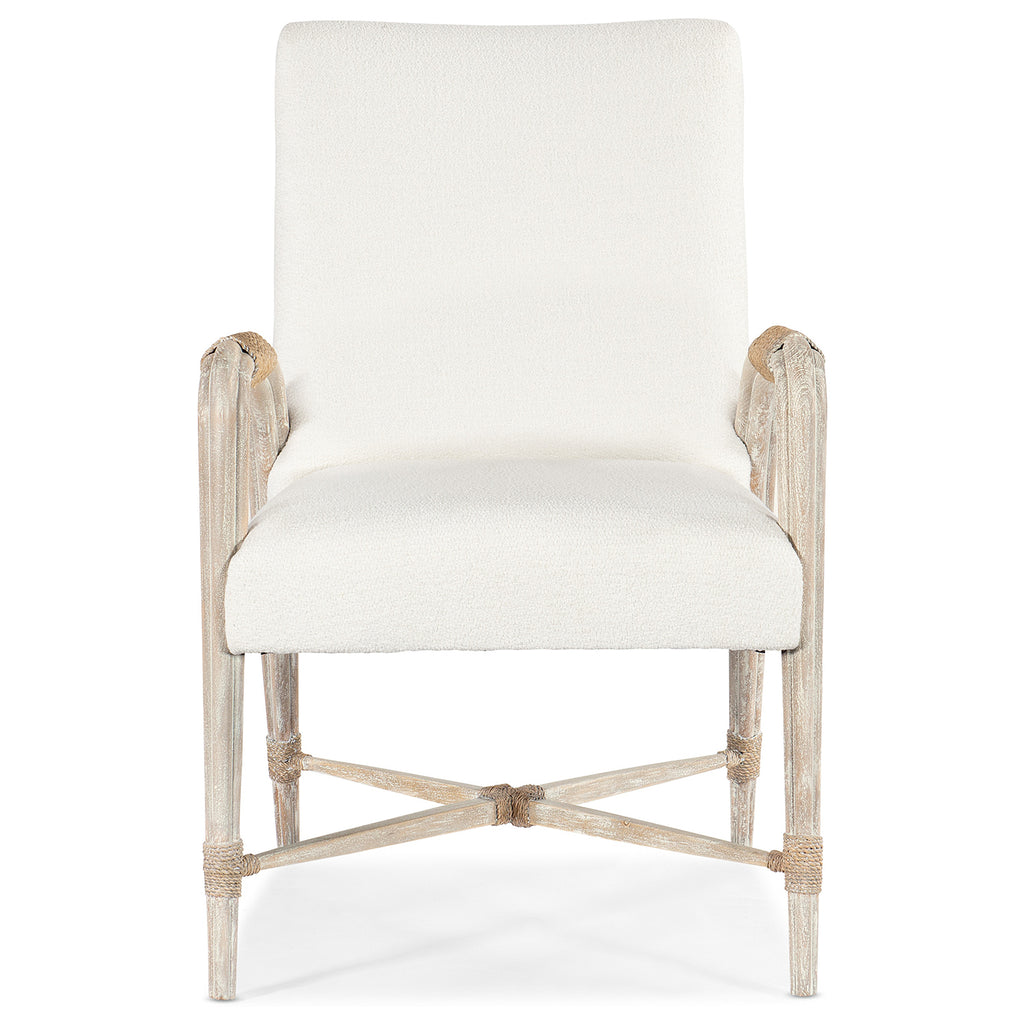 Laidback and inviting, the Serenity Arm Chair brings the relaxed aura of the outside in. With a comfortable seat and back covered in the Macrame Artic fabric, the arm chair is crafted of Beech Wood with rope-wrapped arms and a stylish X stretcher base. The light and airy Surf finish is a whitewashed color.