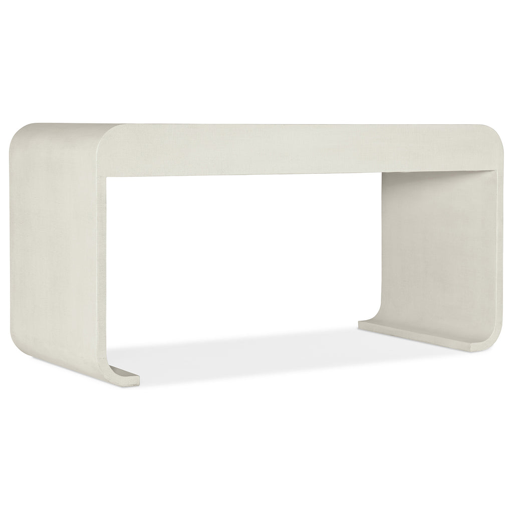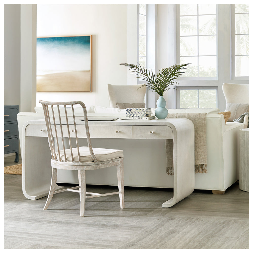With a tactile organic surface of white lacquered grasscloth, raffia and wood in the creamy white Sand Dollar finish, the Serenity Bayport Writing Desk brings the relaxed aura of the outside in. With 3 drawers, the left and right side drawers have a removable writing slide and pencil tray for use in either side, 2 removable dividers in each side drawer and the center drawer has a drop-front for keyboard use and wire access at the back of the drawer. As a finishing touch, the drawer interiors are painted white.