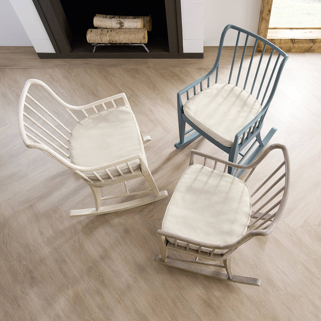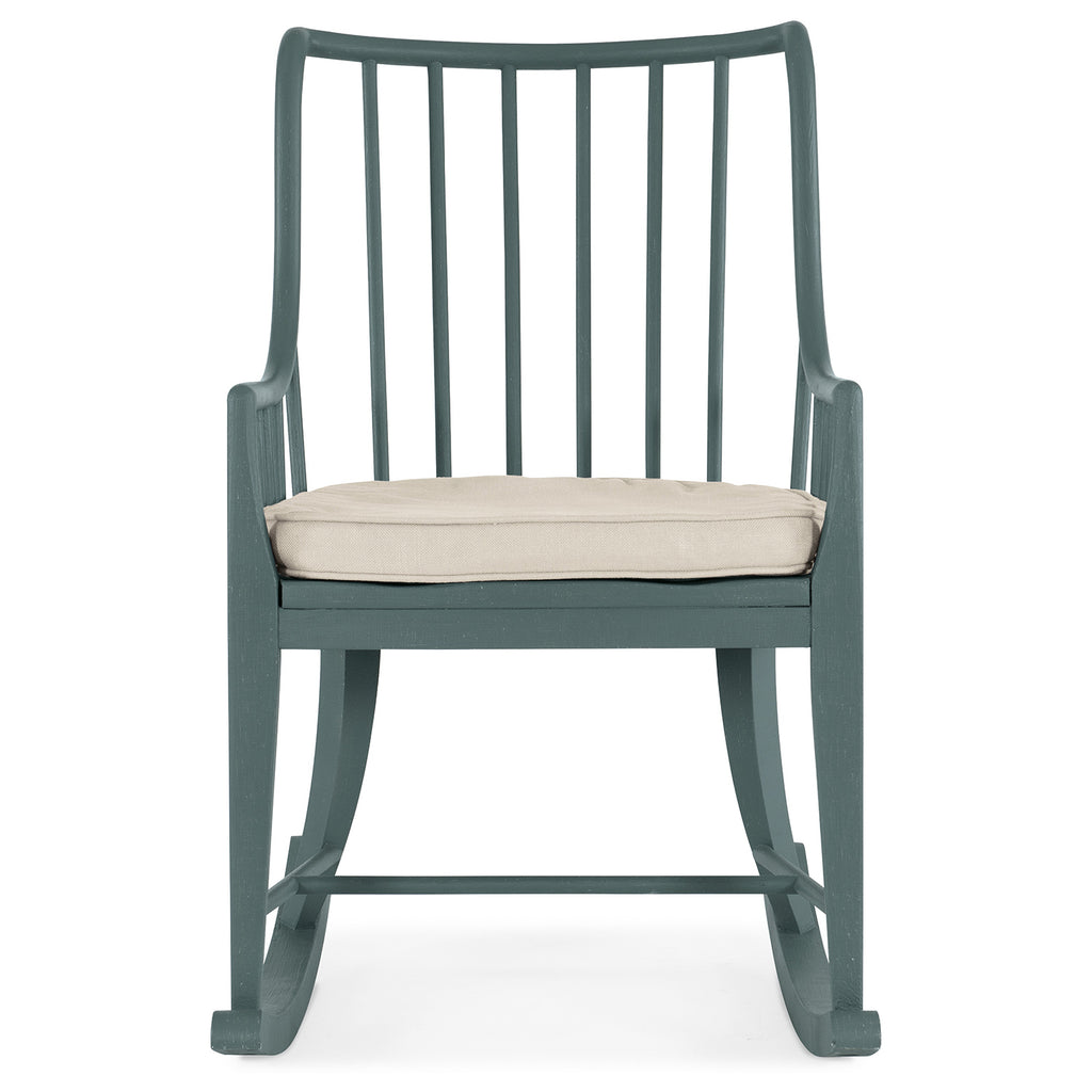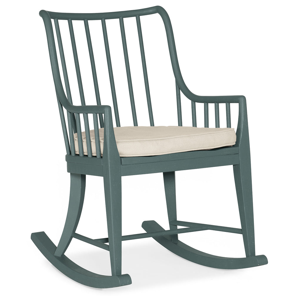 Bring the relaxed aura of the outside in for a sunroom, nursery or family room with the lovely Moorings Rocking Chair finished in the brush-textured color on Beech wood. With a vintage spindle back, the rocking chair has a plush loose seat cushion covered in the Oyster performance fabric, a blend of rayon, linen and polyester.