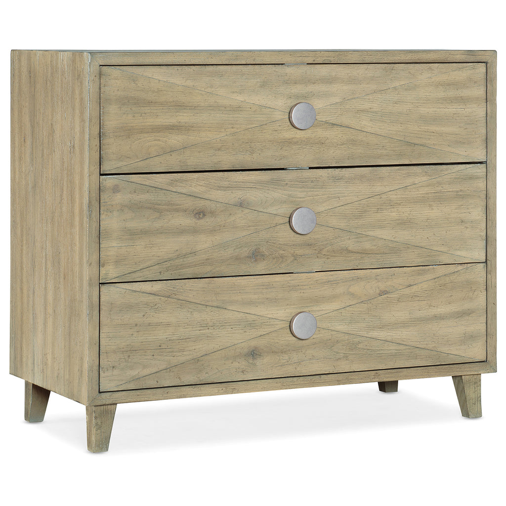 Inspired by the laid-back California coast and exuding a resort ambience, the Surfrider Bachelor’s Chest features 3 self-closing drawers with an inverted diamond design. Crafted of Pecan Veneers, Cedar and felt panel, the chest is finished in the light natural Driftwood finish with distressing including sandblasting and bleaching. Loaded with function, the chest has a power supply, a light underneath with a 3-intensity touch switch, a phone clip and a cedar-lined bottom drawer.