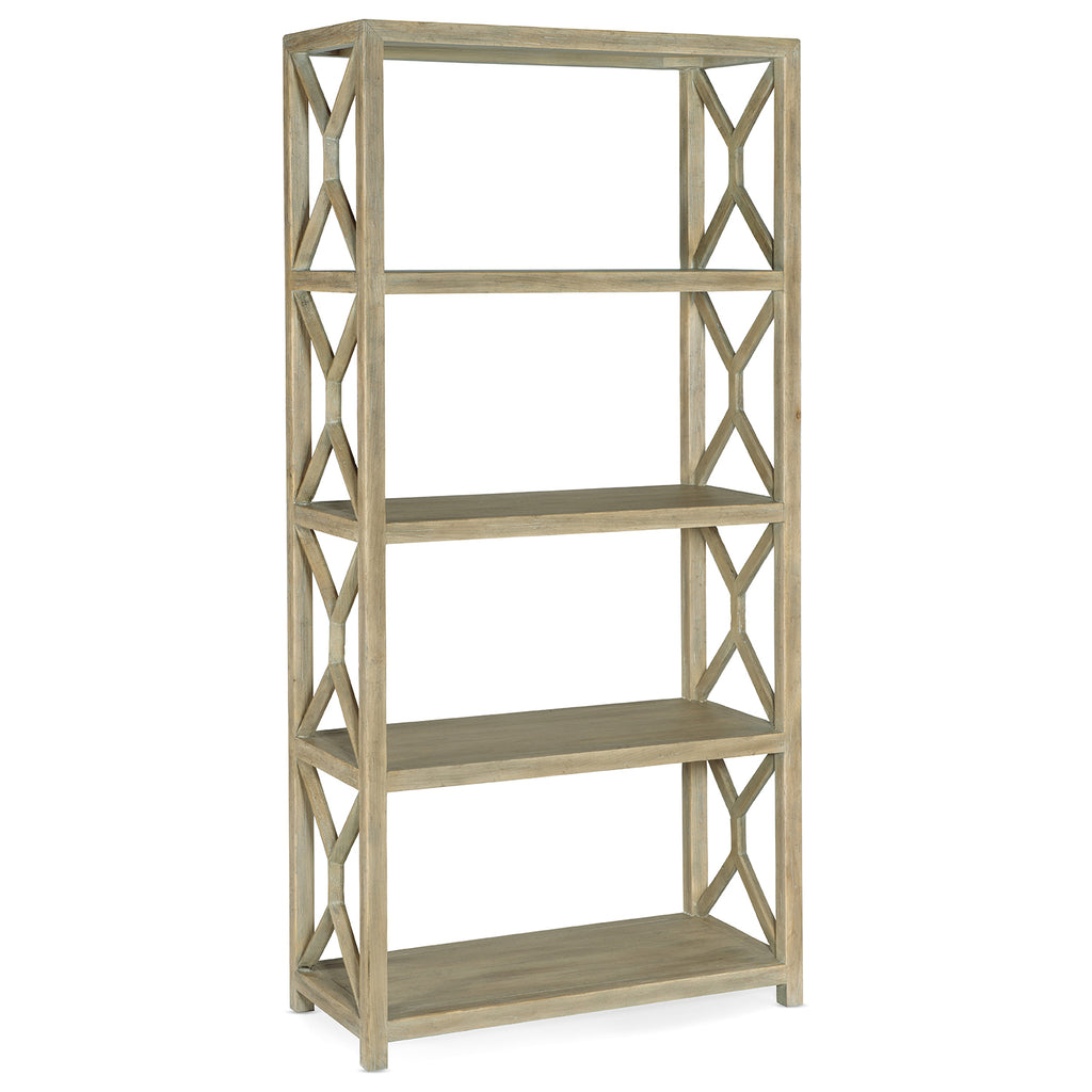 Create a resort-inspired retreat with the Surfrider Etagere, featuring a wood frame crafted of Pecan Veneers finished in the light natural Driftwood finish. The laid-back vibe of this California casual-inspired piece is enhanced by geometric fretwork on the sides of the four fixed shelves.