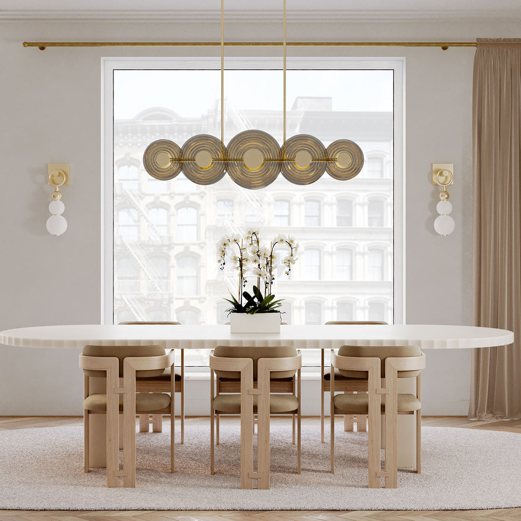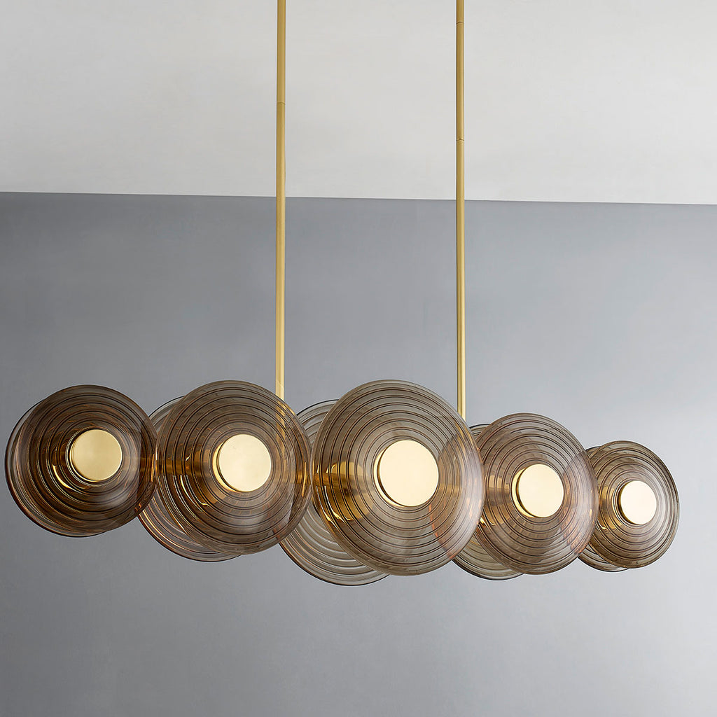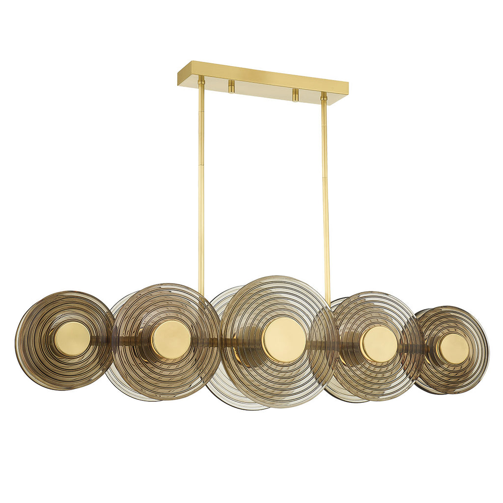 Renowned for built-to-last quality with a timeless feel, Hudson Valley offers a modern lighting collection with elegant touches, recalling vintage inspiration. The Hudson Valley Griston linear island light features discs of ribbed clear smoke glass capped in Aged Brass take cues from rippling waves to create the glamourous retro aesthetic of Griston. When lit, this vintage-inspired design casts a warm, golden glow, delivering just the right amount of sparkle.
