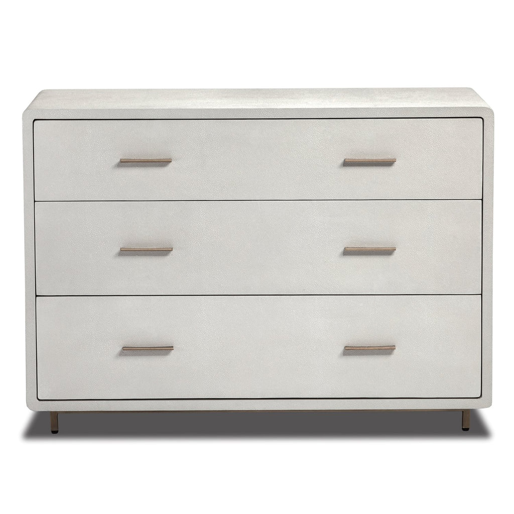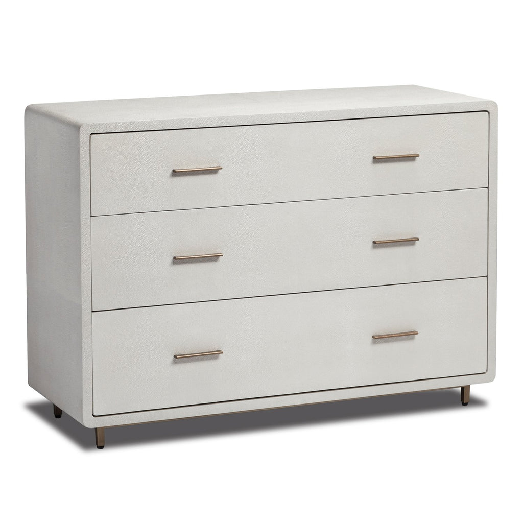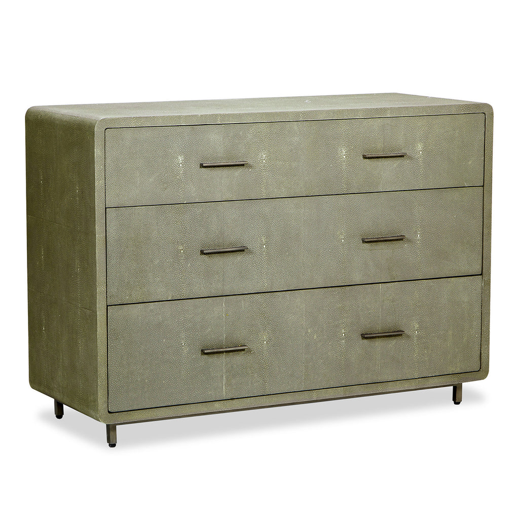 Interlude Home's worldly style brings what's now and next to the home with high fashion designed for everyday function. The Calypso three-drawer chest provides everyday function in a bedroom with alluring Art Deco-inspired vibes. A bone or olive shagreen surface lends dimensional depth to this unique furnishing. Clean, classic lines make this piece versatile for a variety of styles.