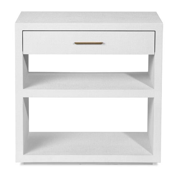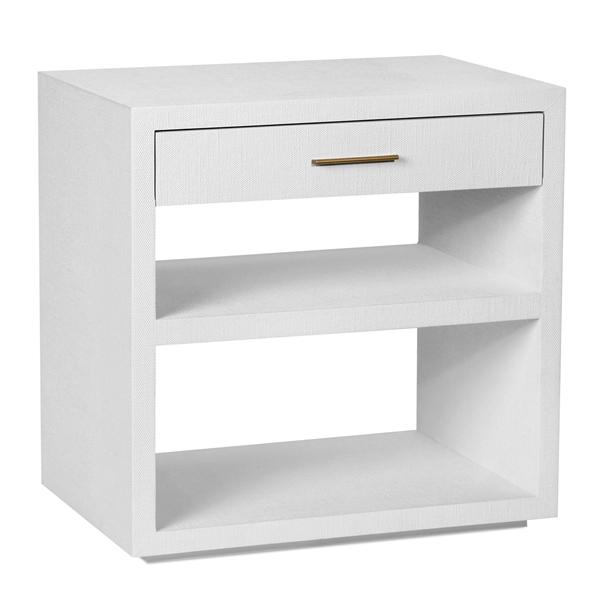 Interlude Home's worldly style brings what's now and next to the home with high fashion designed for everyday function. A practical bedside chest manages to retain its chic style when it's created from light gray hand cast faux linen and antique brass-finished metal.
