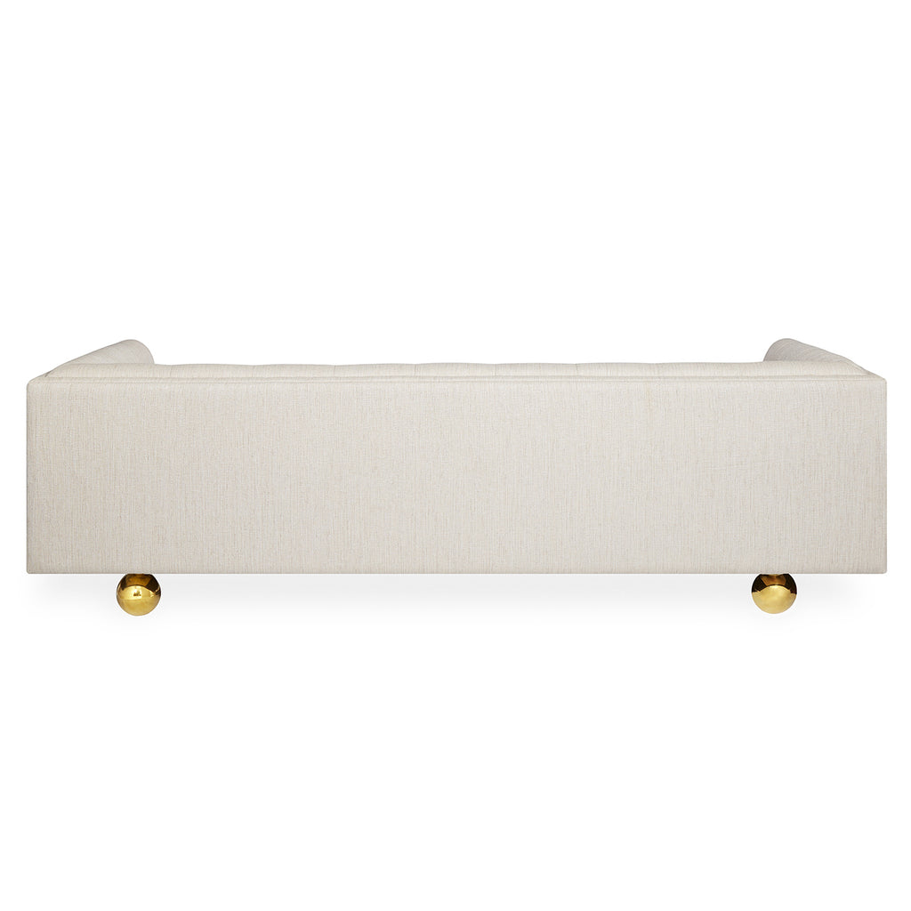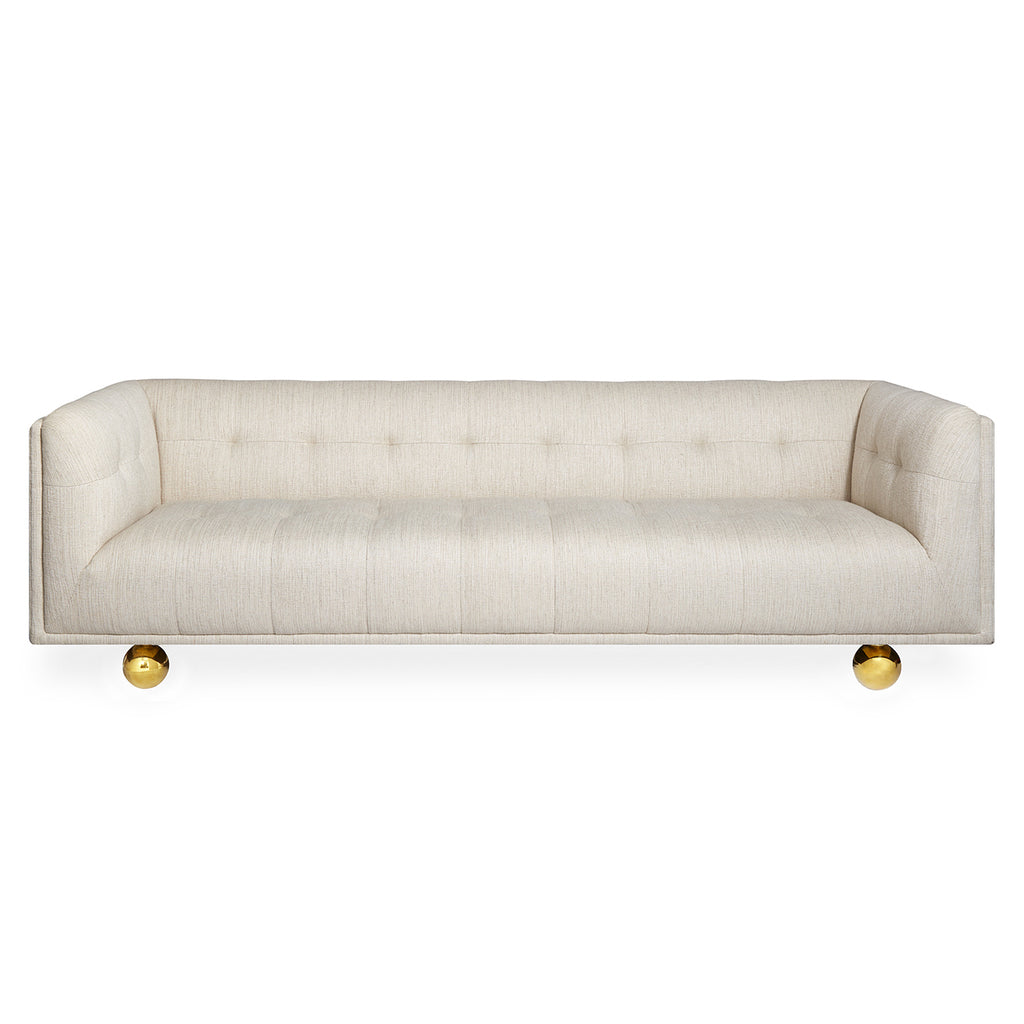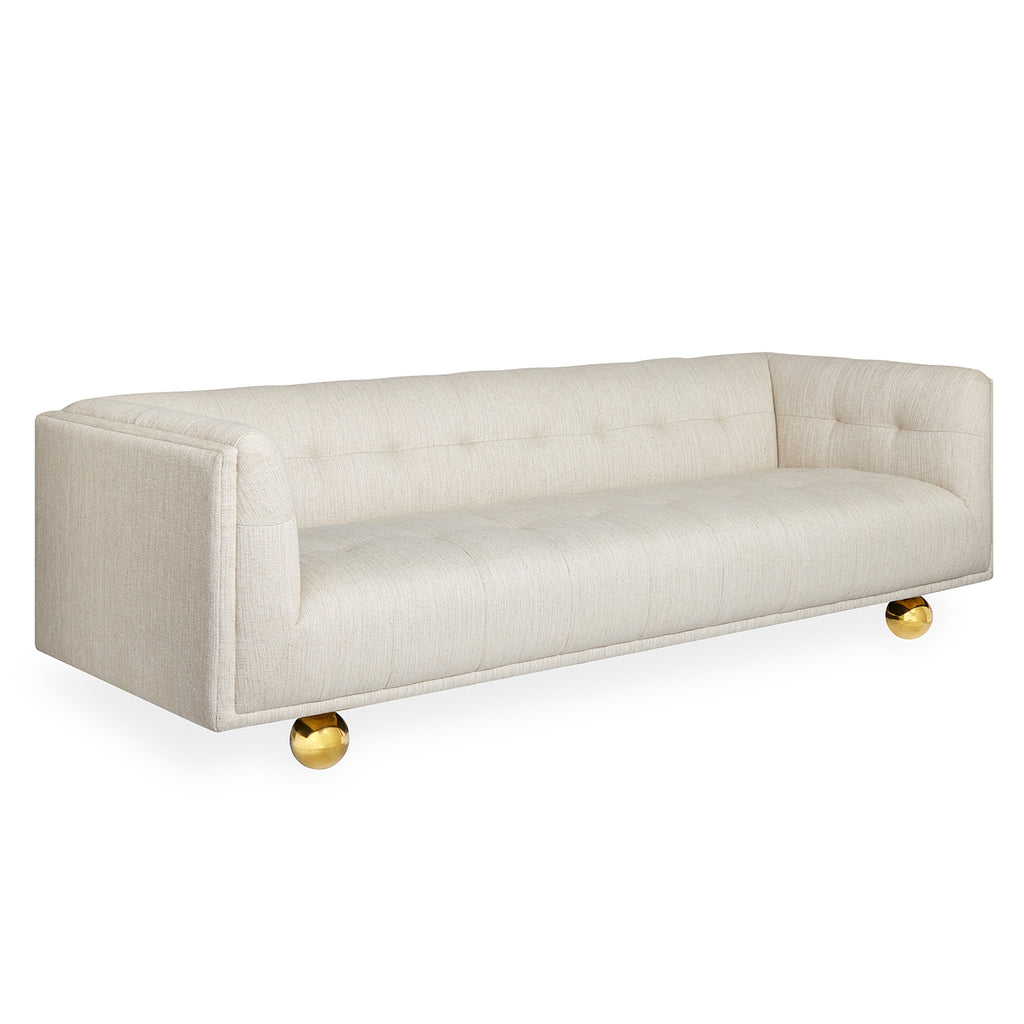 Jonathan Adler's spin on the classic Chesterfield. They took the original profile, clubby comfort, tailored tufting, and made it modern with a pared down silhouette. The finishing touch: oversized (and ultra-glam) brass orbs in place of traditional wooden bun feet. The perfect balance of formal and fresh, its loungey depth and neutral colorways makes it a must-have for any abode.