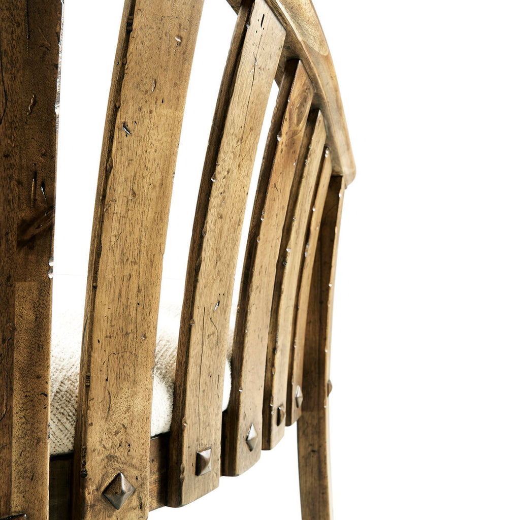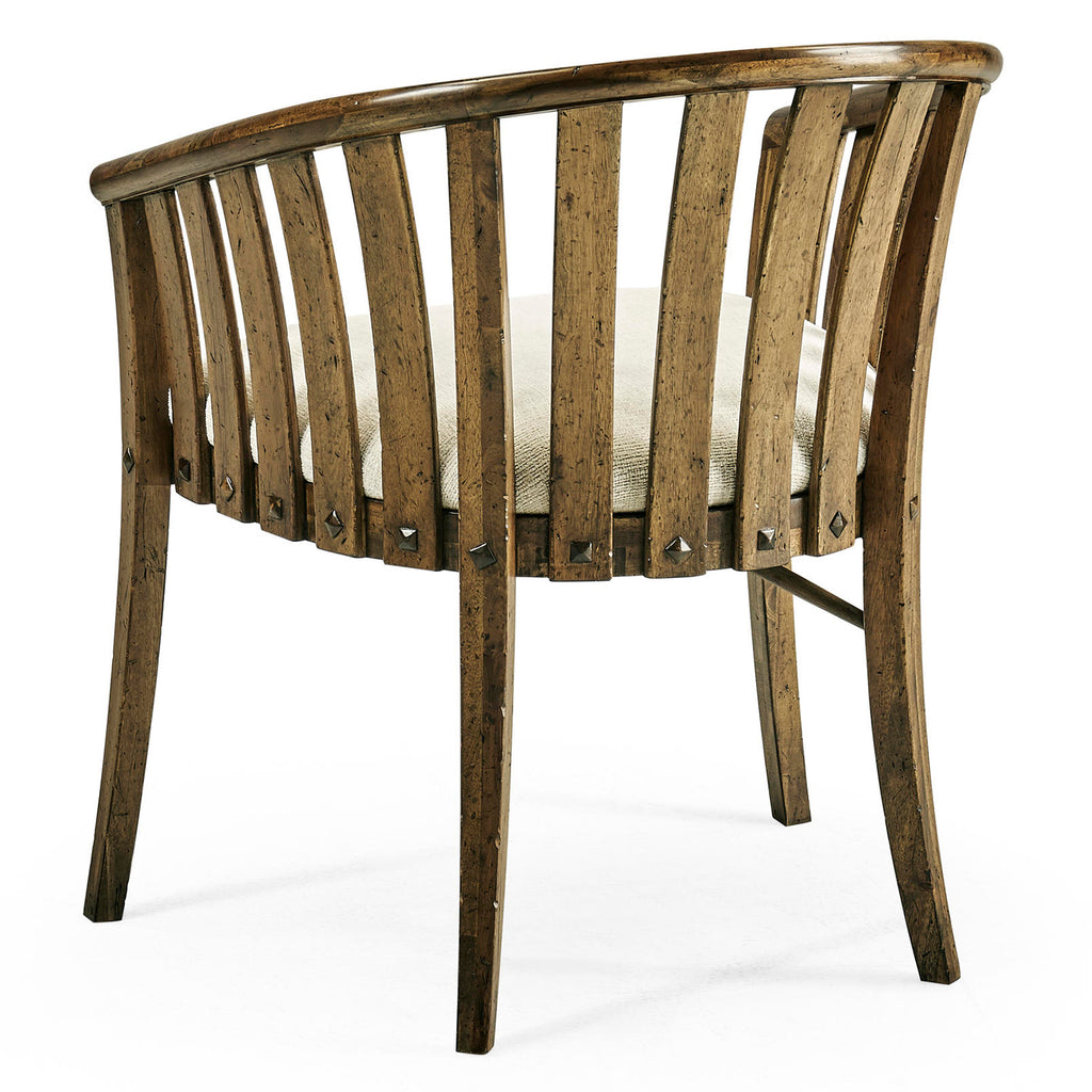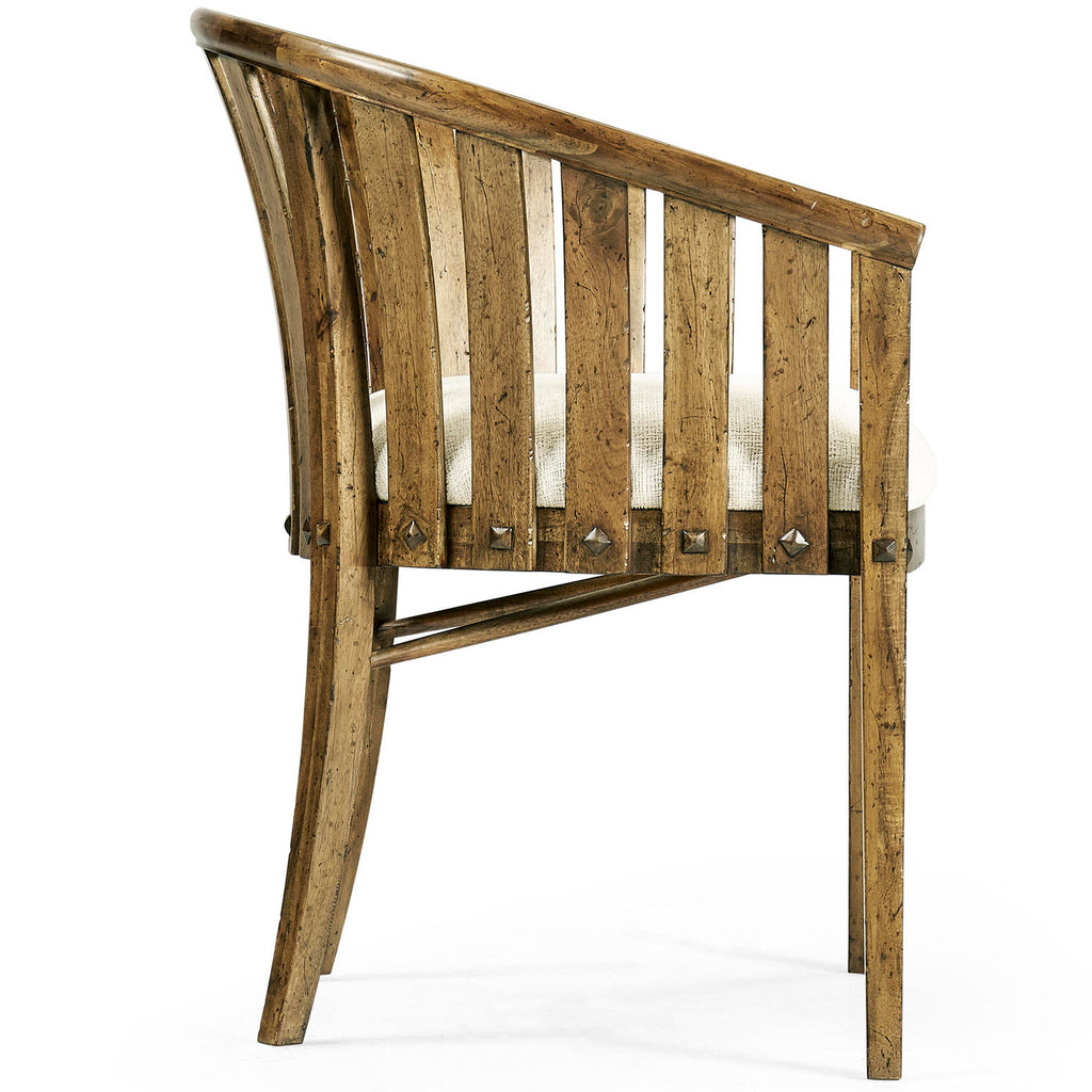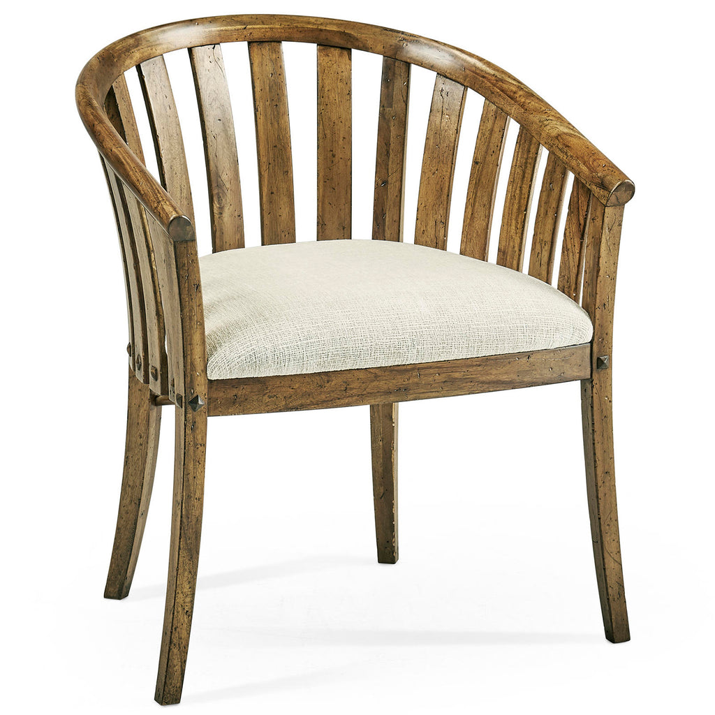Country style medium driftwood distressed finish tub arm chair, the splats to the rear with exposed tenon joints to the base. Upholstered seat in Shambala.