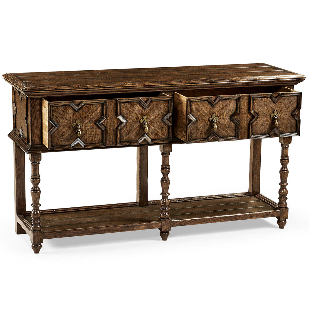 Tudor style heavily distressed dark oak sideboard with two drawers, with quatrefoil paneled decoration, patinated brass drop handles and a long running under-tier.