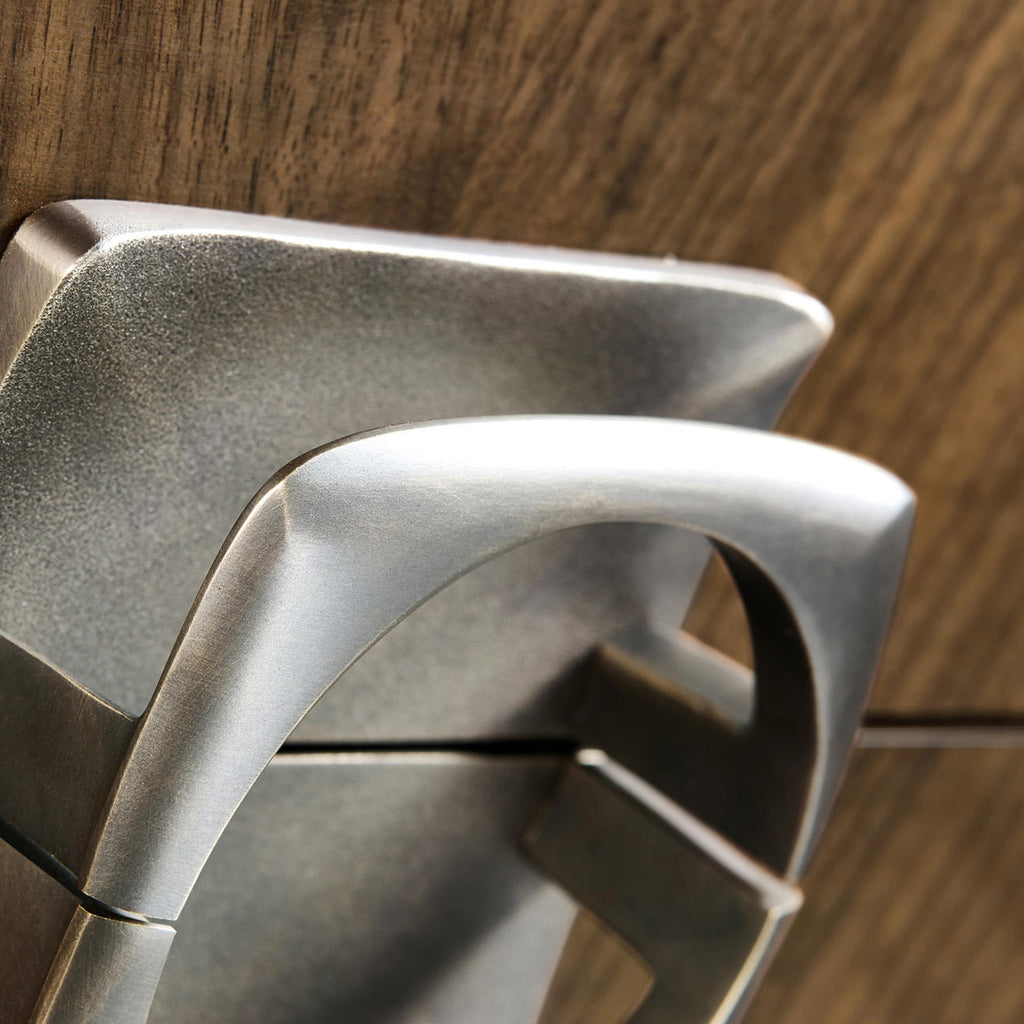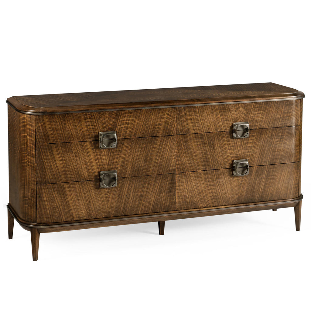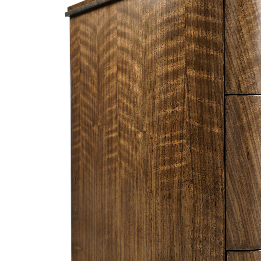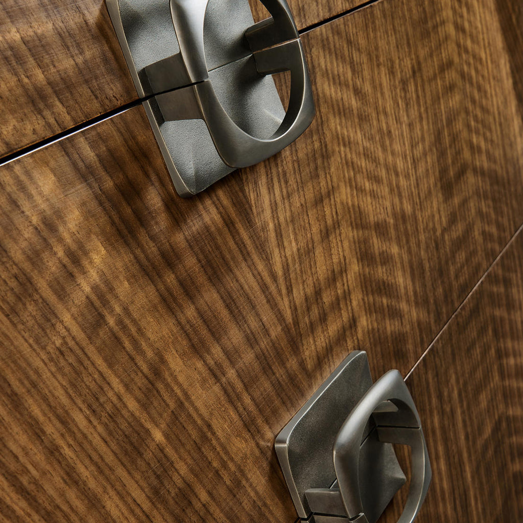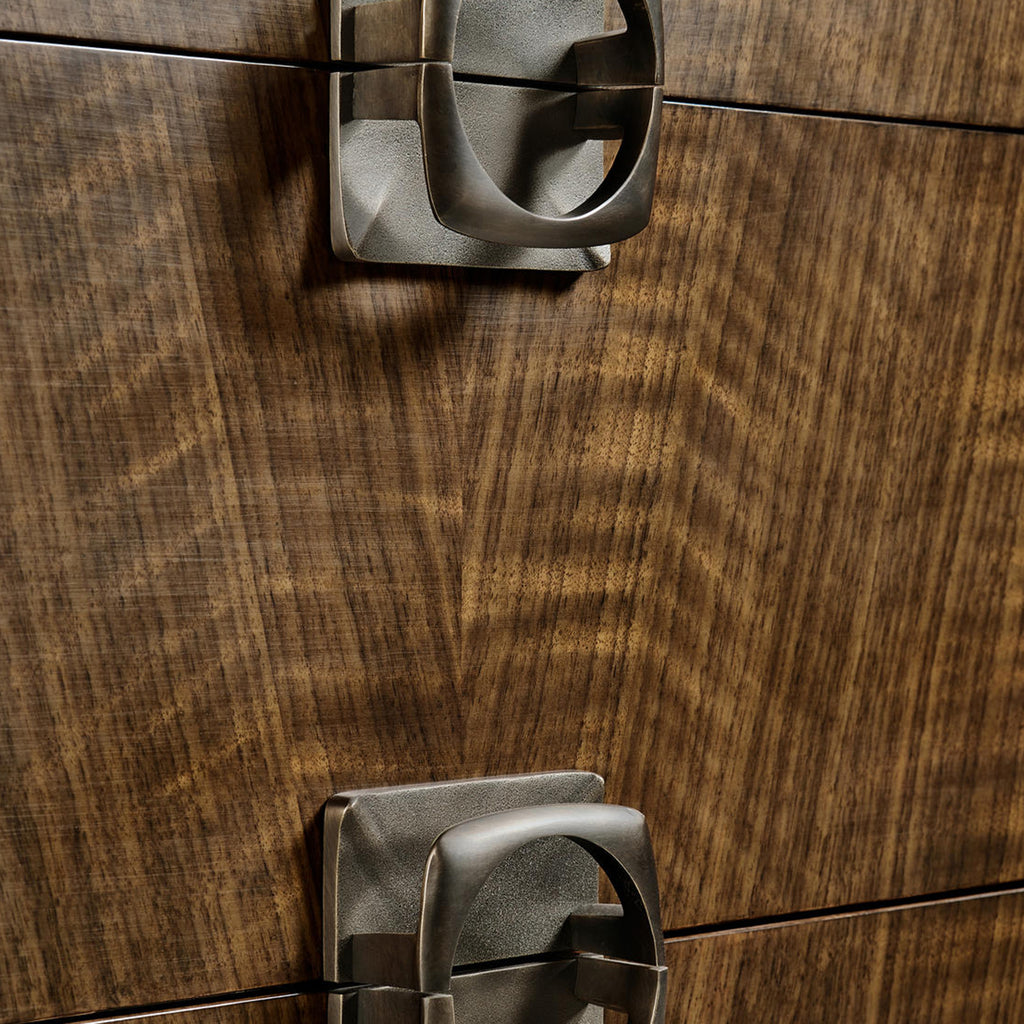 Informed by French Modernism, this cabinet is constructed of walnut with a transparent lacquer finish. Top features walnut veneer in a pattern reminiscent of straw work. Hardware is cast in the Jonathan Charles foundry where it is acid dipped and hand rubbed to achieve a rich, natural patina.