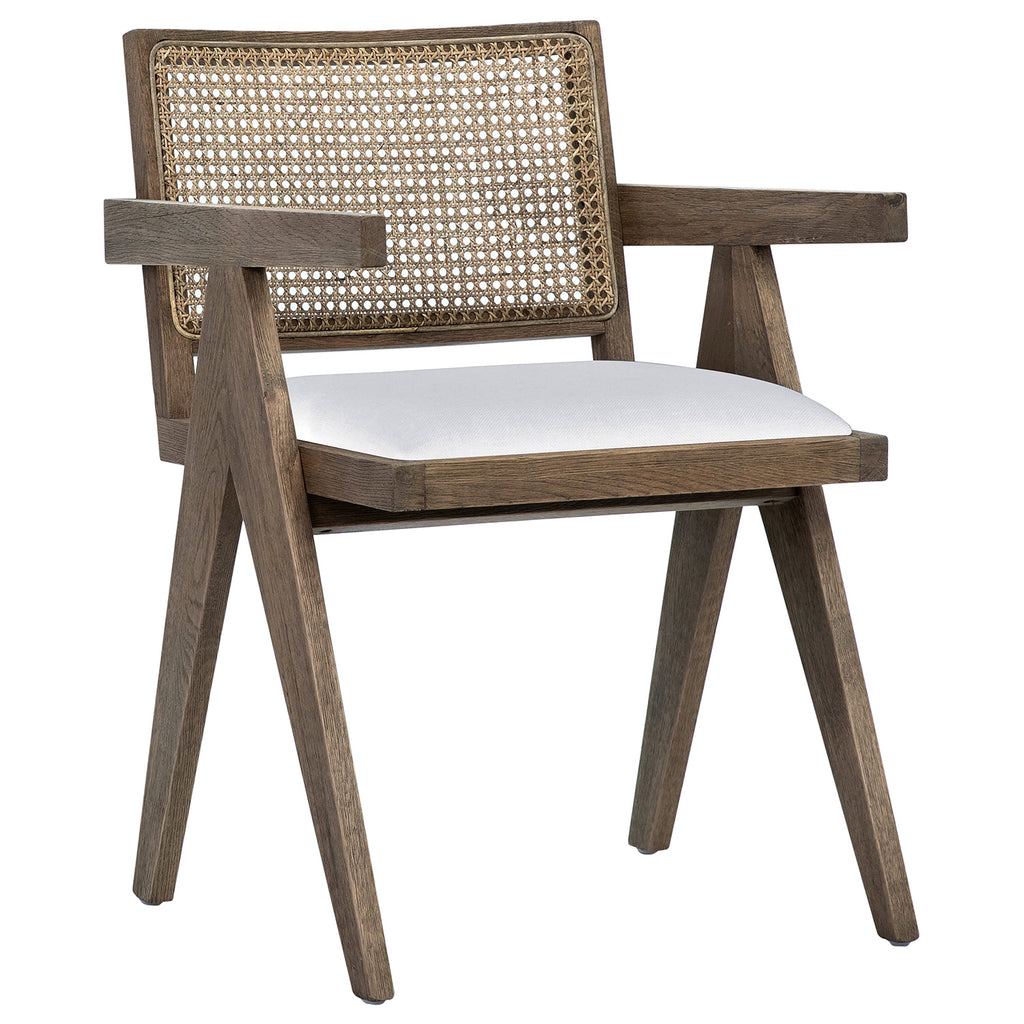 Finished with natural rattan, this beautiful arm chair is modern with a tropical flare. Made of solid Oak Hardwood and Rattan, this two-toned chair is the perfect accent to any room or dining table.