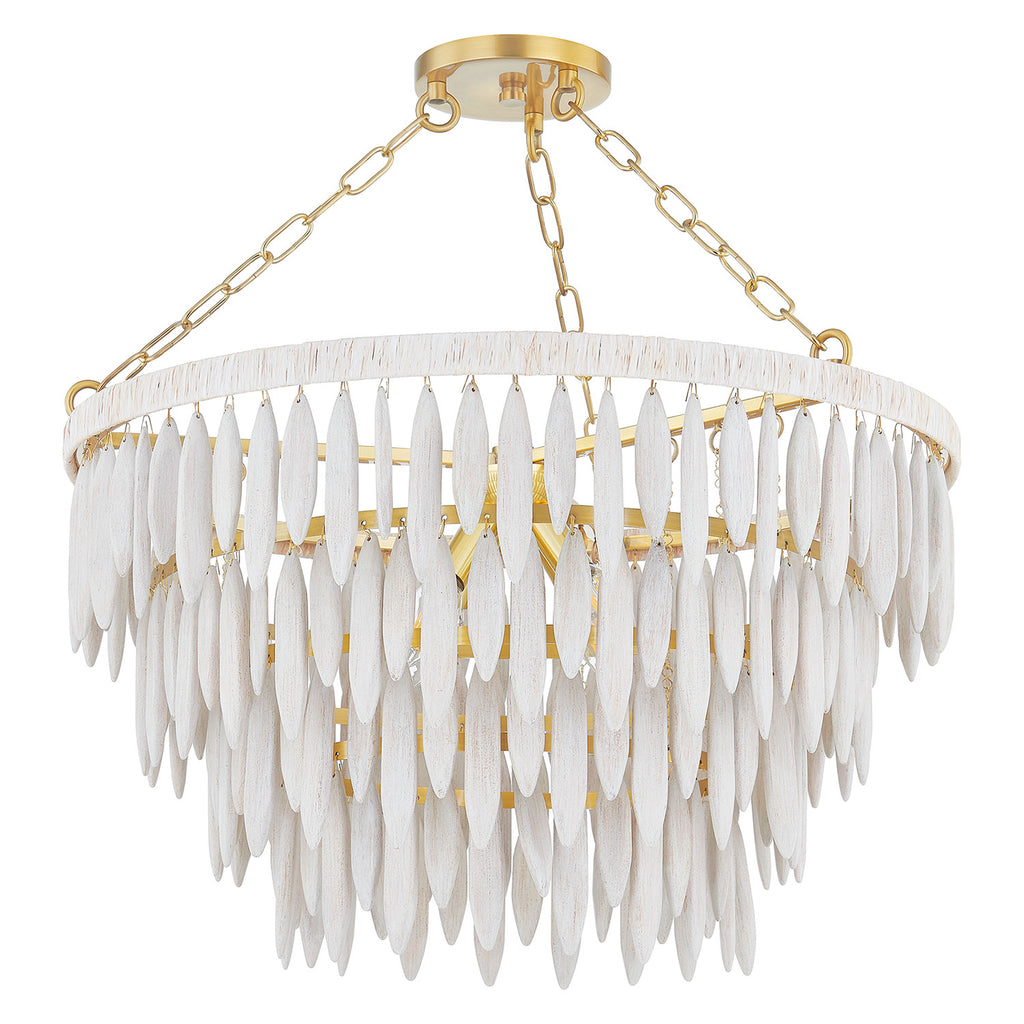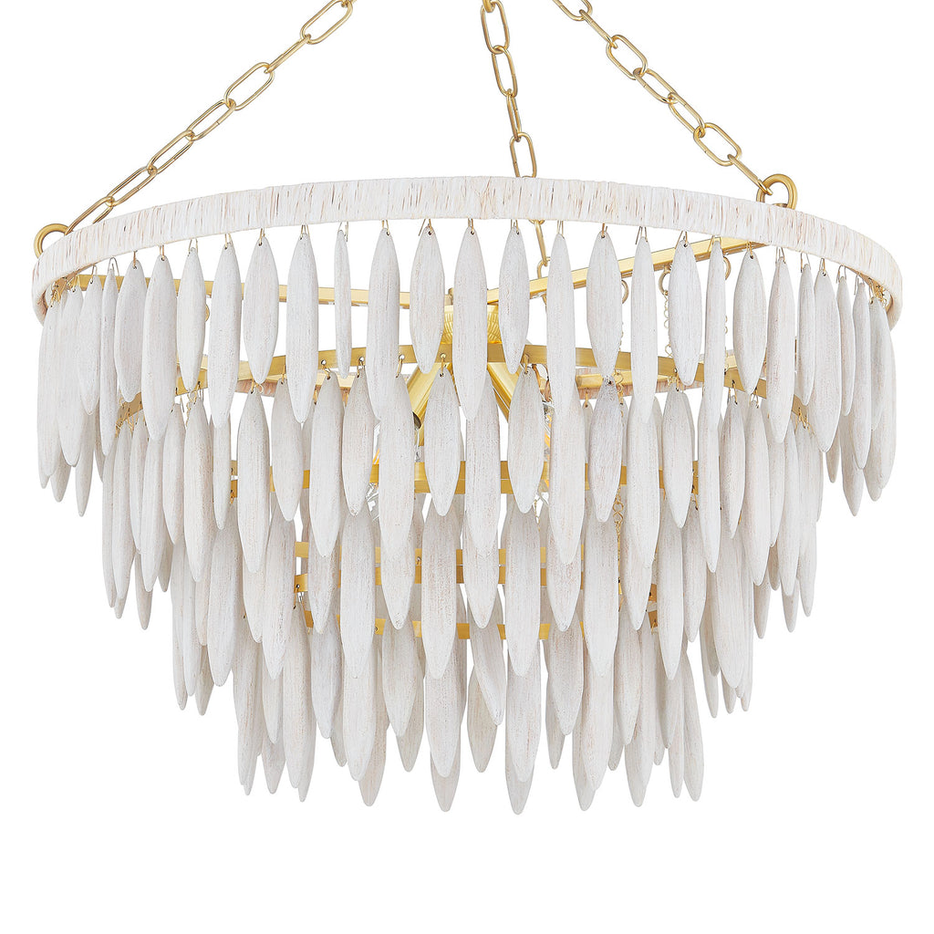 High-quality and exceedingly creative, Mitzi delivers a semi-nostalgic classic lighting collection with streamlined contemporary elements that instantly upgrade your space. Discover the statement light fixture your entryway or dining room is missing with a chandelier by Mitzi, delivering contemporary classic style within reach. This elevated organic design blends soft natural elements with an elegant, sculptural form. A series of elongated white-washed wood beads are arrayed in tiers around an Aged Brass framework. The top ring of the frame is wrapped in white raffia adding to the clean, fresh feel. The neutral tone makes it the perfect way to add an organic, coastal vibe to a space. Available as a semi-flush, pendant, and chandelier.
