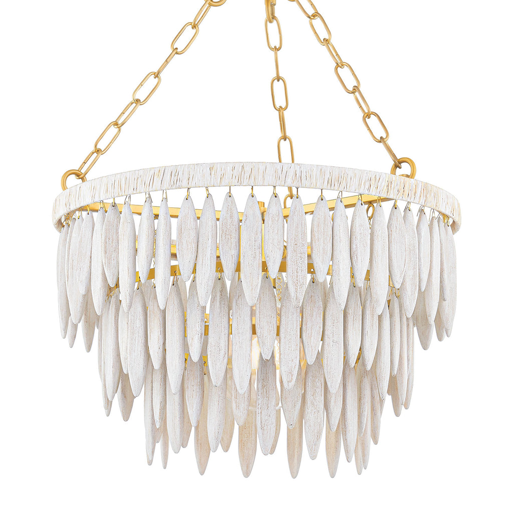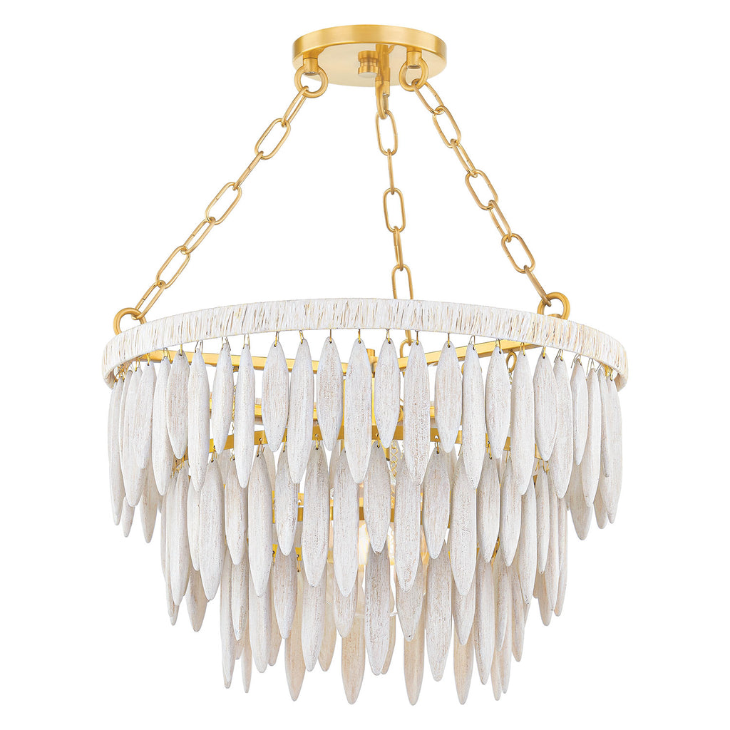 High-quality and exceedingly creative, Mitzi delivers a semi-nostalgic classic lighting collection with streamlined contemporary elements that instantly upgrade your space. Suspended from the ceiling, pendant lighting by Mitzi offers extra light expression exactly where you need it with a functional high-design feel. This elevated organic design blends soft natural elements with an elegant, sculptural form. A series of elongated white-washed wood beads are arrayed in tiers around an Aged Brass framework. The top ring of the frame is wrapped in white raffia adding to the clean, fresh feel. The neutral tone makes it the perfect way to add an organic, coastal vibe to a space. Available as a semi-flush, pendant, and chandelier.