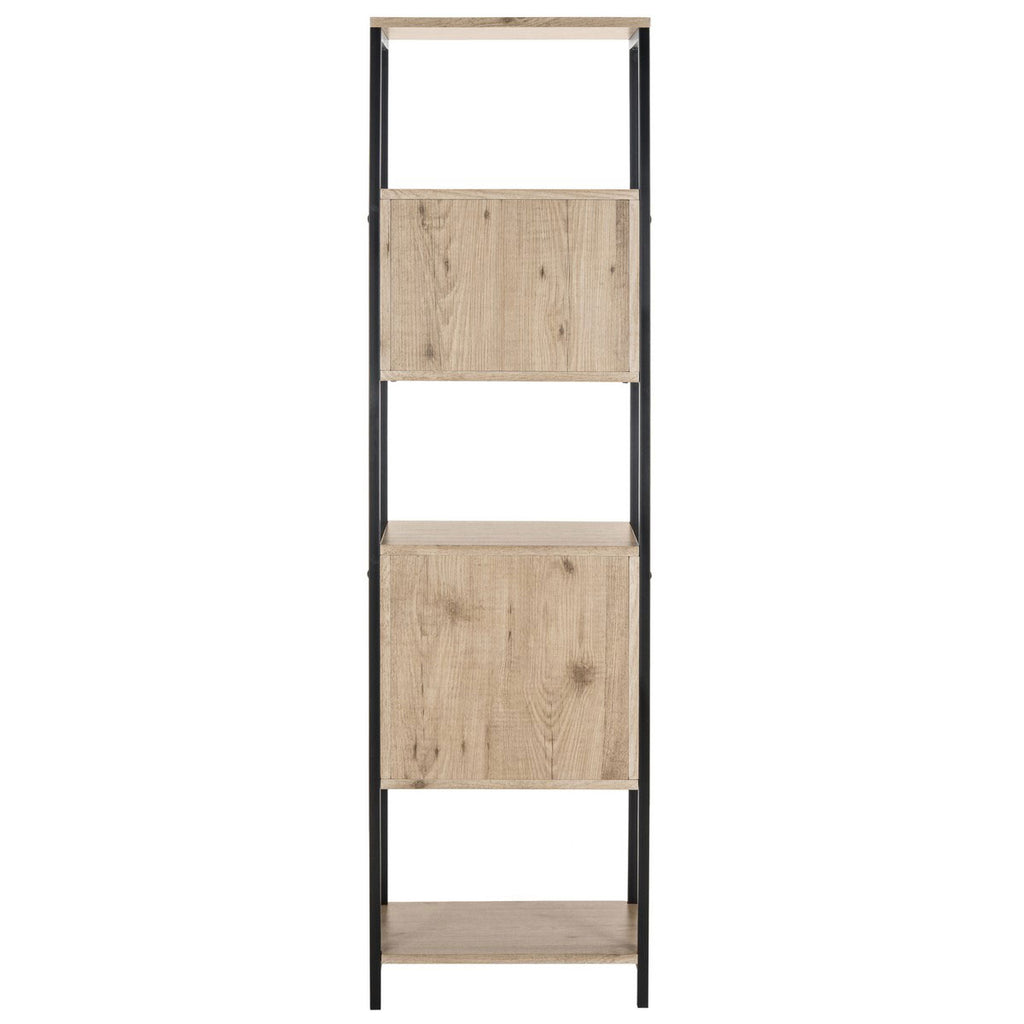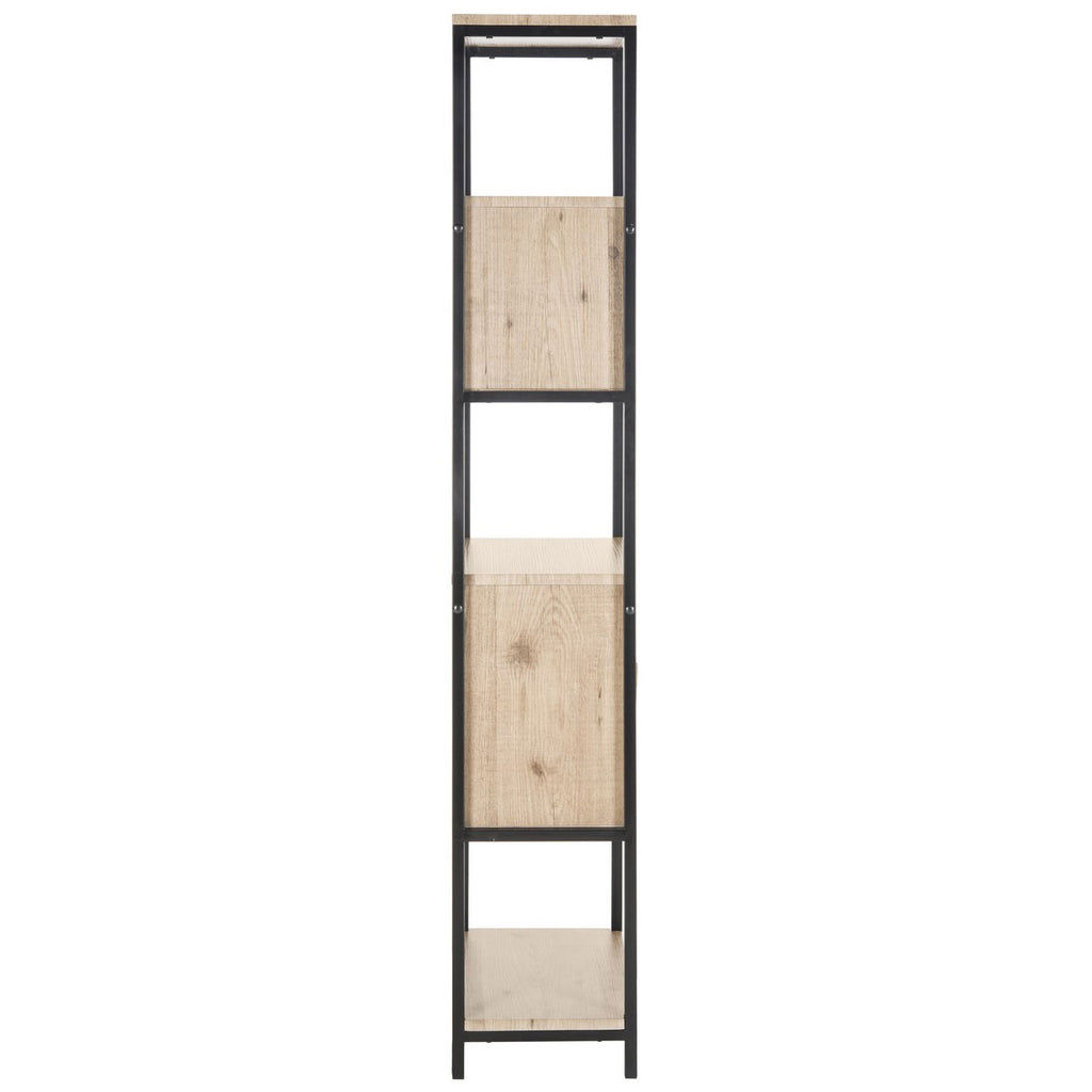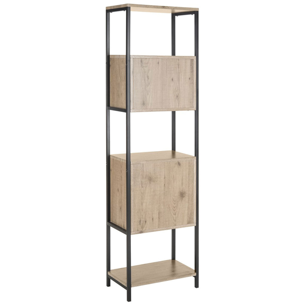 Elegant and statuesque, this mid-century étagère brings a retro blend of sleek drawers and open storage to the living room or study. Designed with black iron and a natural oak finish, designers also use it in the dining room for easy storage and display.