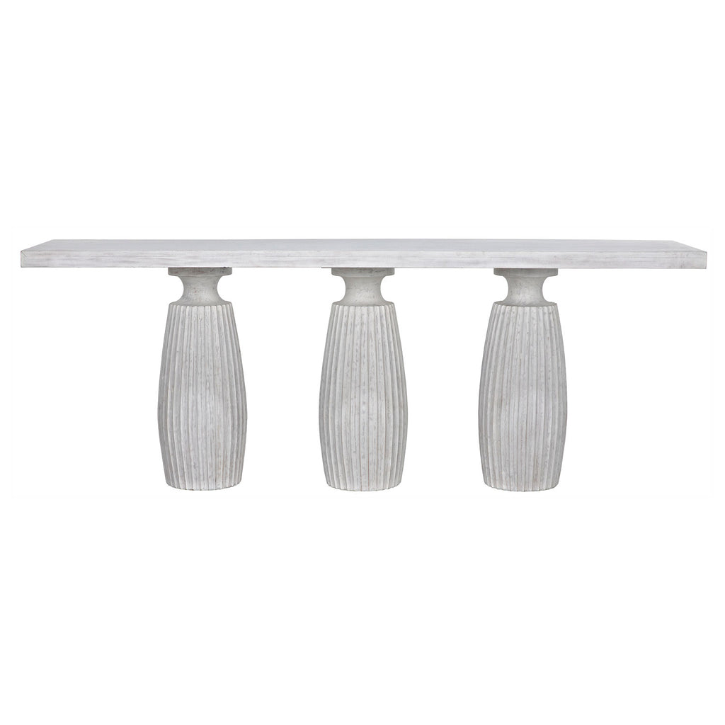 An excellent addition to a foyer or hallway, this Noir console table delights with contemporary flair. Simple yet chic, this functional furnishing adds dimensional depth to any space. The strength and grace of this classic fluted pillar design is featured on a three legged Noir Evelyn conse that would be at home in any style home. The White Wash finish combines white with a subtle reveal of the natural wood beneath to add texture and depth.