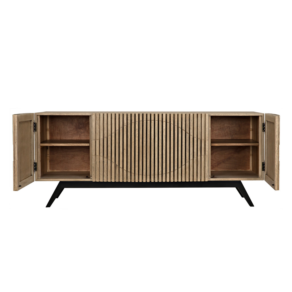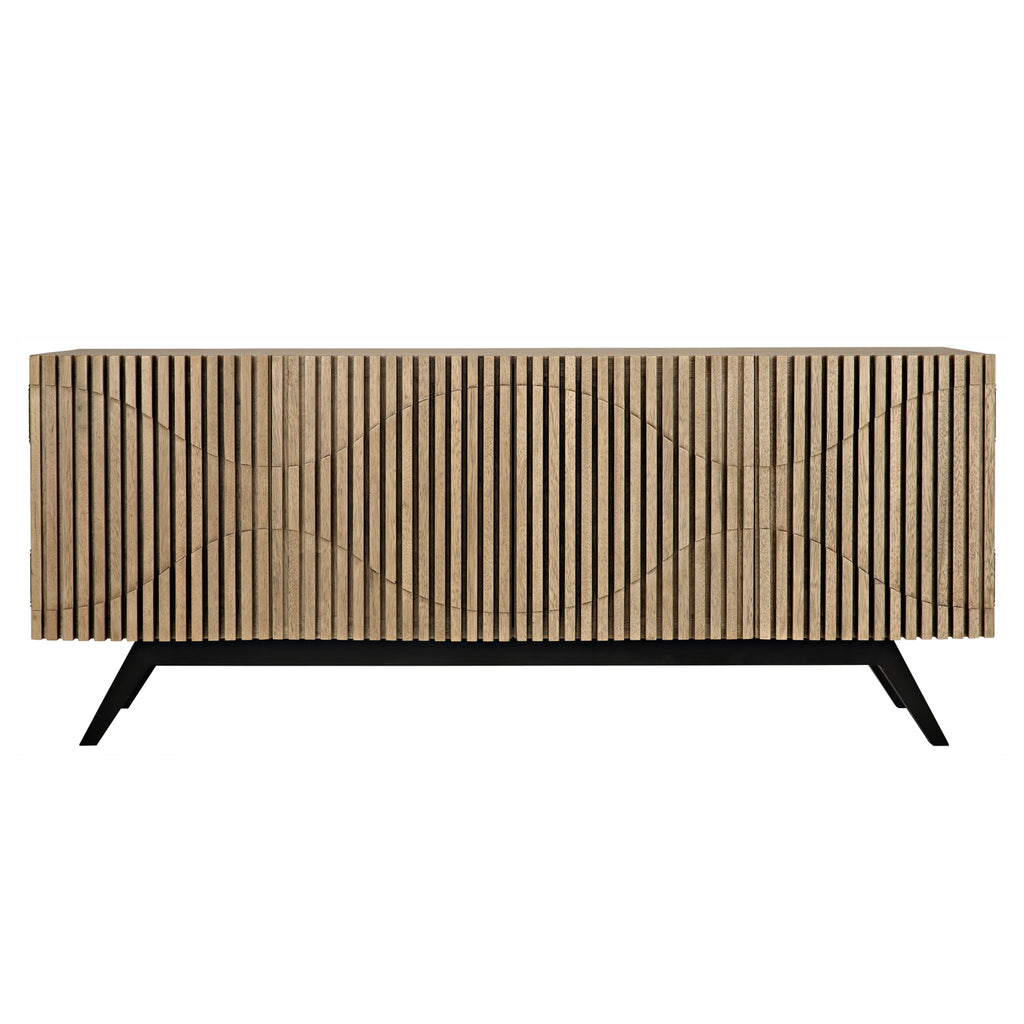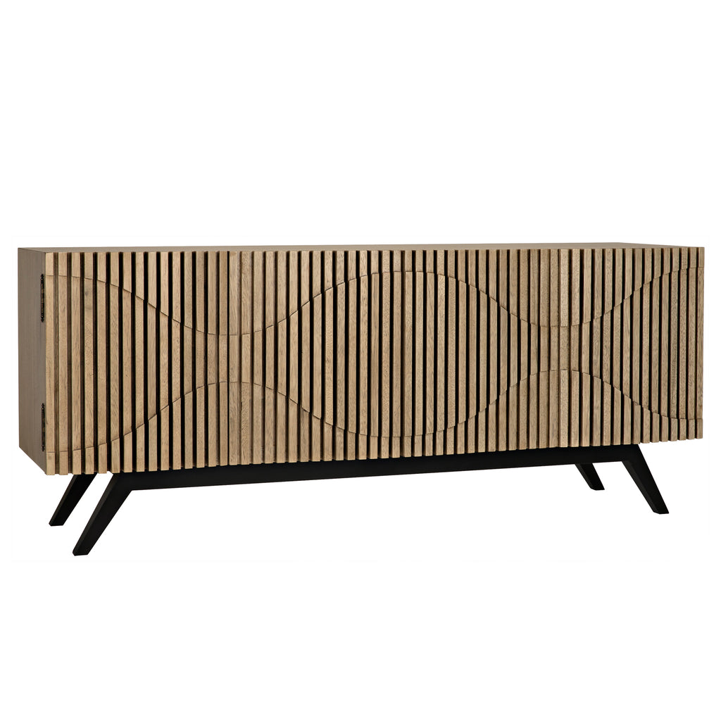 A sleek metal base supports a decoratively carved walnut Noir Illusion sideboard, with etched grooves that create an intriguing feeling of movement. Concealed doors open to reveal three generous cupboards for covert storage. The heirloom quality piece is available in two hand applied finishes.