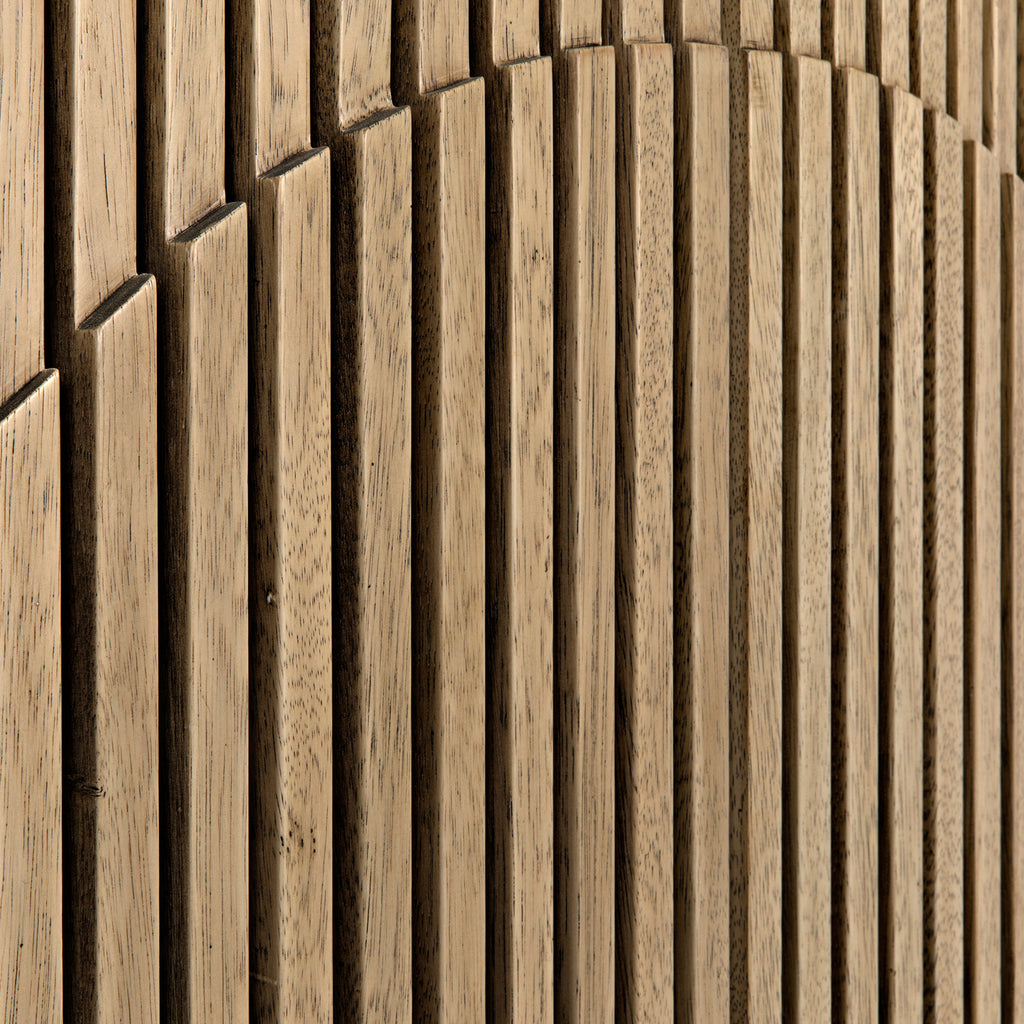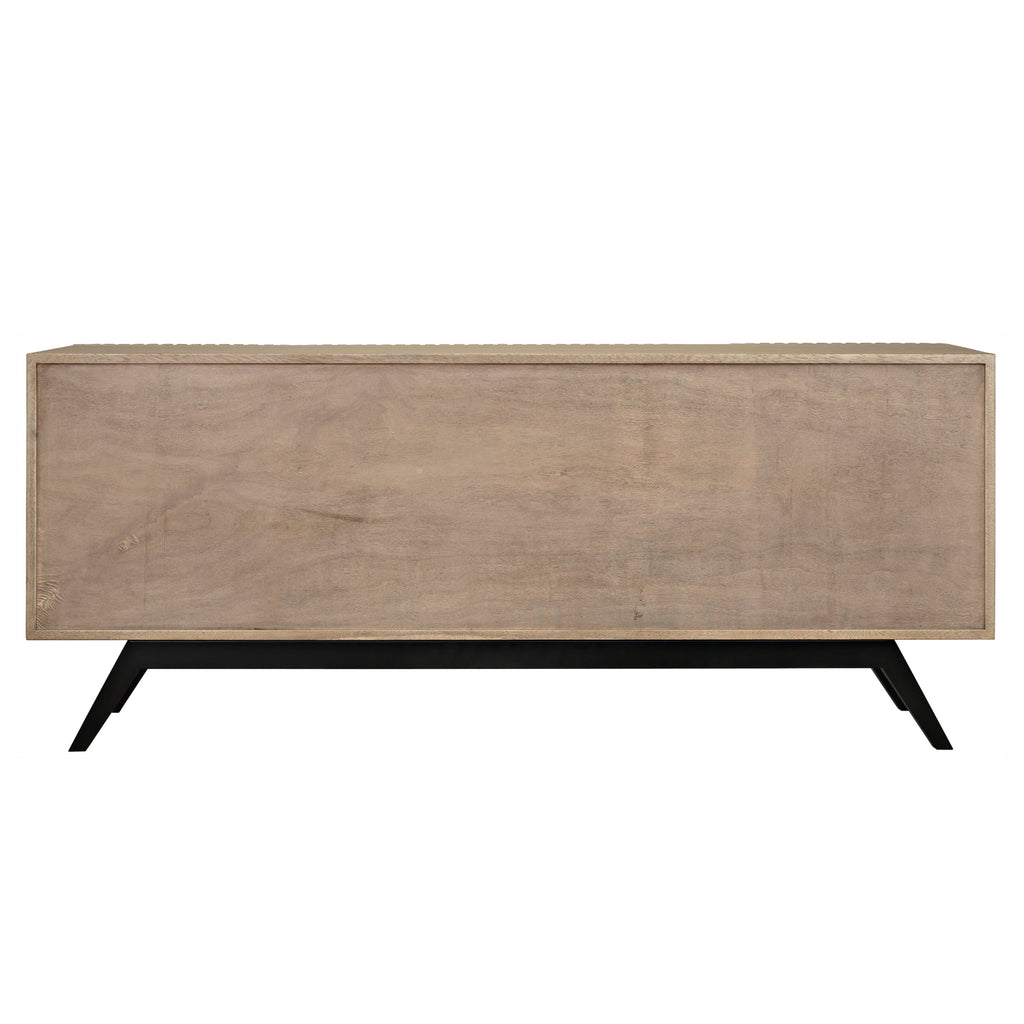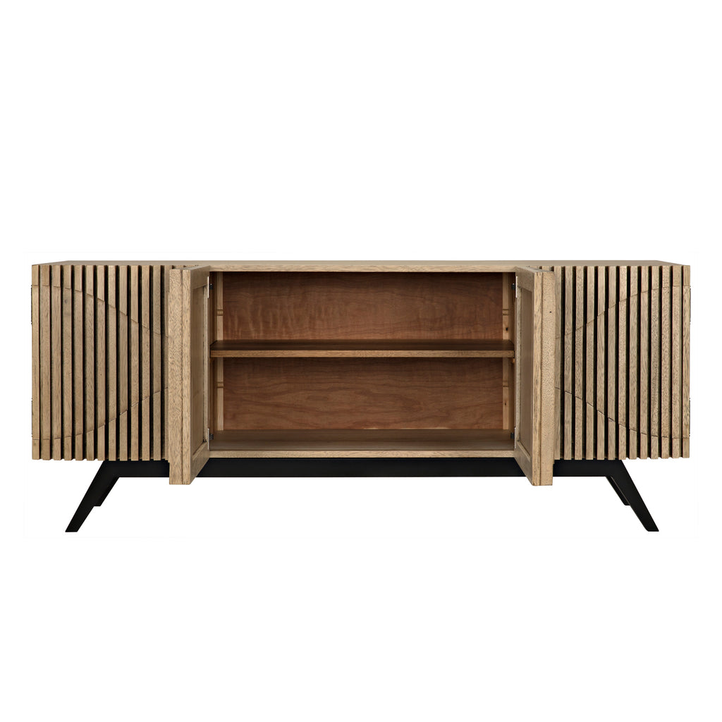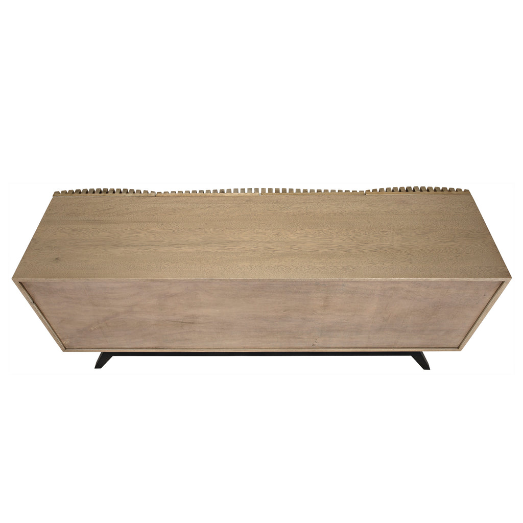 A sleek metal base supports a decoratively carved walnut Noir Illusion sideboard, with etched grooves that create an intriguing feeling of movement. Concealed doors open to reveal three generous cupboards for covert storage. The heirloom quality piece is available in two hand applied finishes.