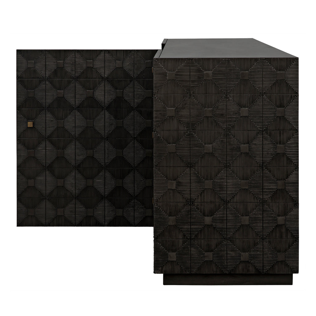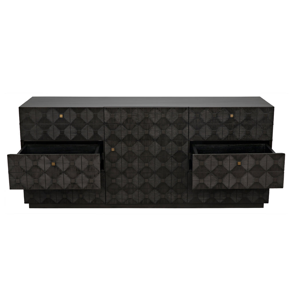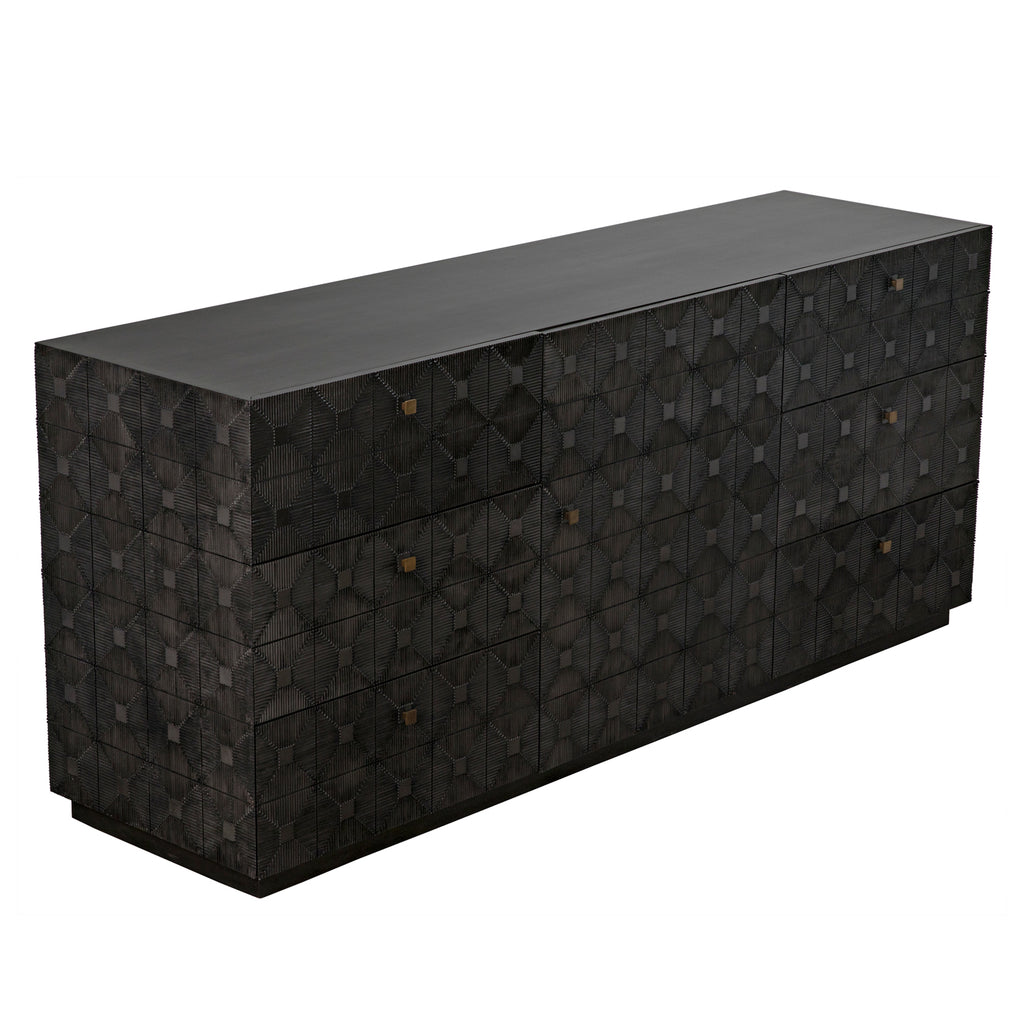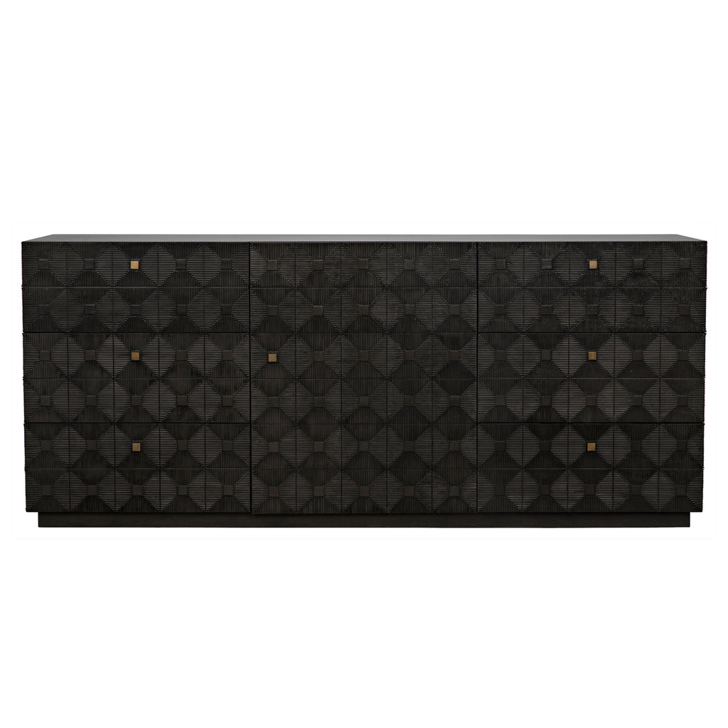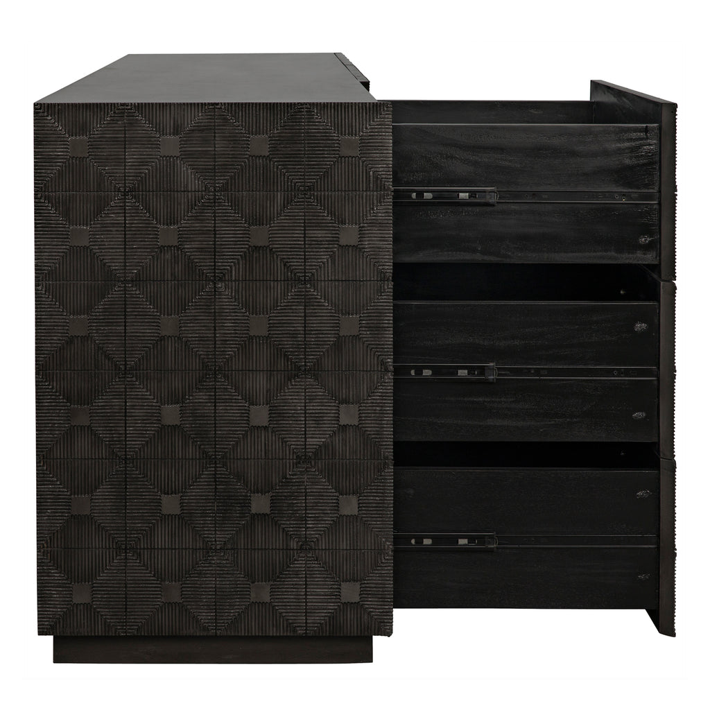 Carved of the most revered hardwood, mahogany, three sides of the Noir Leon dresser are adorned with decorative geometrical patterns. Its central cupboard opens to reveal three shelves, and is itself surrounded by six generous drawers.